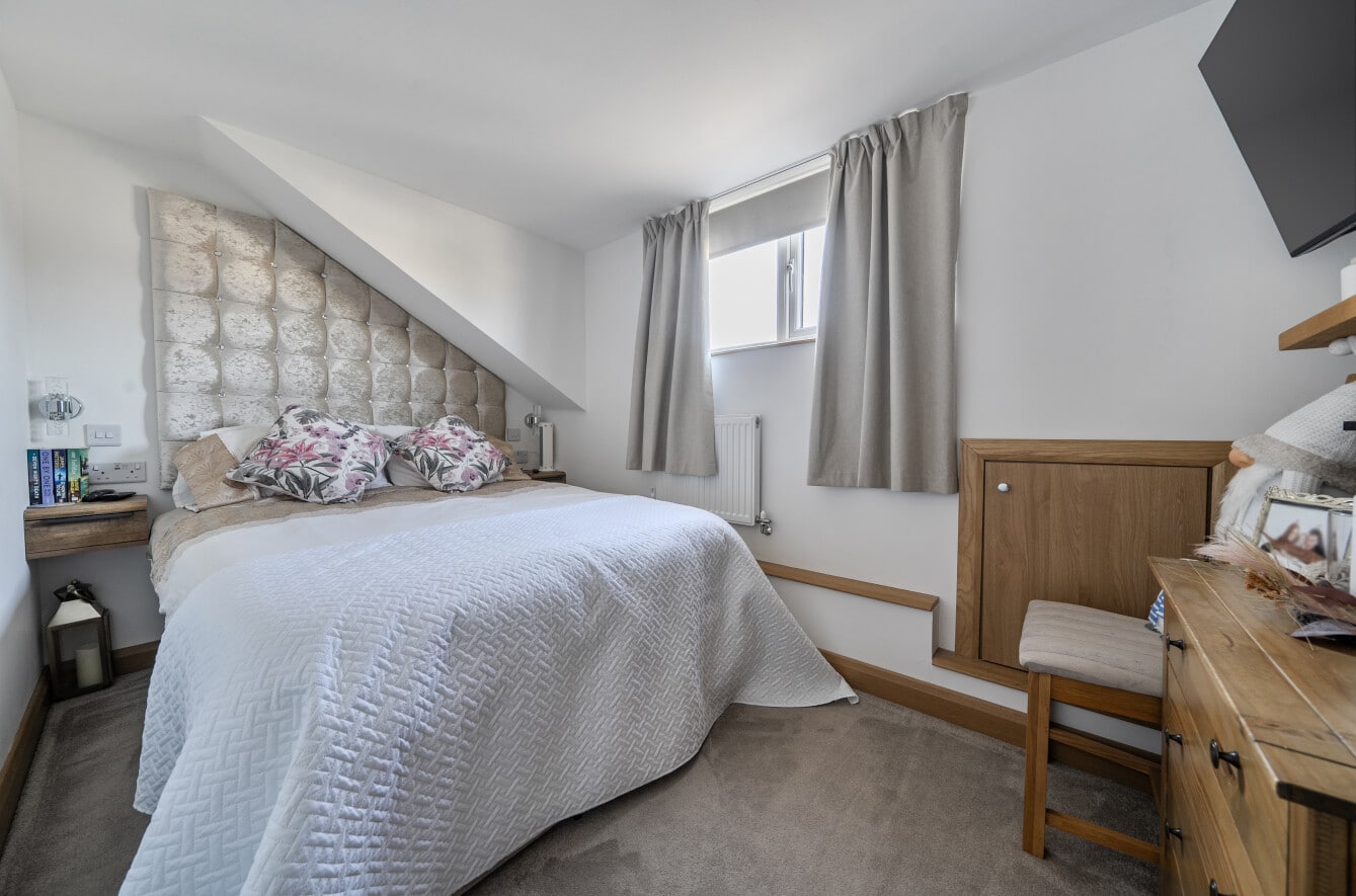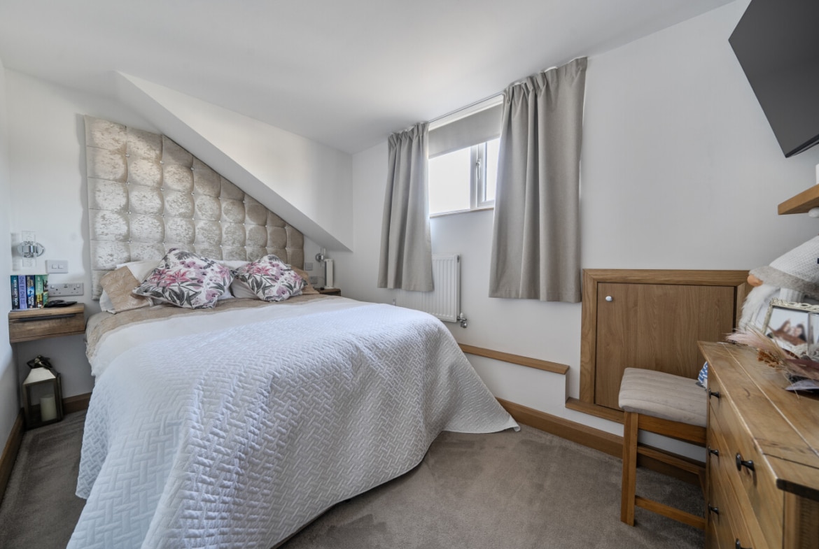 Upstairs, a further bedroom offers a private retreat, complemented by a stylish bathroom, creating an ideal principal or guest suite.