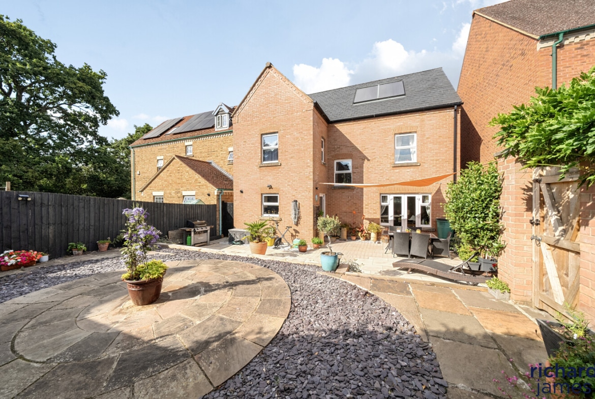 To the rear is an enclosed south facing rear garden with a patio seating and barbecue area, with further decorative patio areas with plumb slate chipping bordering, plus gated side access to the driveway and detached garage.