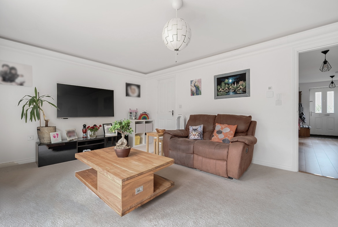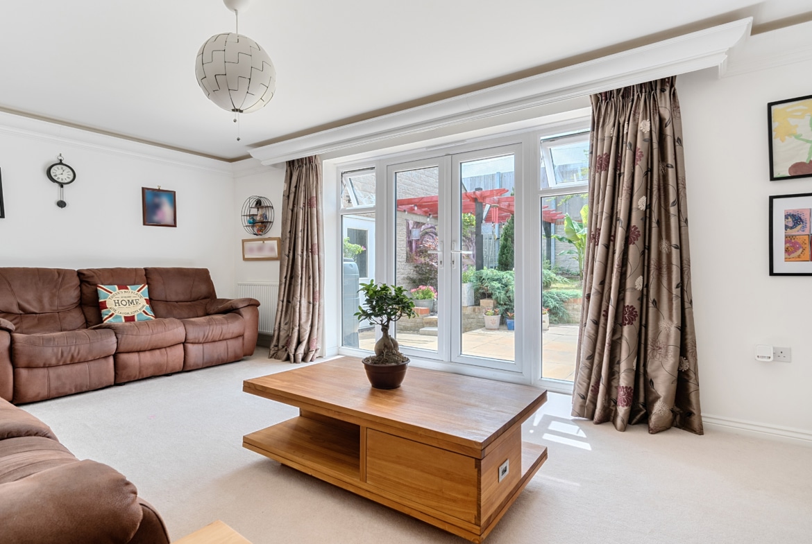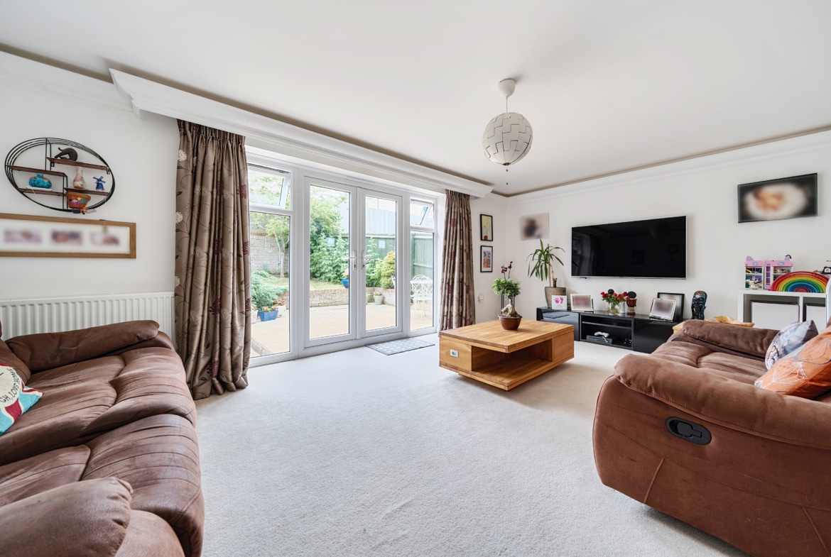 The sleek kitchen is equipped with high-quality appliances and offers good storage space. Patio doors lead out to a beautifully manicured rear garden, filling the room with natural light and creating a seamless transition between indoor and outdoor living.