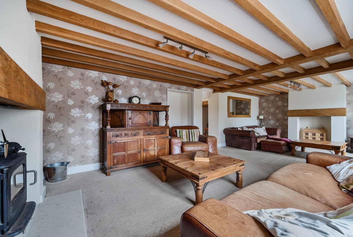 Upon entering, you’ll be greeted by a large entrance porch leading into a spacious double-fronted living room with exposed beams and a cosy log burner—the perfect spot to relax with family. This flows into a hallway with access to a large downstairs bathroom, featuring a modern bath, toilet, and basin.