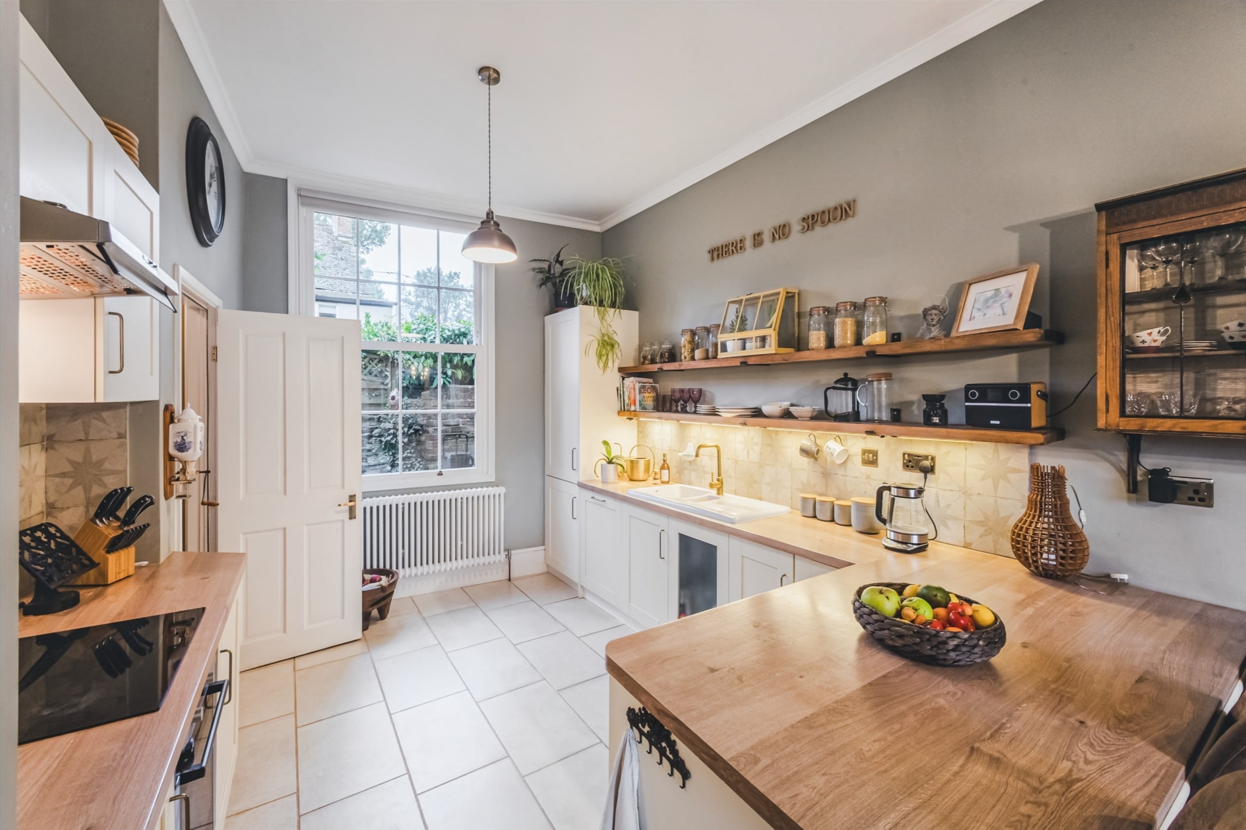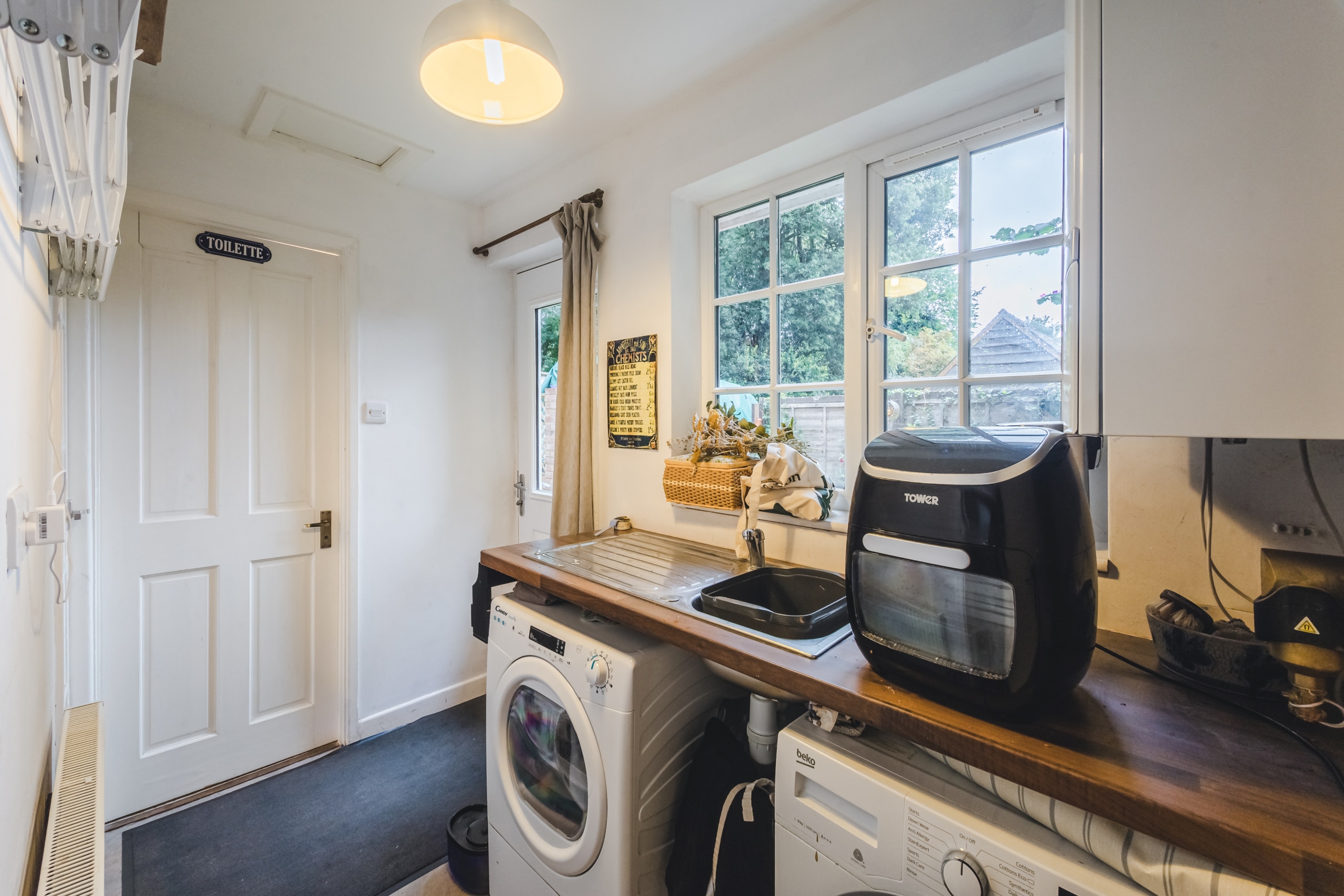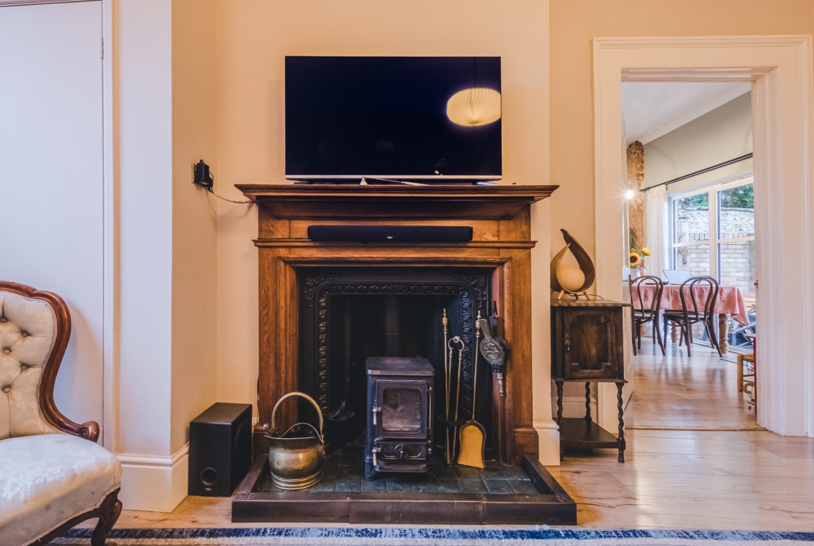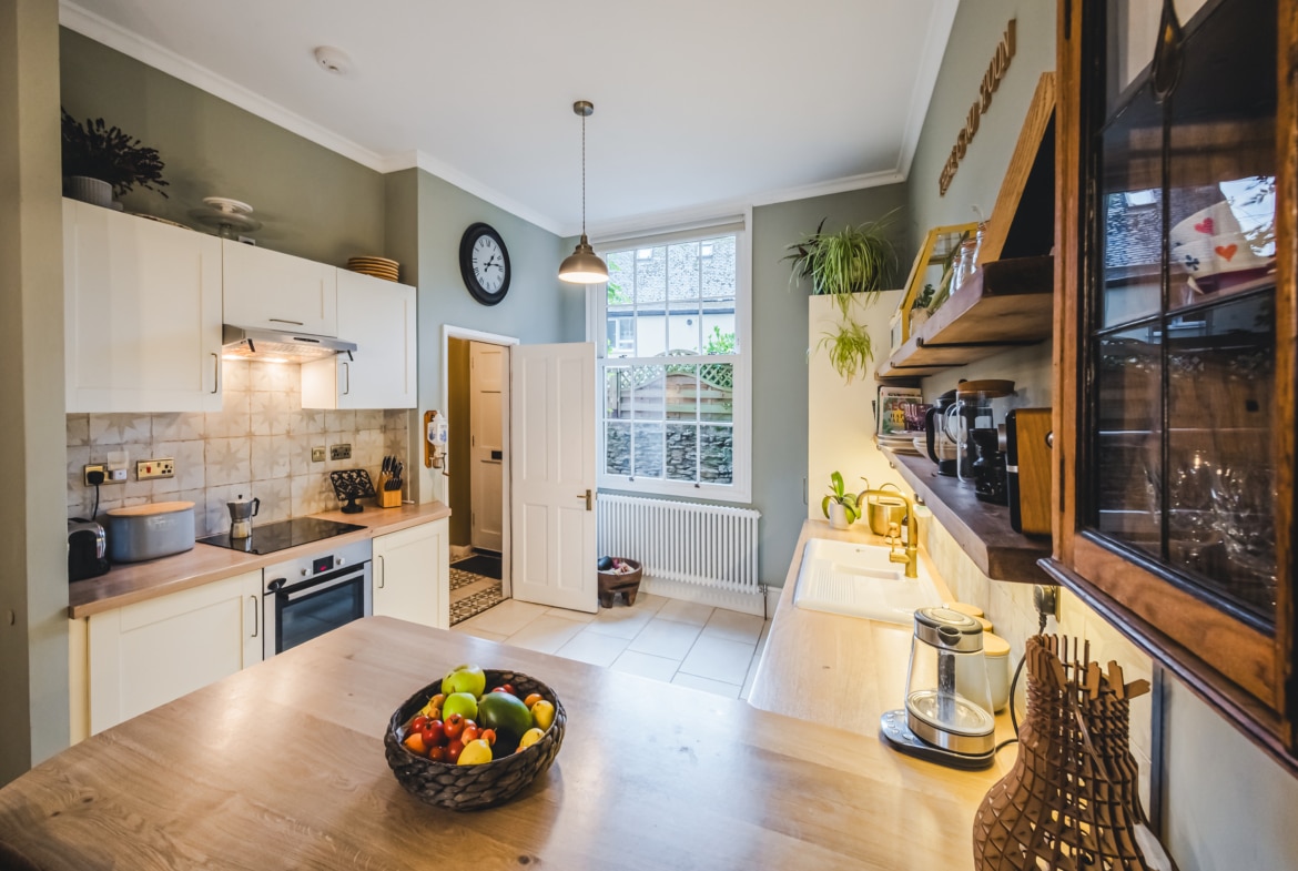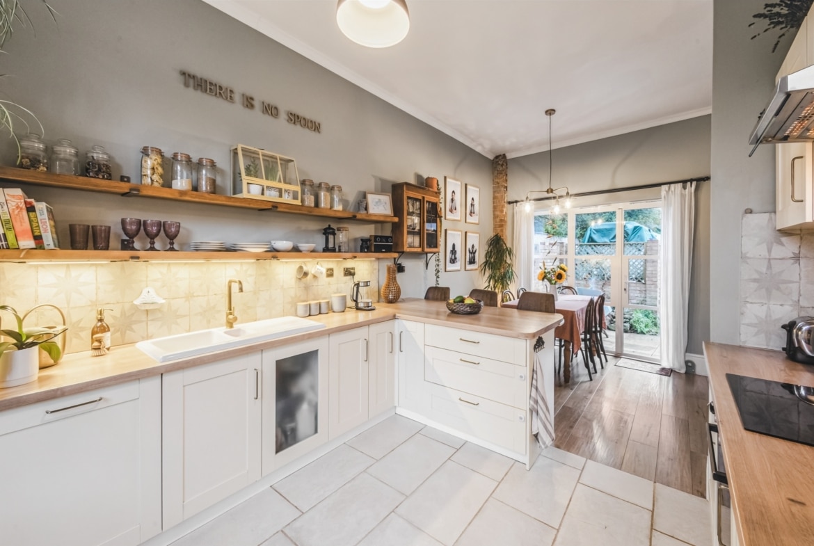 Step through the red front door into a welcoming hallway that flows straight ahead into the heart of the home—the stylish kitchen/dining room. Thoughtfully designed with bespoke cabinetry, warm timber worktops and open shelving, this sociable space is perfect for everyday living and entertaining, with French doors opening to the garden. A practical utility and cloakroom sit beyond, neatly arranged for modern convenience. The generous living room is accessed from the kitchen area, a bright, relaxed space anchored by a charming feature fireplace.