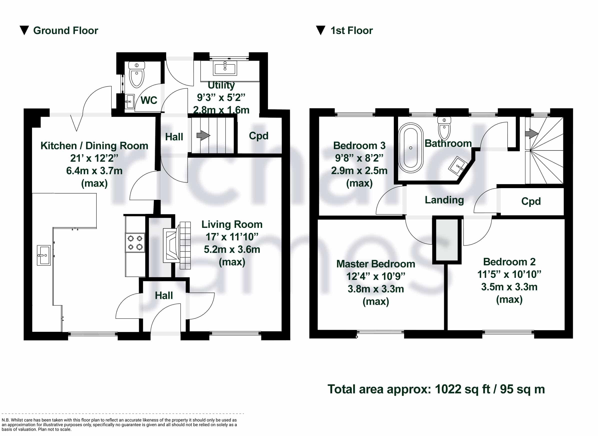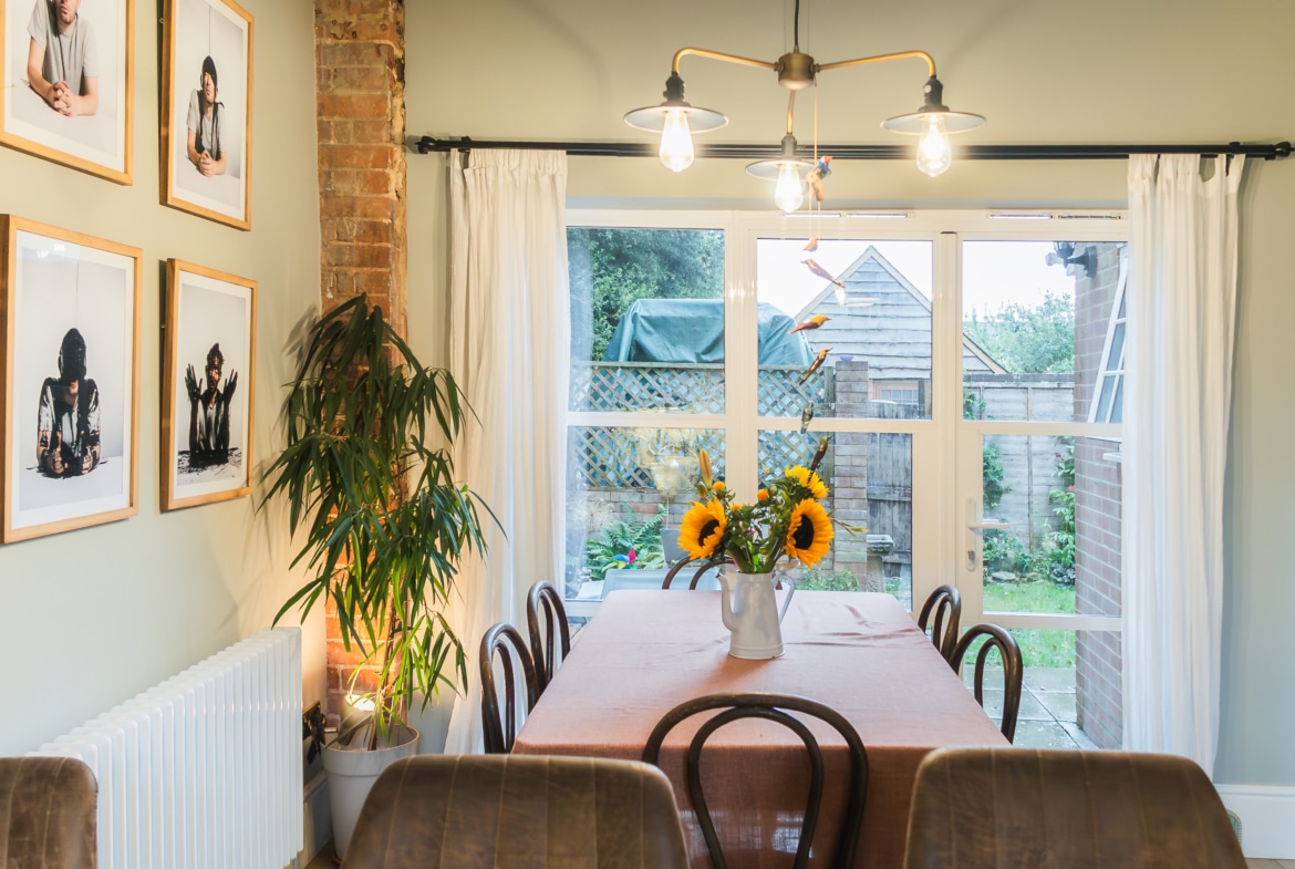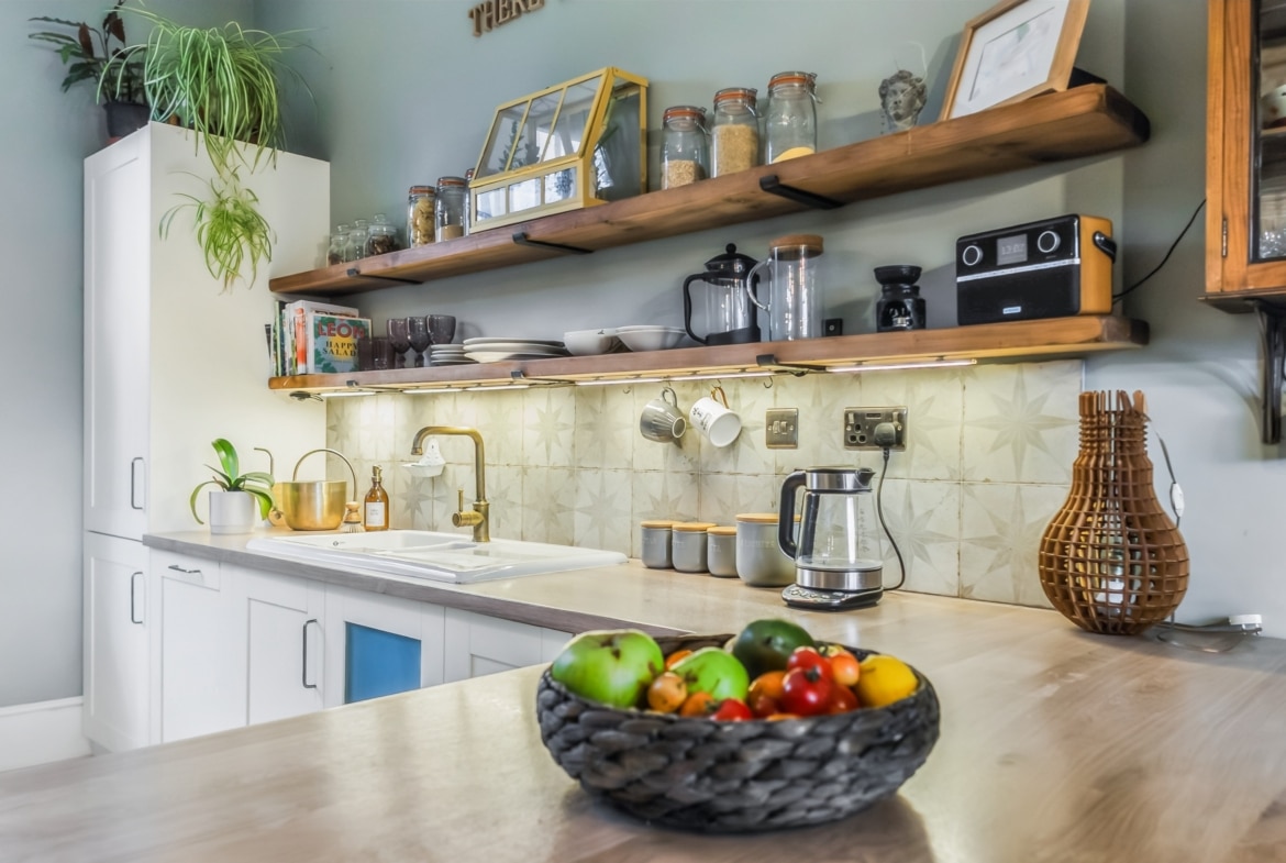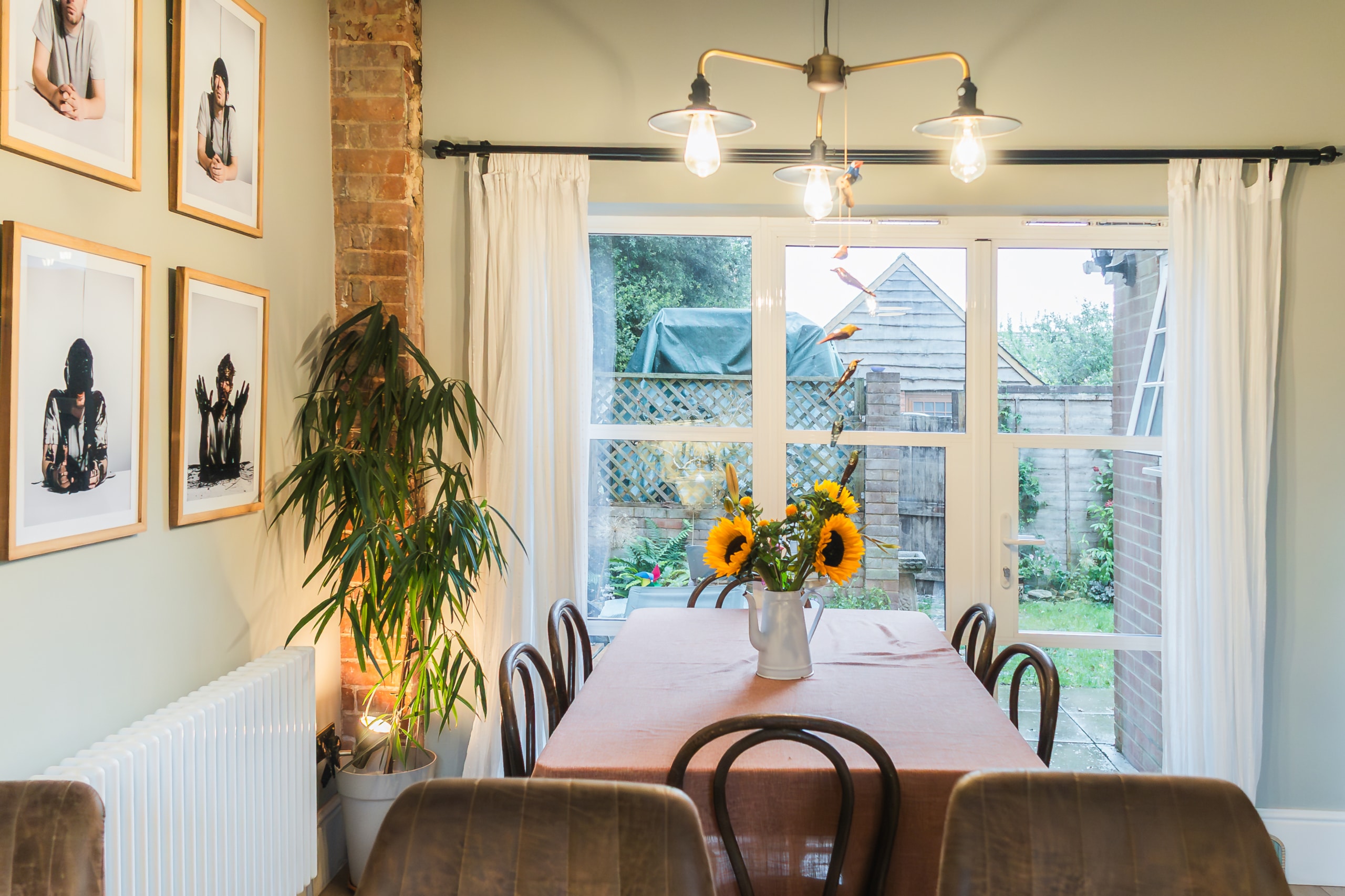 Step through the red front door into a welcoming hallway that flows straight ahead into the heart of the home—the stylish kitchen/dining room. Thoughtfully designed with bespoke cabinetry, warm timber worktops and open shelving, this sociable space is perfect for everyday living and entertaining, with French doors opening to the garden. A practical utility and cloakroom sit beyond, neatly arranged for modern convenience. The generous living room is accessed from the kitchen area, a bright, relaxed space anchored by a charming feature fireplace.