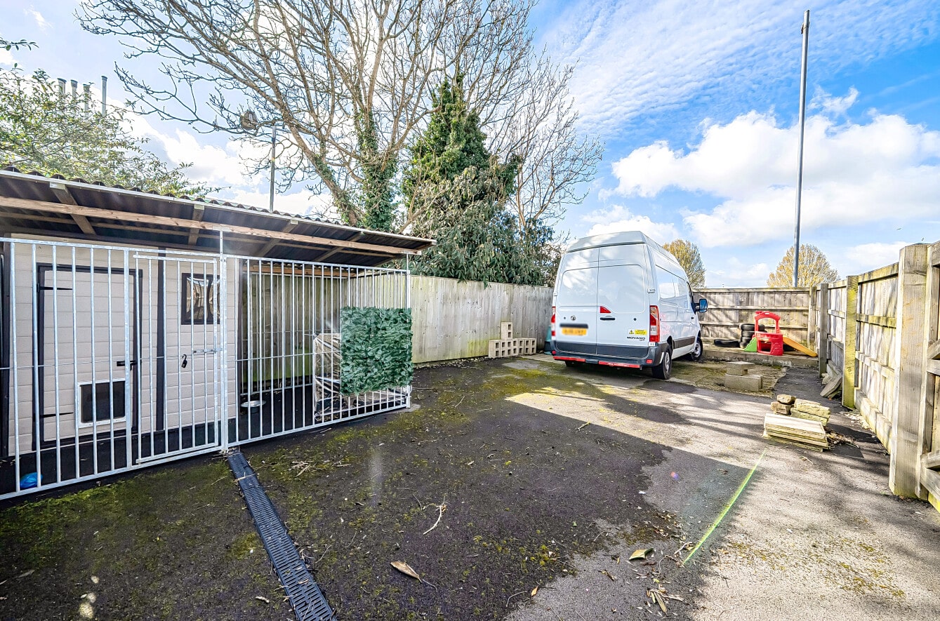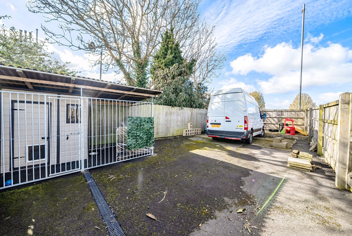 The property is approached via a large driveway, providing ample off-road parking and leading to a substantial garage, ideal for additional storage or workshop use and an additional fenced compound offering further secure outdoor space. Upon entering, you are welcomed into a central entrance hall which provides access to the principal ground floor rooms.