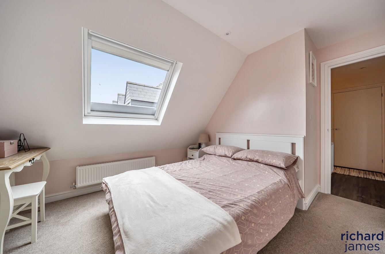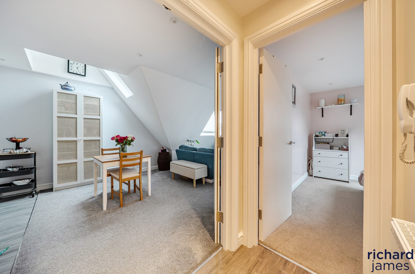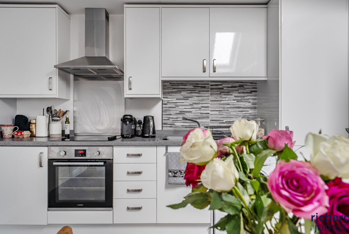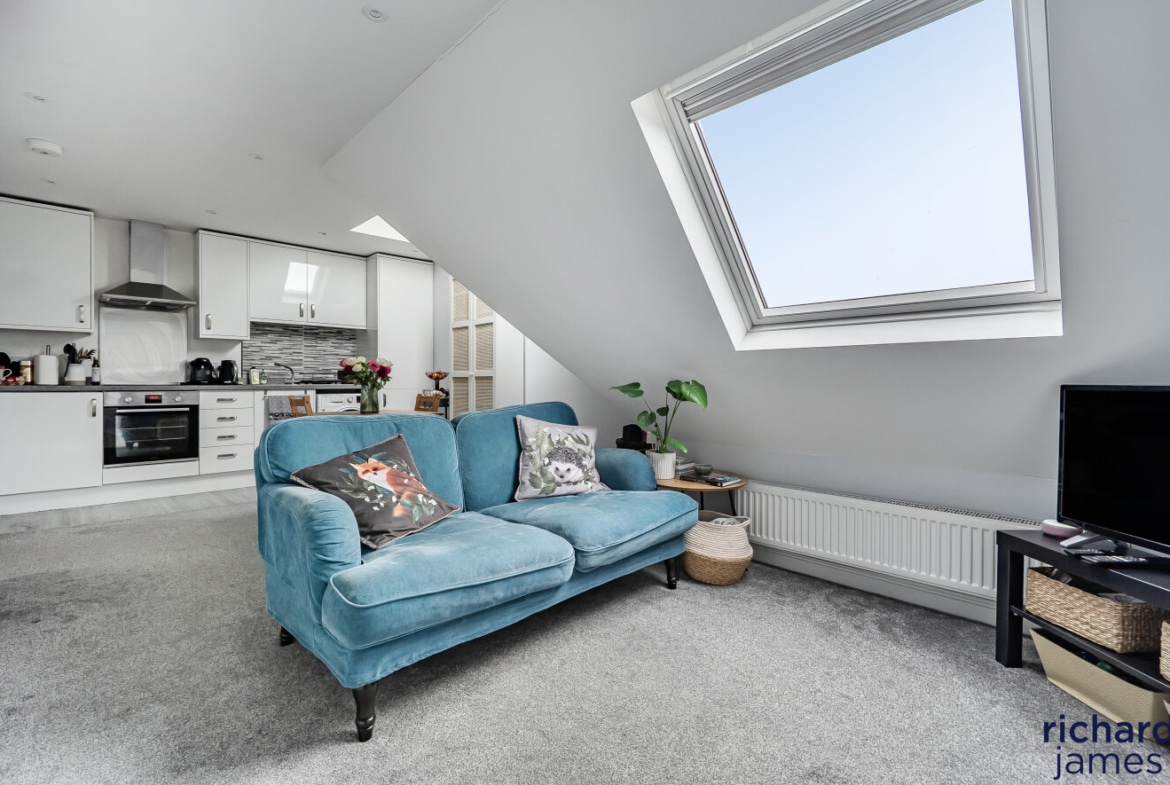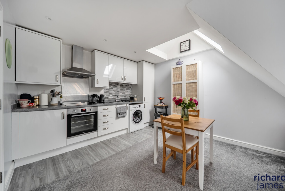 This charming top floor apartment offers a bright and contemporary open-plan kitchen and living area, featuring modern fitted units and integrated appliances. The space is well laid out for both relaxing and entertaining.