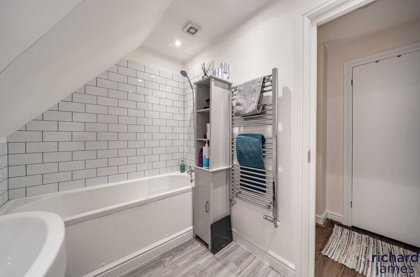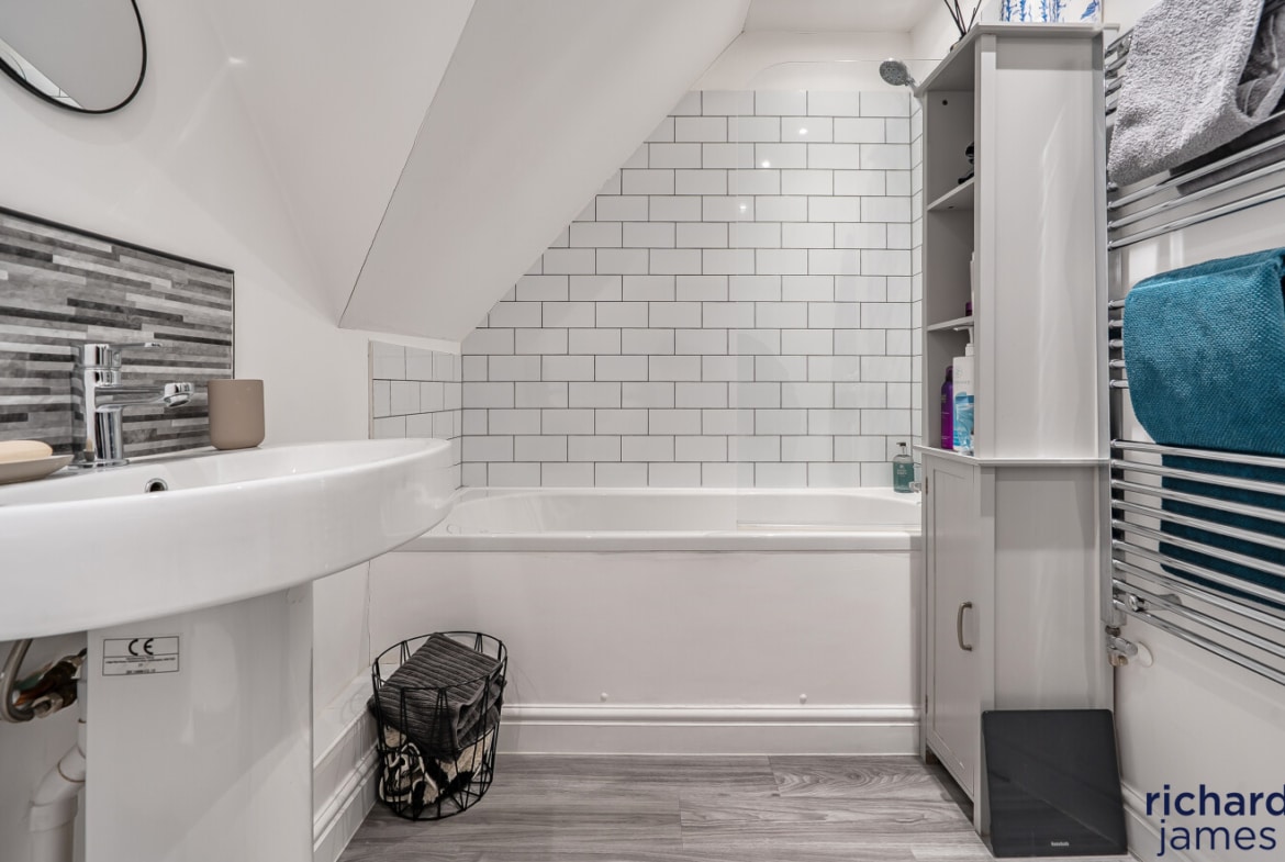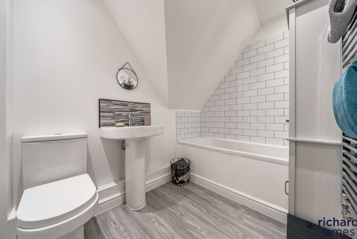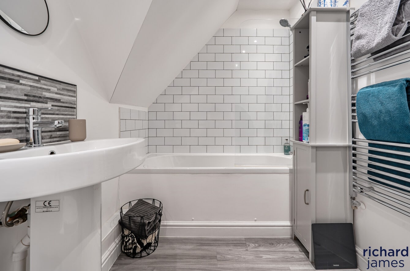 A good-sized bedroom sits quietly to one side of the home, benefitting from natural light and a practical layout. The bathroom includes a full-size bath with overhead shower, along with a basin and WC, finished in a modern style.
