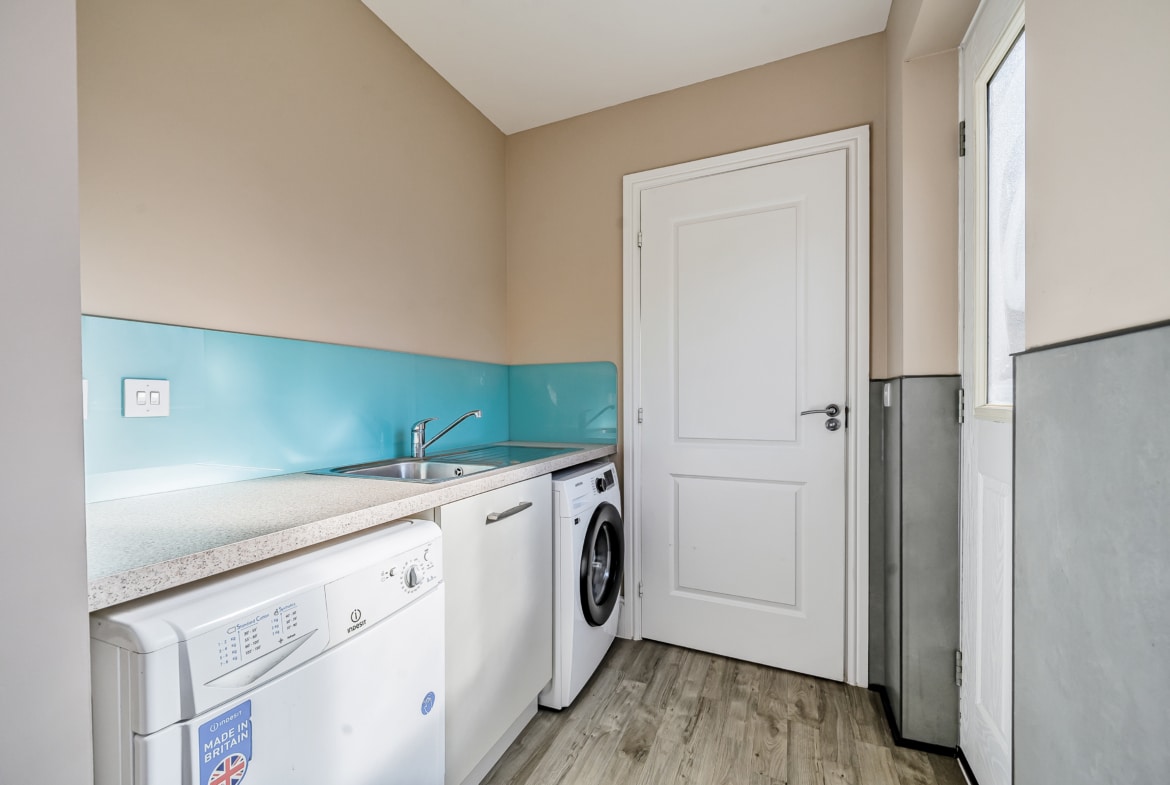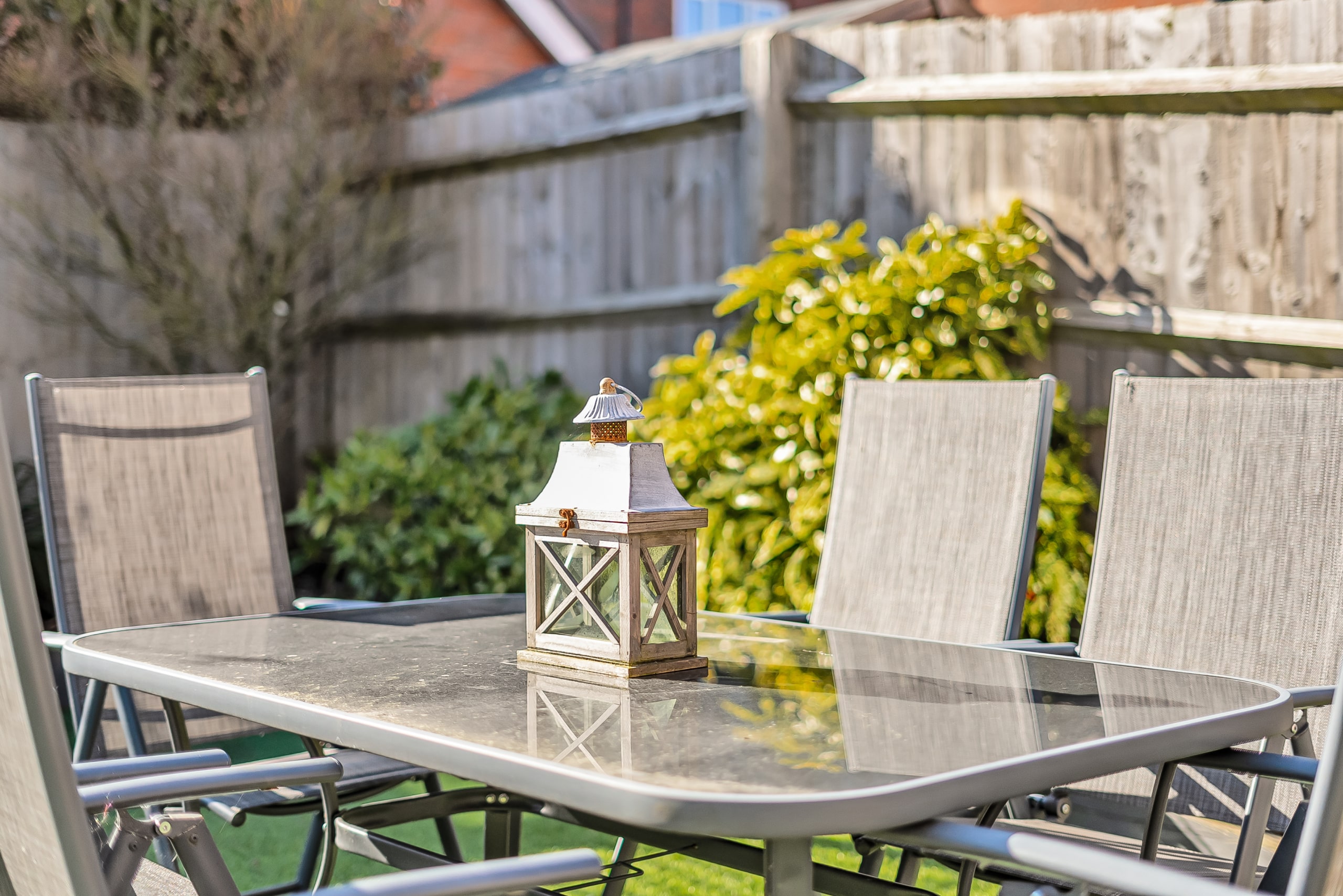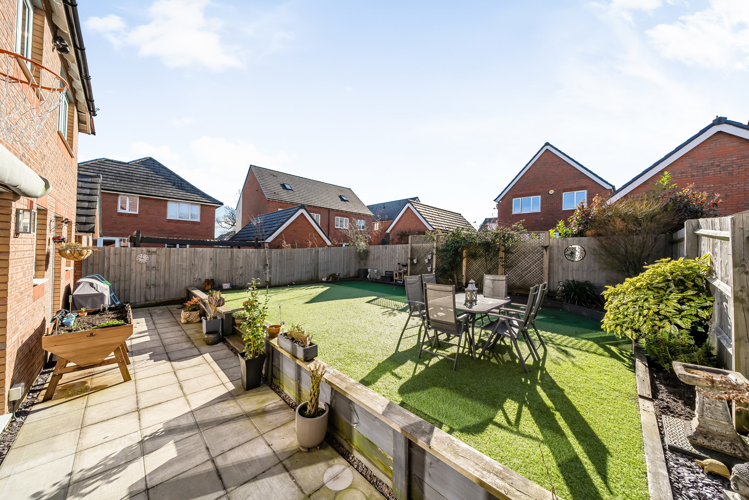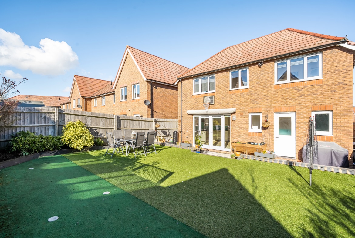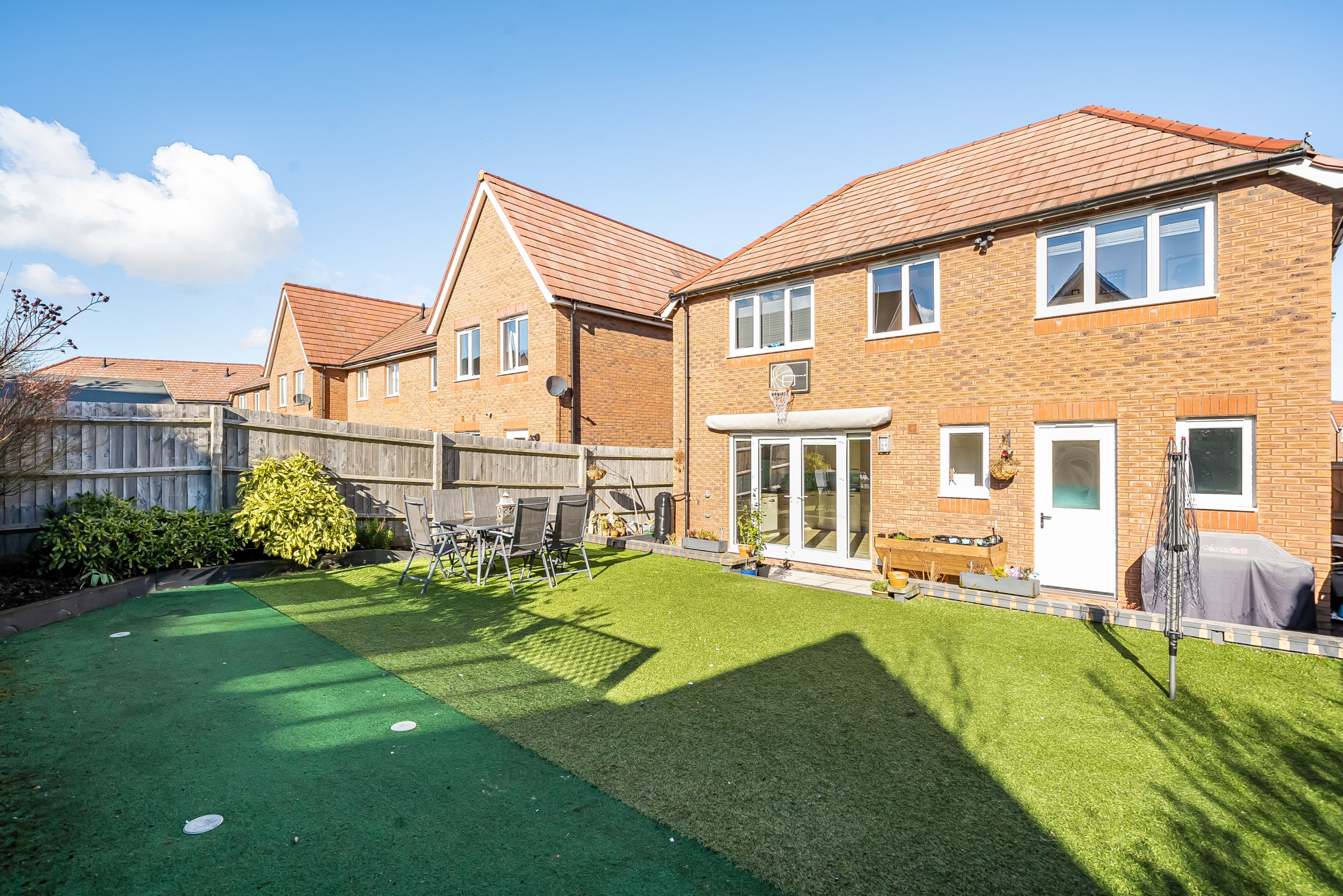 Externally, the low-maintenance rear garden is mostly laid with astro turf, featuring a putting green at the back—perfect for golf enthusiasts! A patio area provides a great space for outdoor dining. To the front, a driveway offers side-by-side parking for two cars.