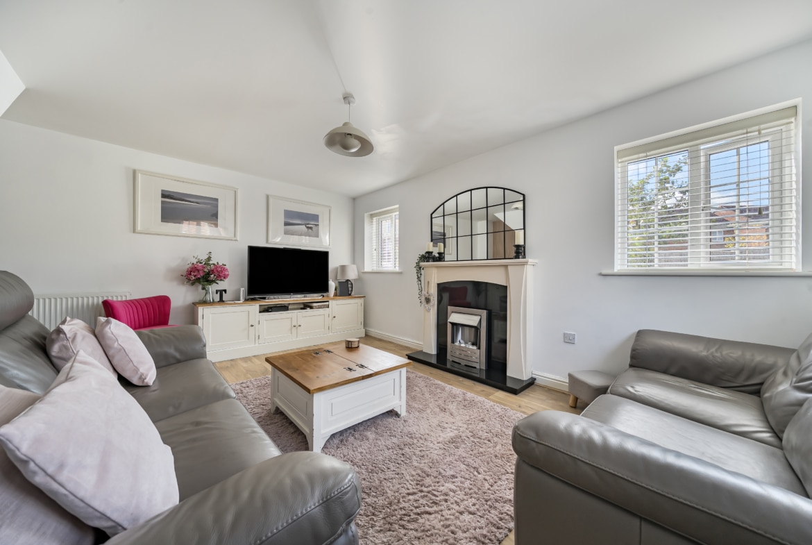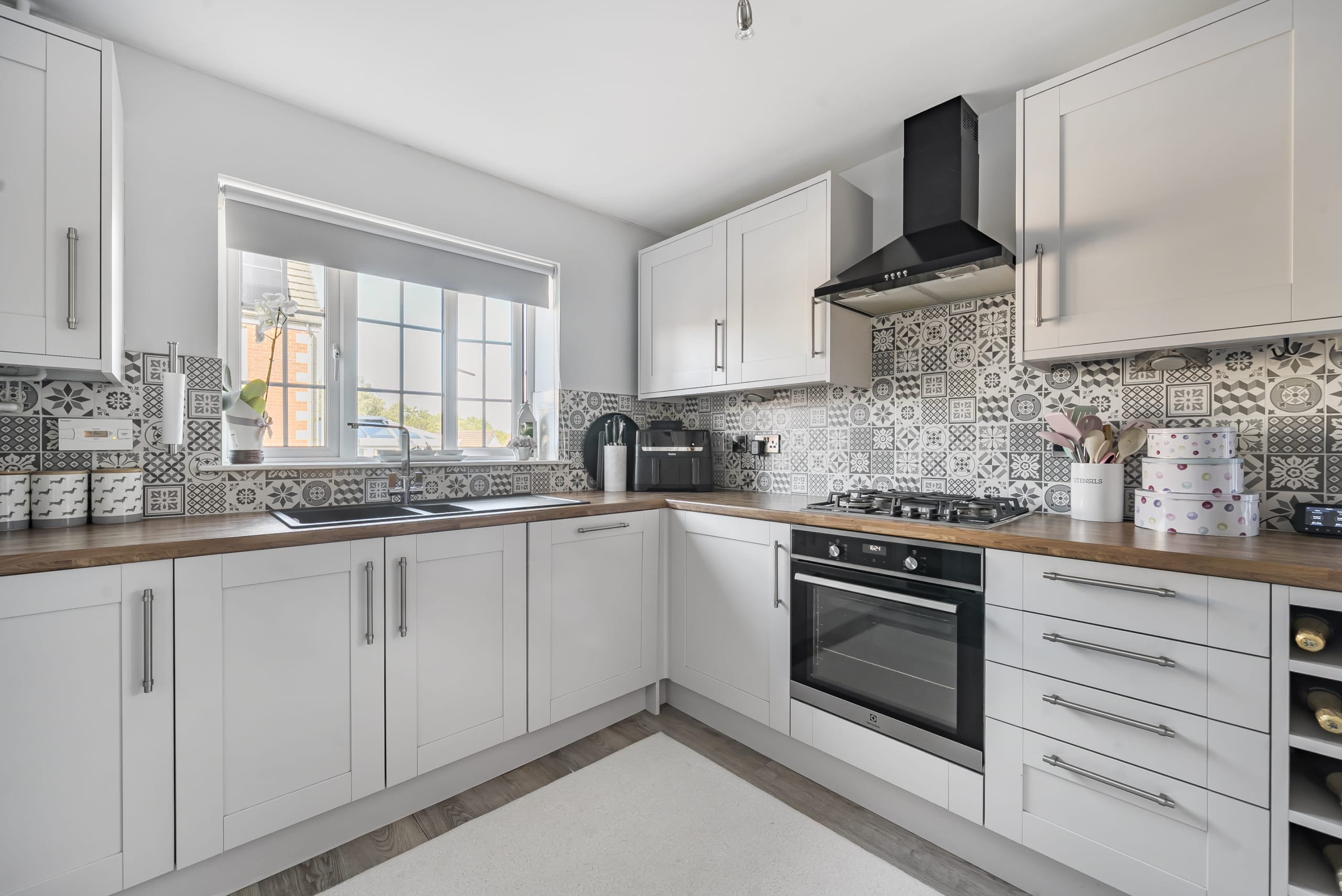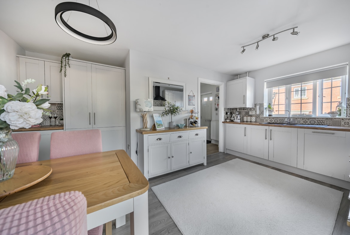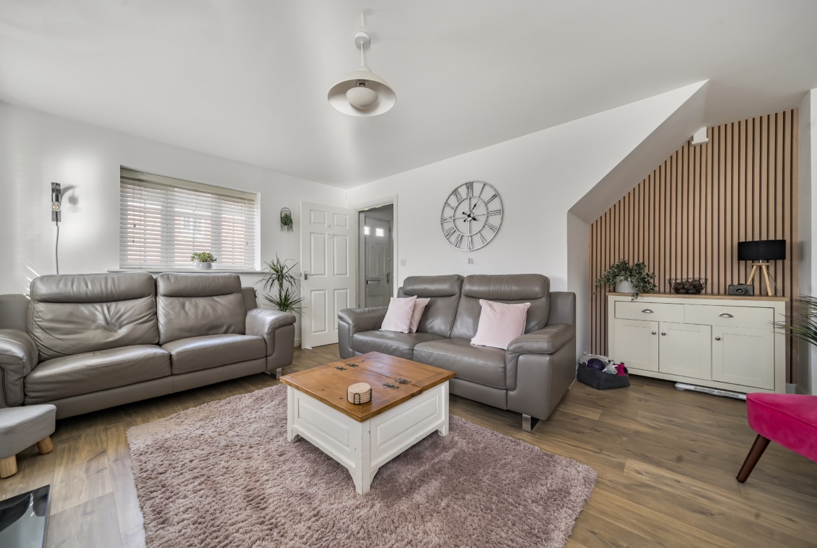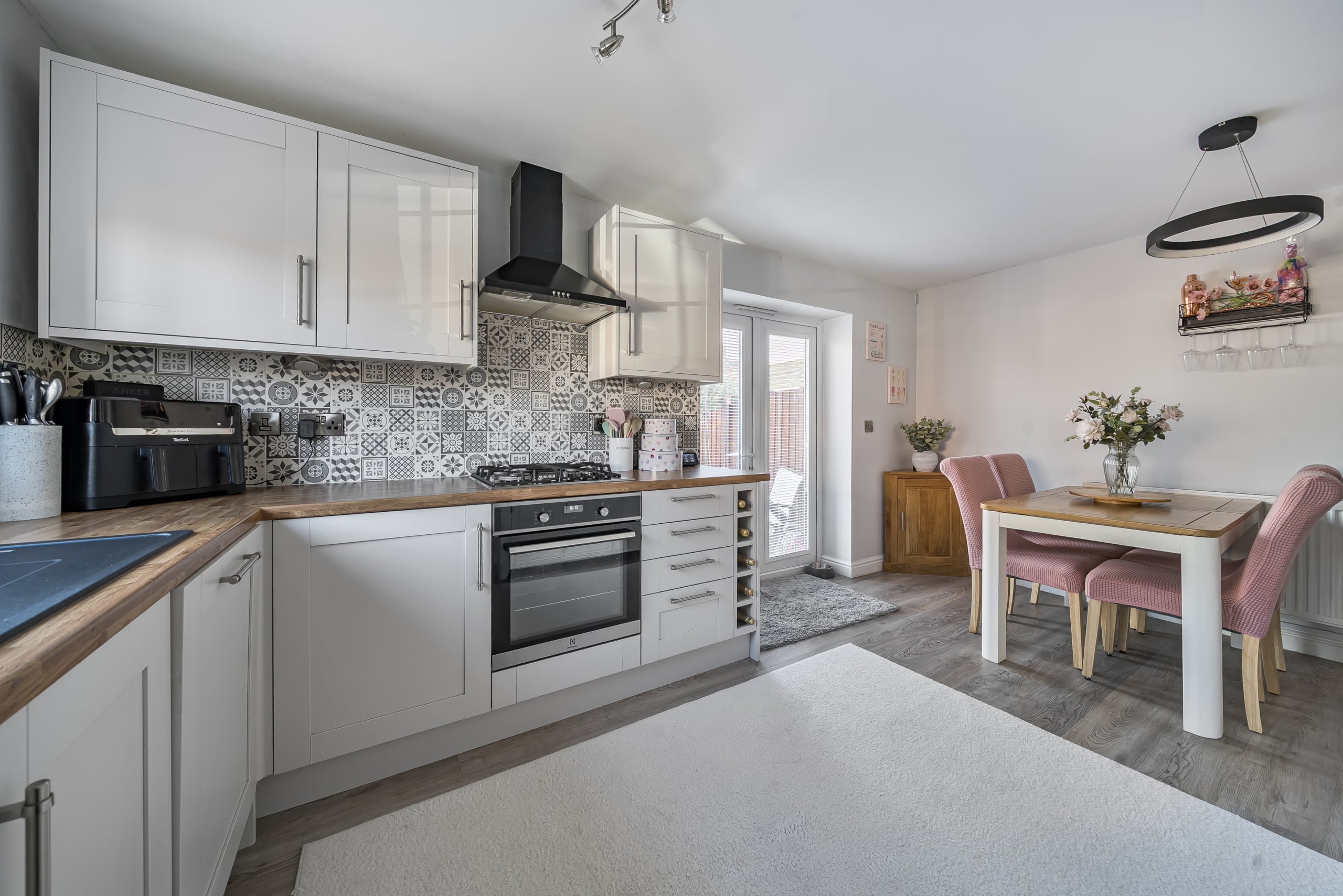 Step inside to a welcoming hallway with a guest cloakroom before moving through to the bright living room. To the rear, the open-plan kitchen/dining space is the real heart of the home, with plenty of storage space and French doors opening directly onto the landscaped garden – an ideal spot for family time or entertaining. The garden also provides access to the driveway and garage, making everyday living seamless.