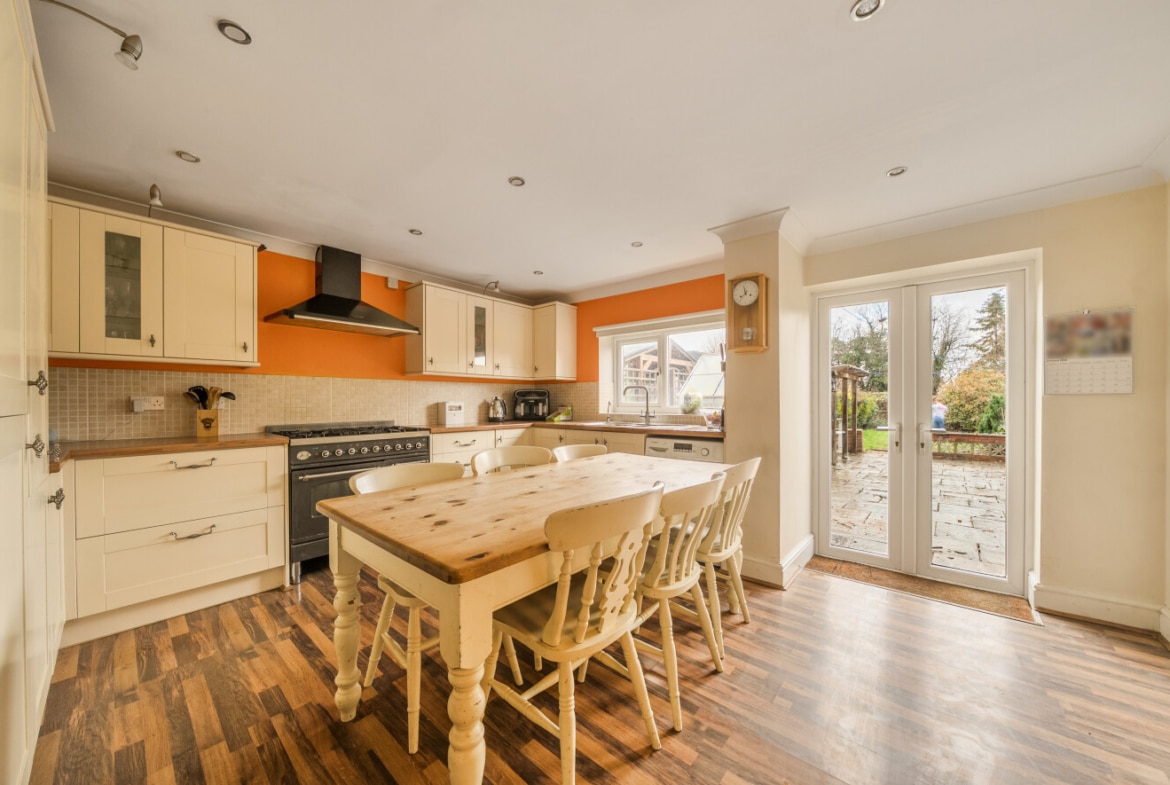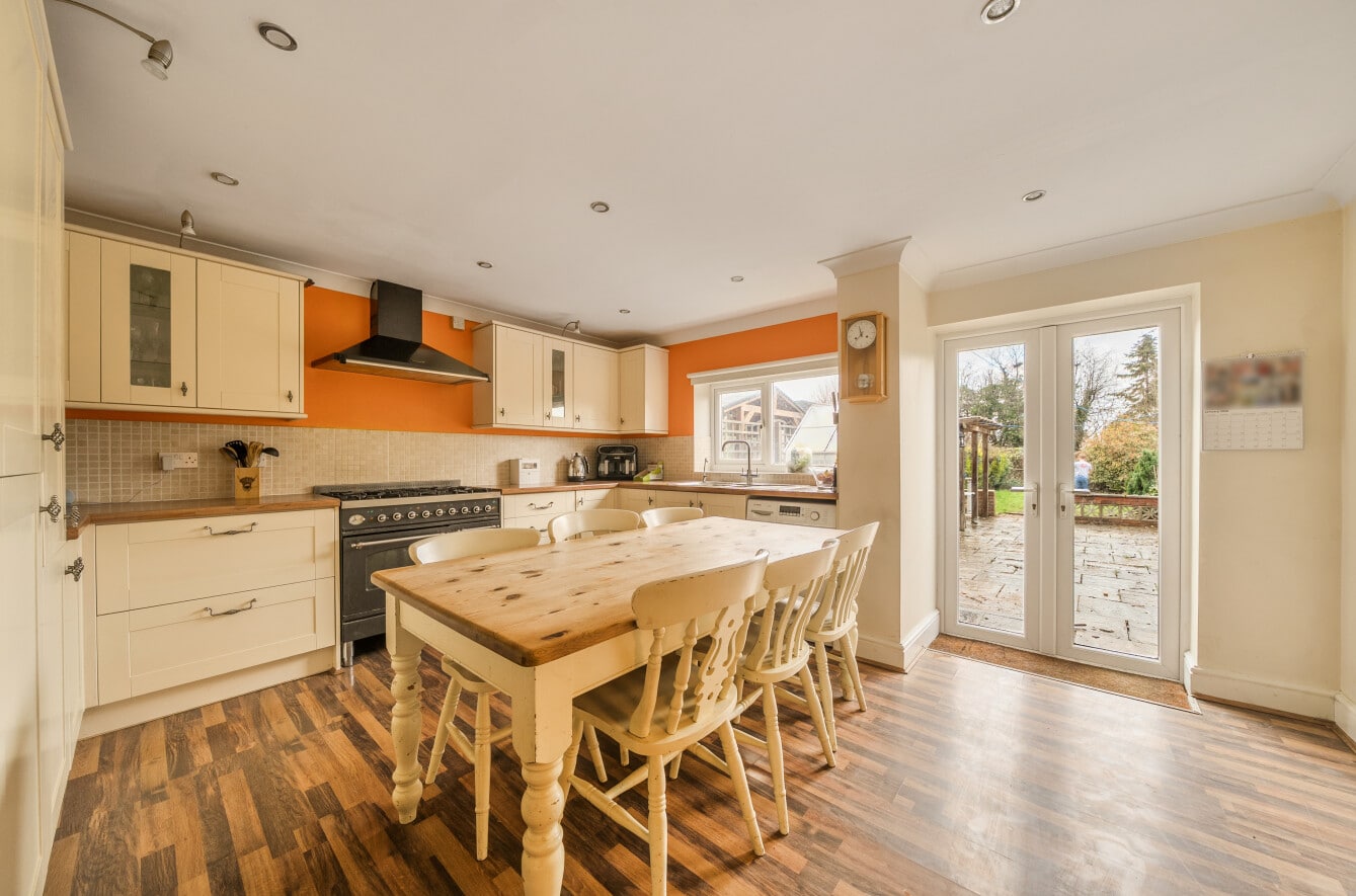 To the rear, the house opens into a spacious kitchen/dining room, creating a sociable hub ideal for family life and entertaining. From here, doors lead directly out to a generous patio area, perfect for outdoor dining and summer gatherings, with the garden extending beyond.