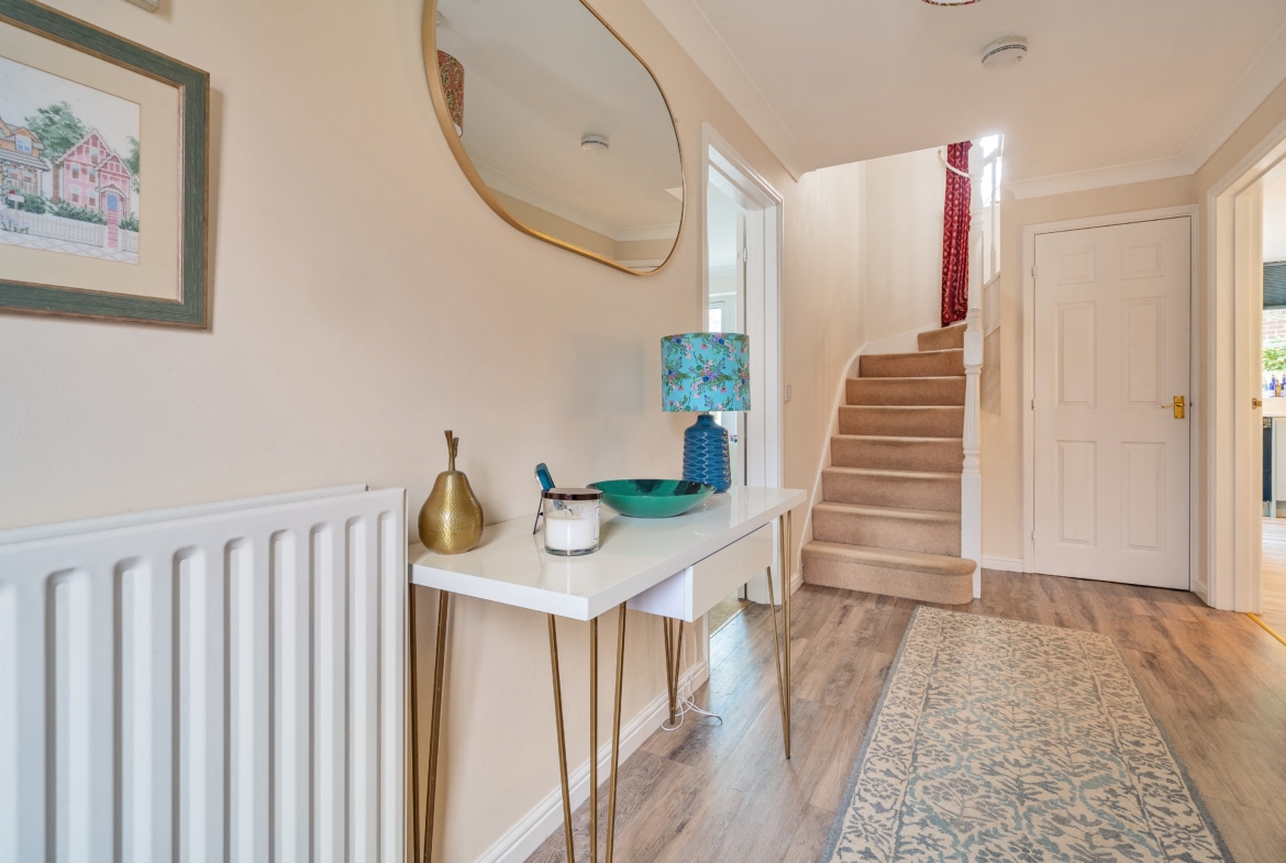 The outdoor space of this residence is equally impressive, with a good-sized rear garden that offers a lovely combination of lawn, plantings, a patio, and a decking area – perfect for enjoying outdoor living. The property also benefits from a driveway leading to the garage, providing ample parking space for several vehicles.