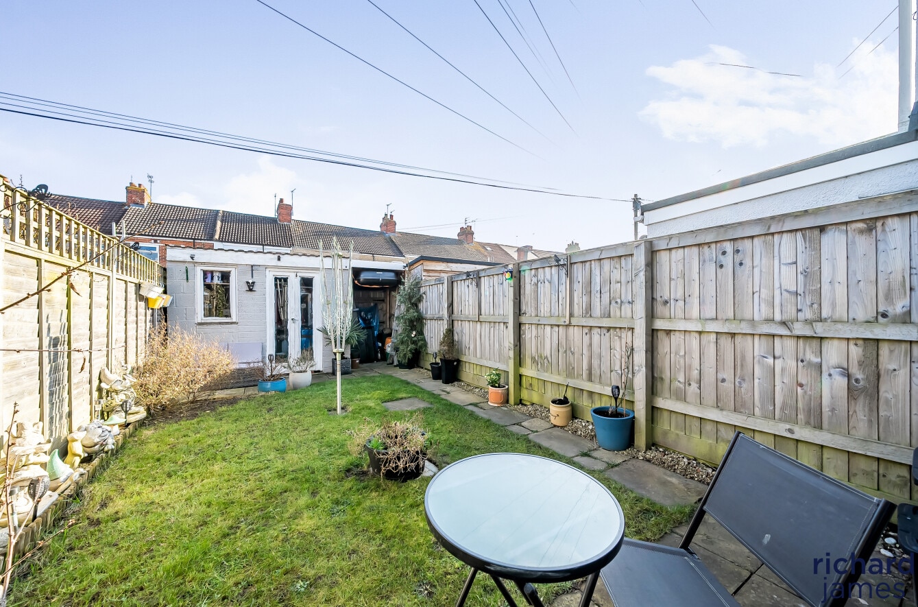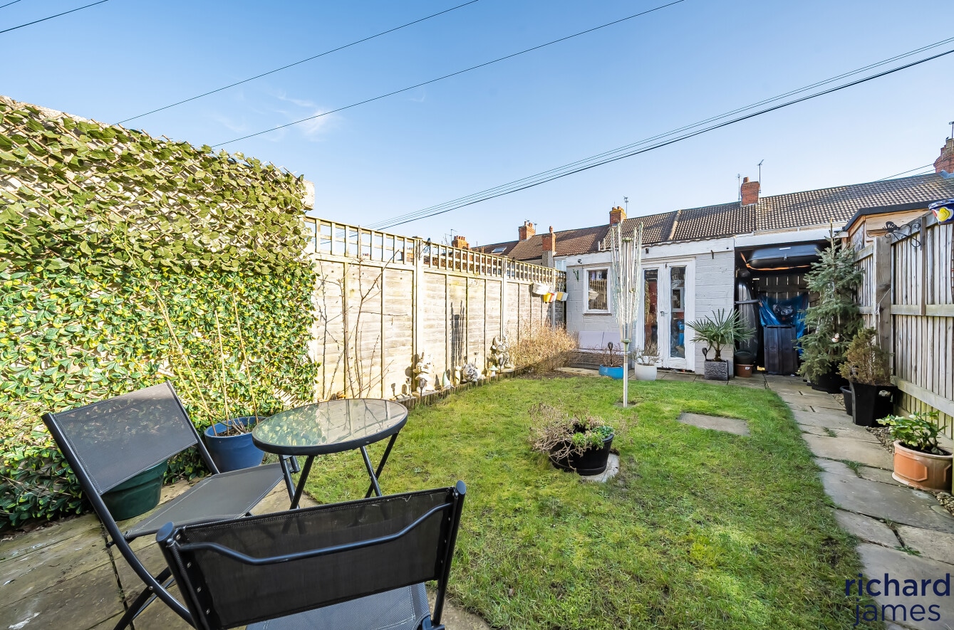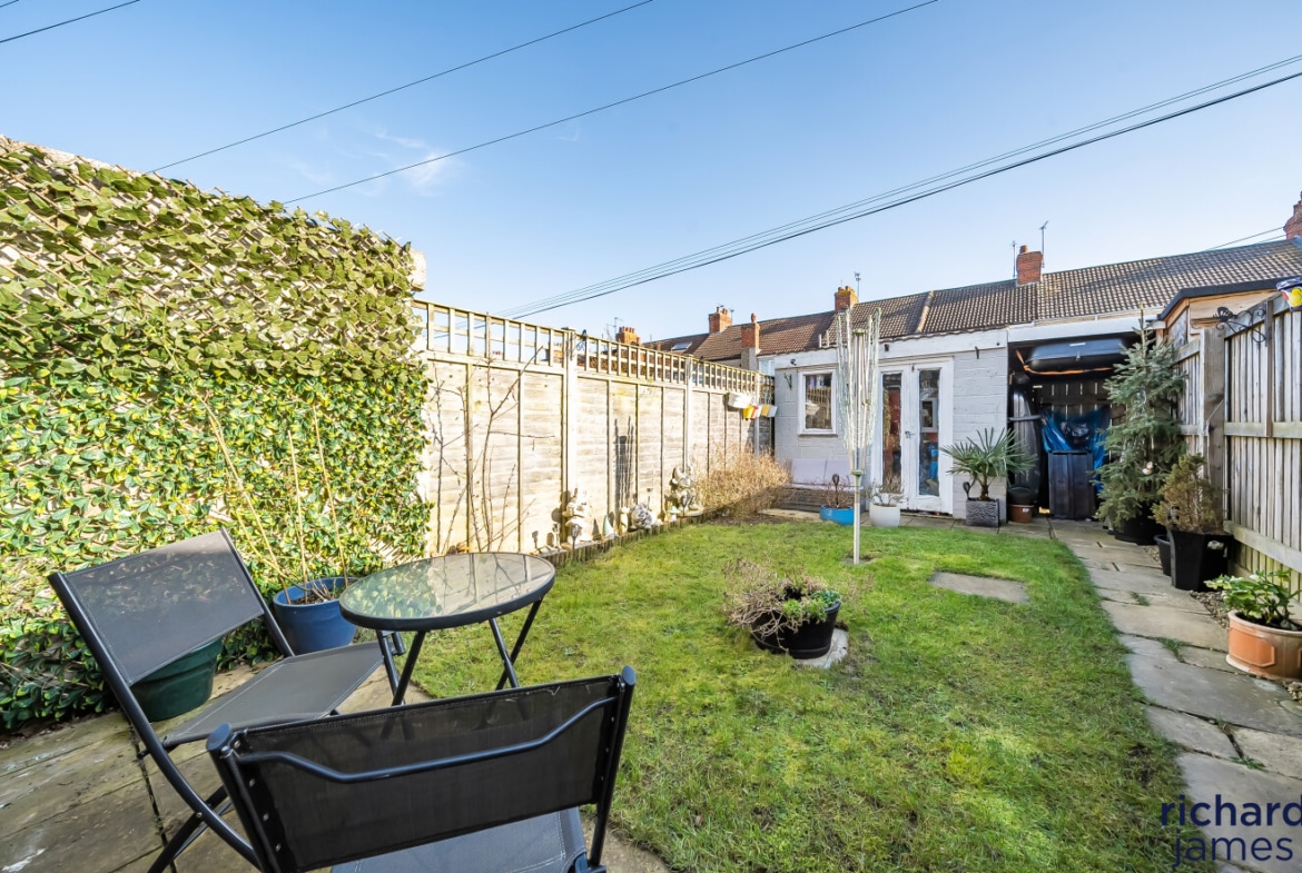 To the rear is an enclosed rear garden with a patio seating area leading to a lawn and a brick built shed and storage area.