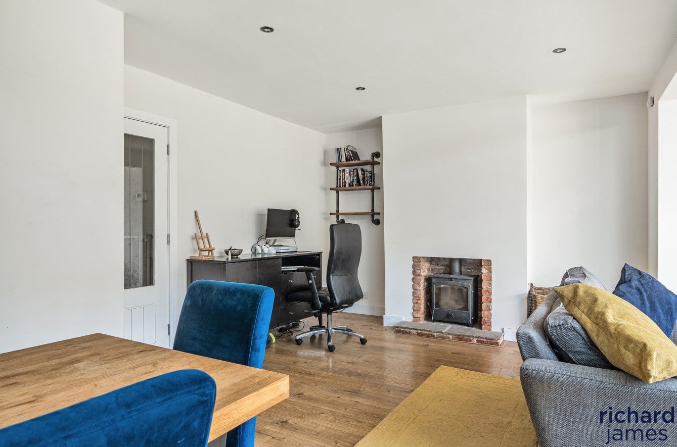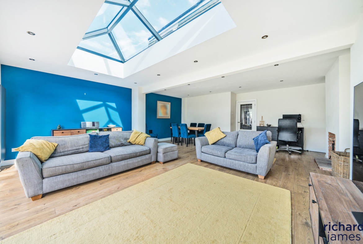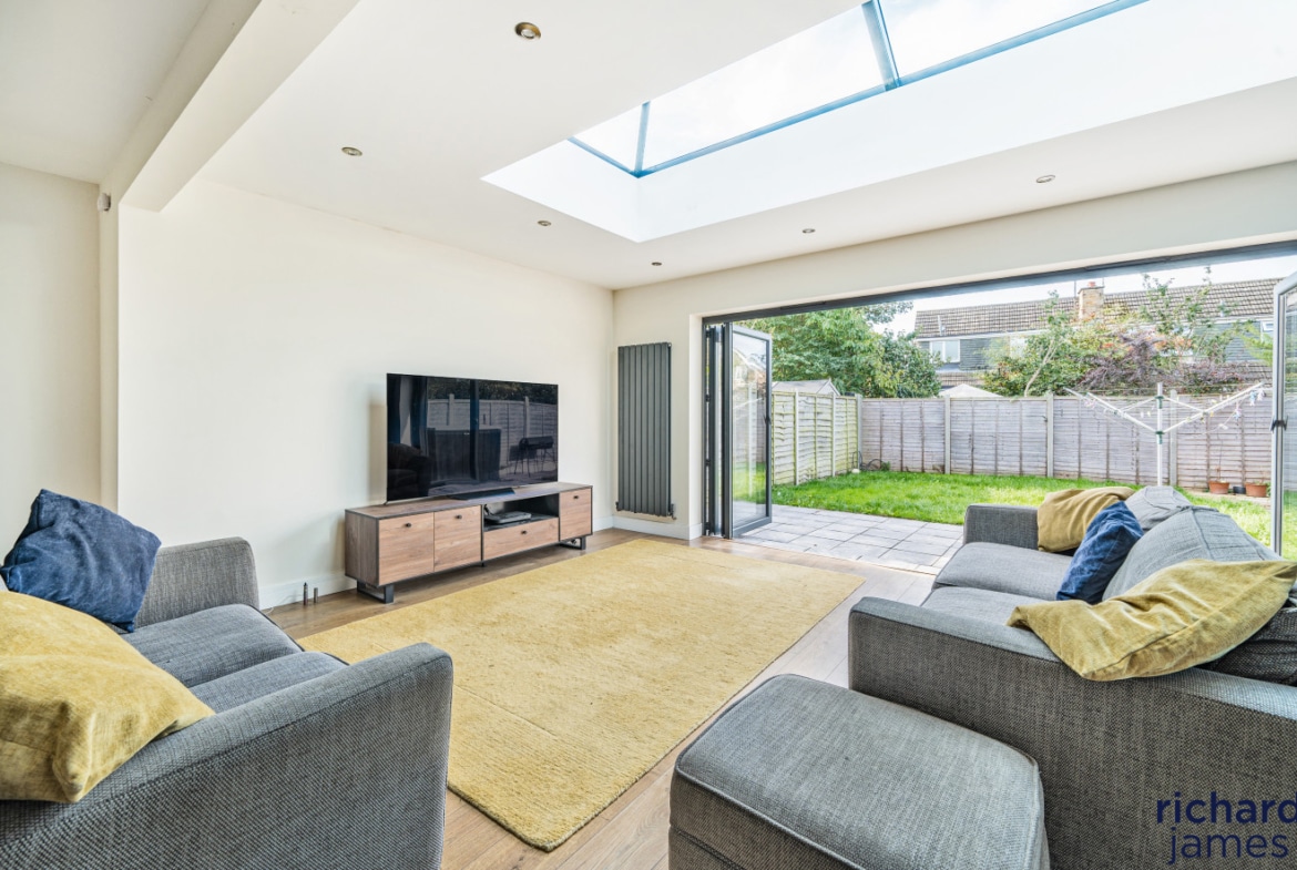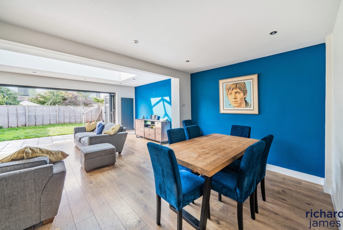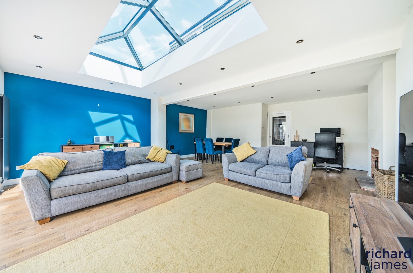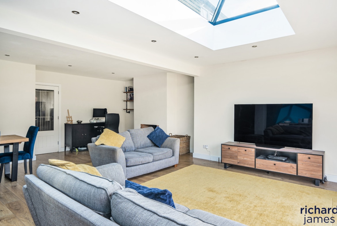 The ground floor living accommodation comprises; entrance porch, entrance hall, a large extended lounge/dining room with bi-folding doors to the rear, roof lantern and log burner stove, a modern recenlty fitted kitchen with quartz worktops and integrated appliances, utility room, W.C plus integral access to the garage.