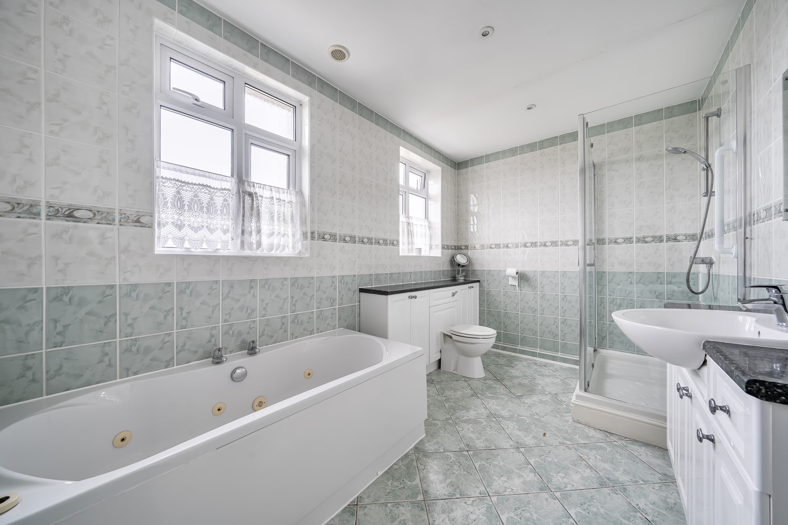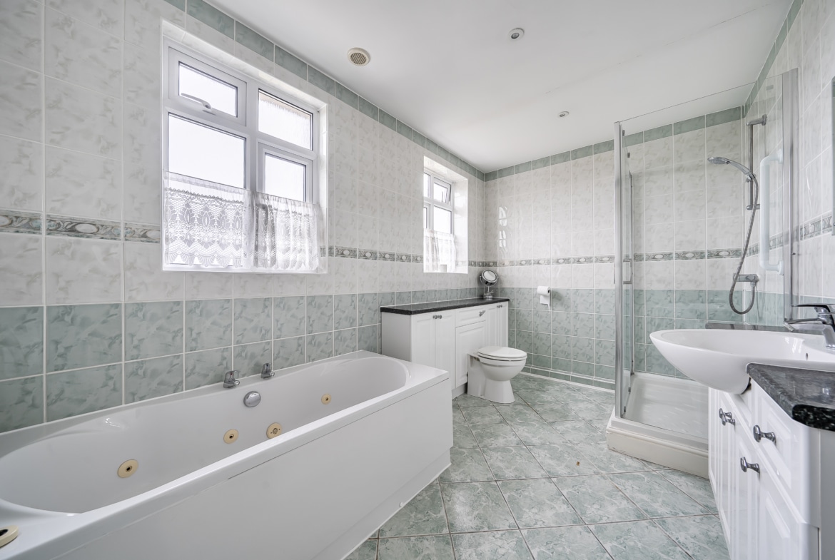 Upstairs are Three Bedrooms and a spacious Family Bathroom having a Shower and Separate Bath with Sink and Toilet.