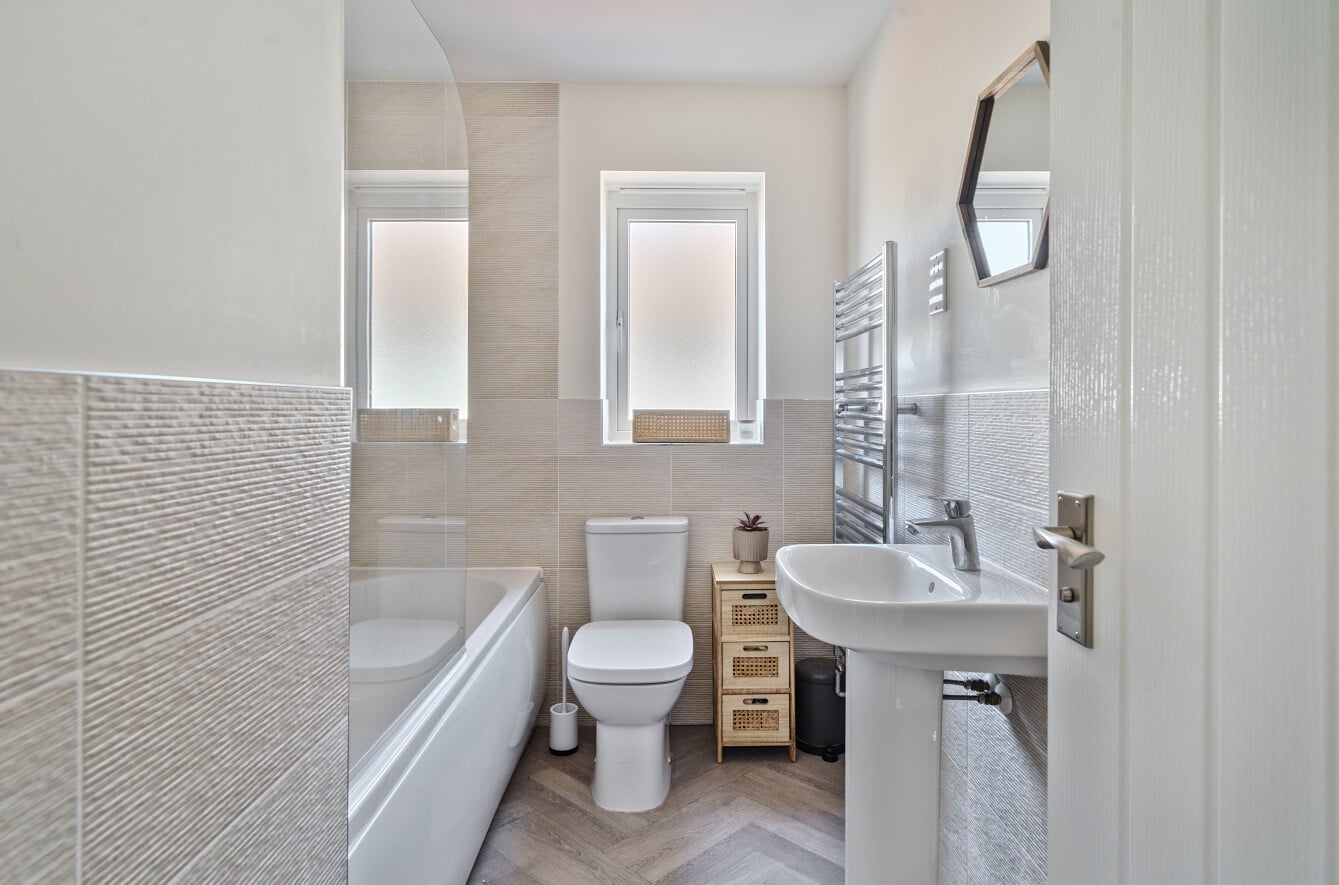 Upstairs, the home boasts three well-proportioned bedrooms. The master and second bedrooms provide generous space and natural light, while the third bedroom is ideal as a nursery, home office, or guest room. A contemporary family bathroom serves all three bedrooms.