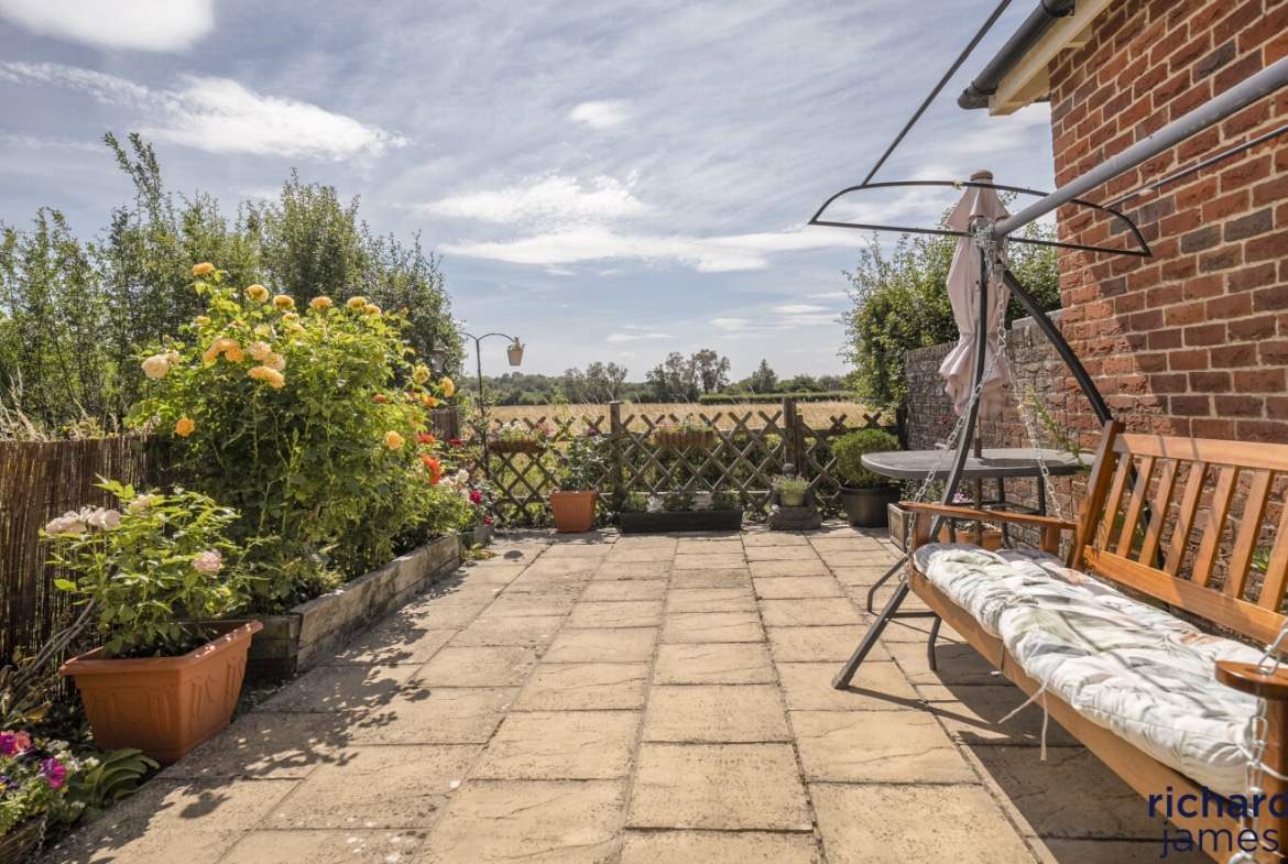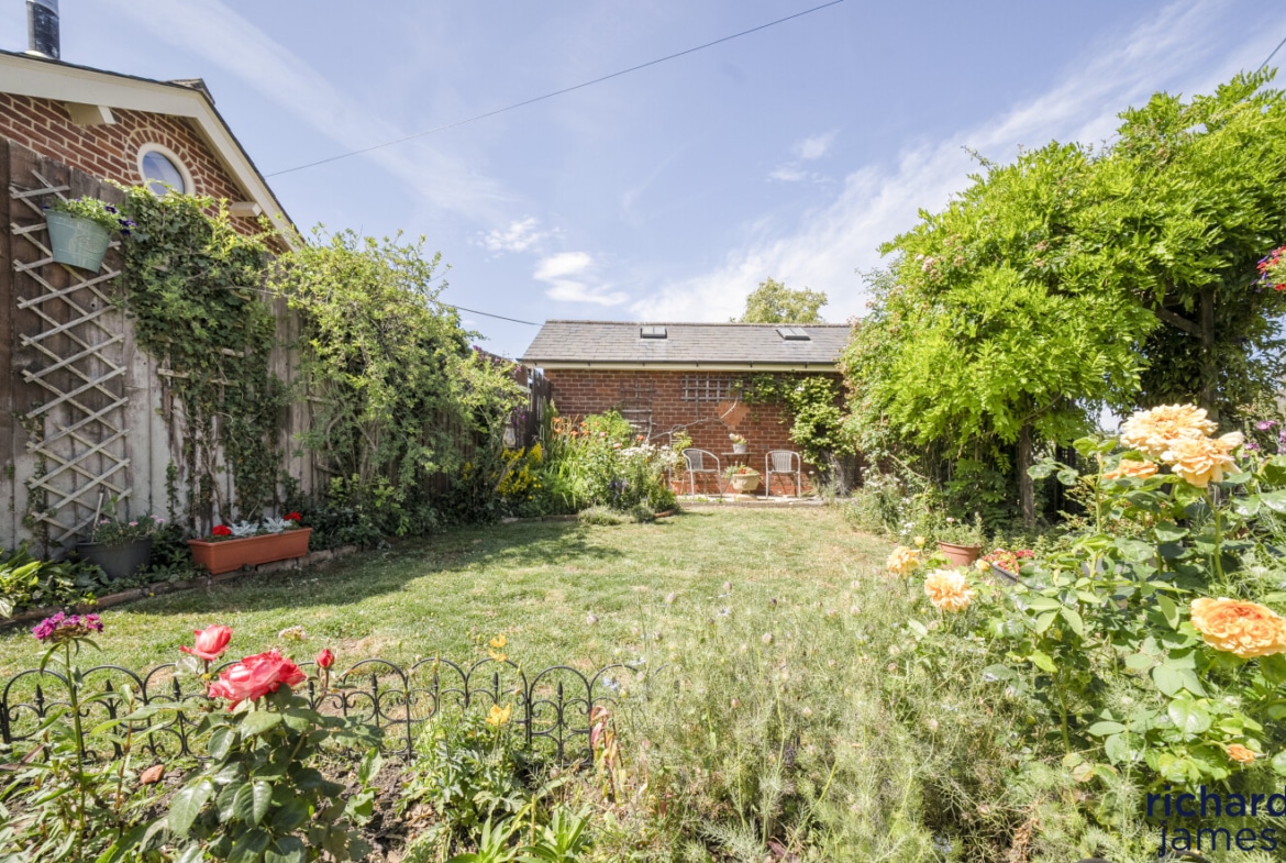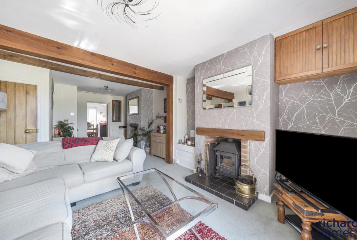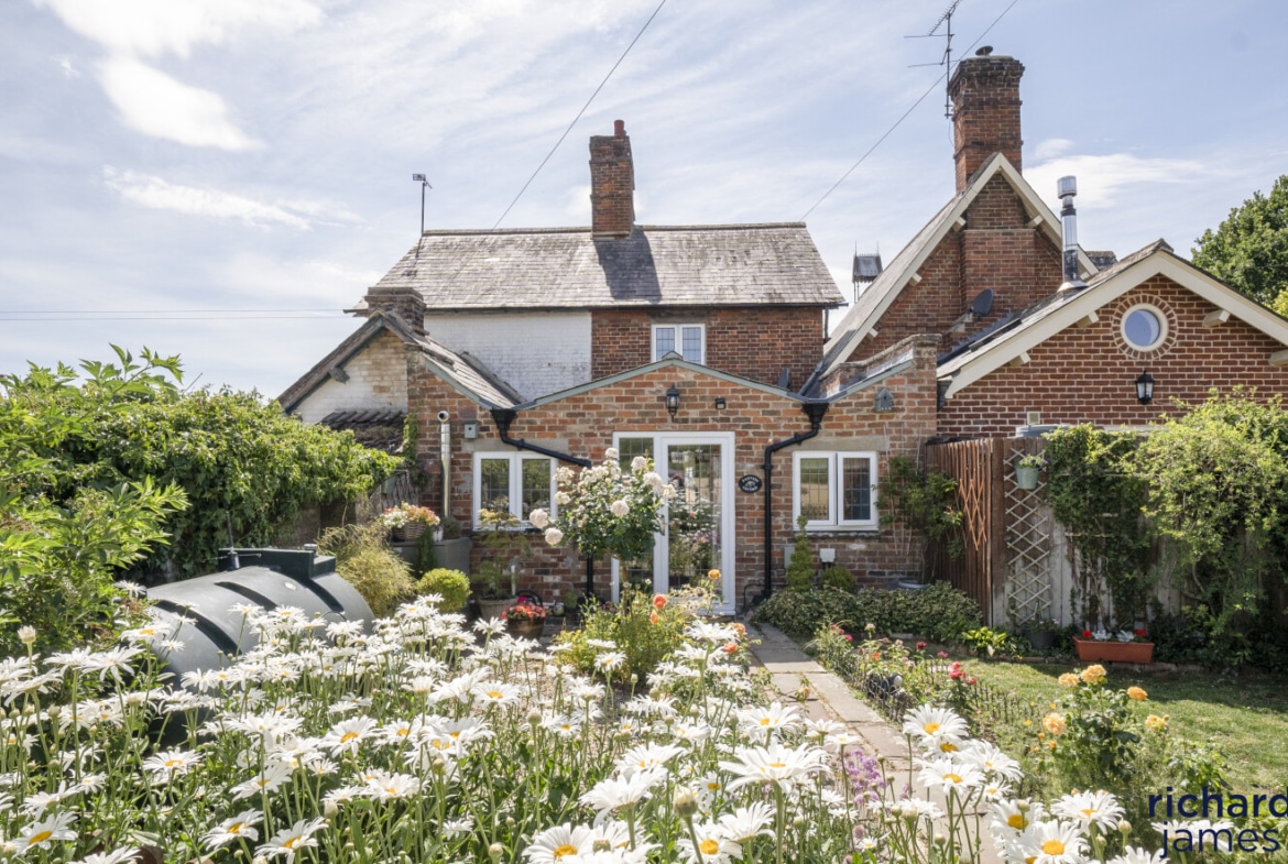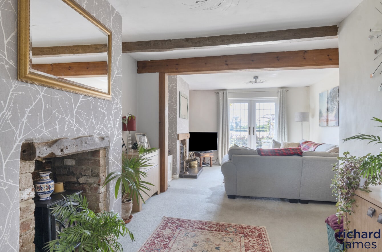 Inside, the cottage welcomes you with a surprising sense of space and comfort. The shaker-style kitchen is a bright, airy space, complete with a vaulted ceiling and Velux windows that flood the room with natural light. It’s perfect for both casual breakfasts or long, lazy weekends. The dining area, with its feature red-brick chimney breast, sets a welcoming tone, while the living room, which features a log burner, offers a cosy retreat. French doors open out into the rear garden, creating a seamless connection between the inside and outside.