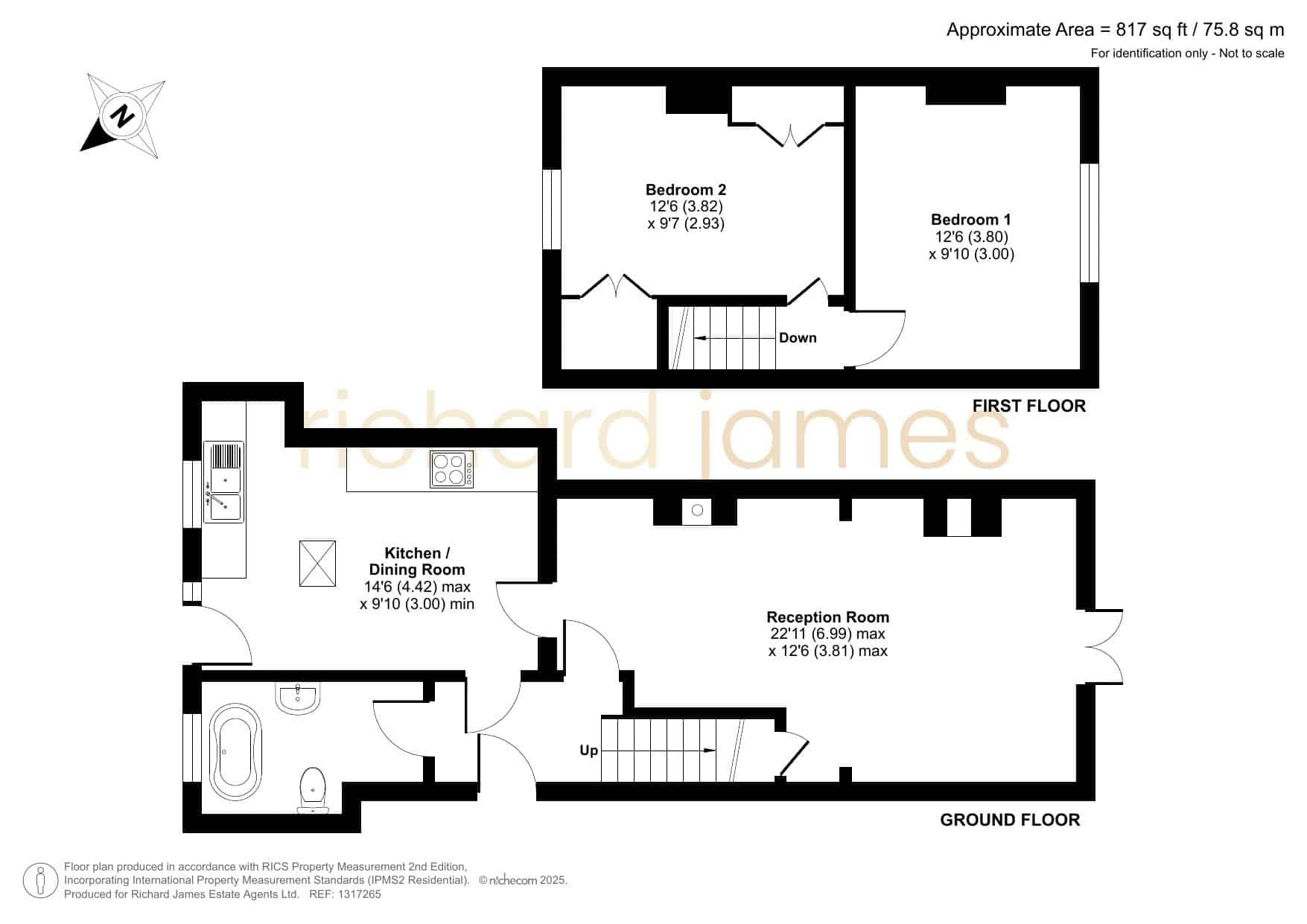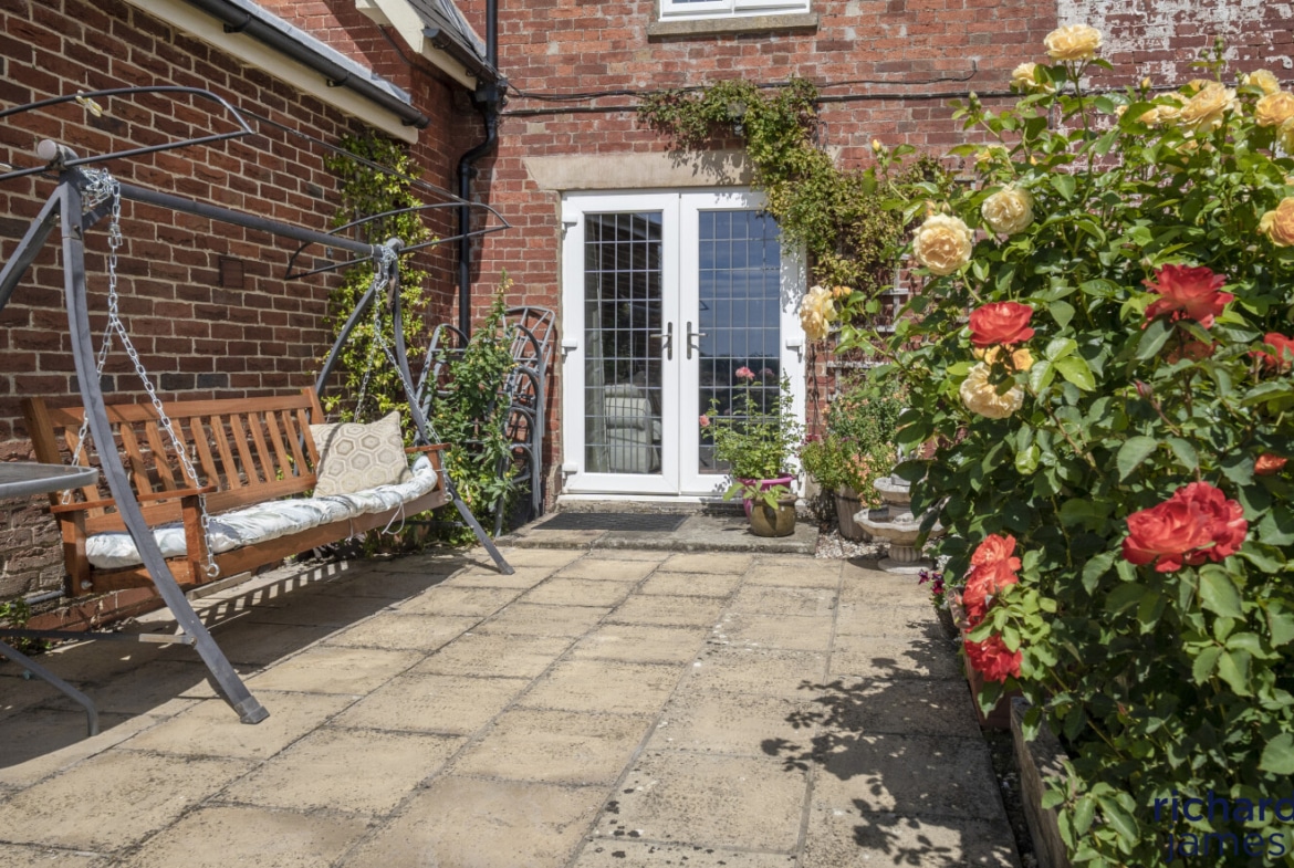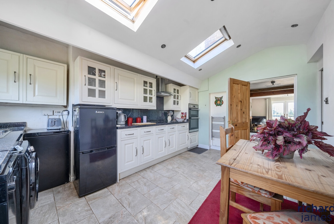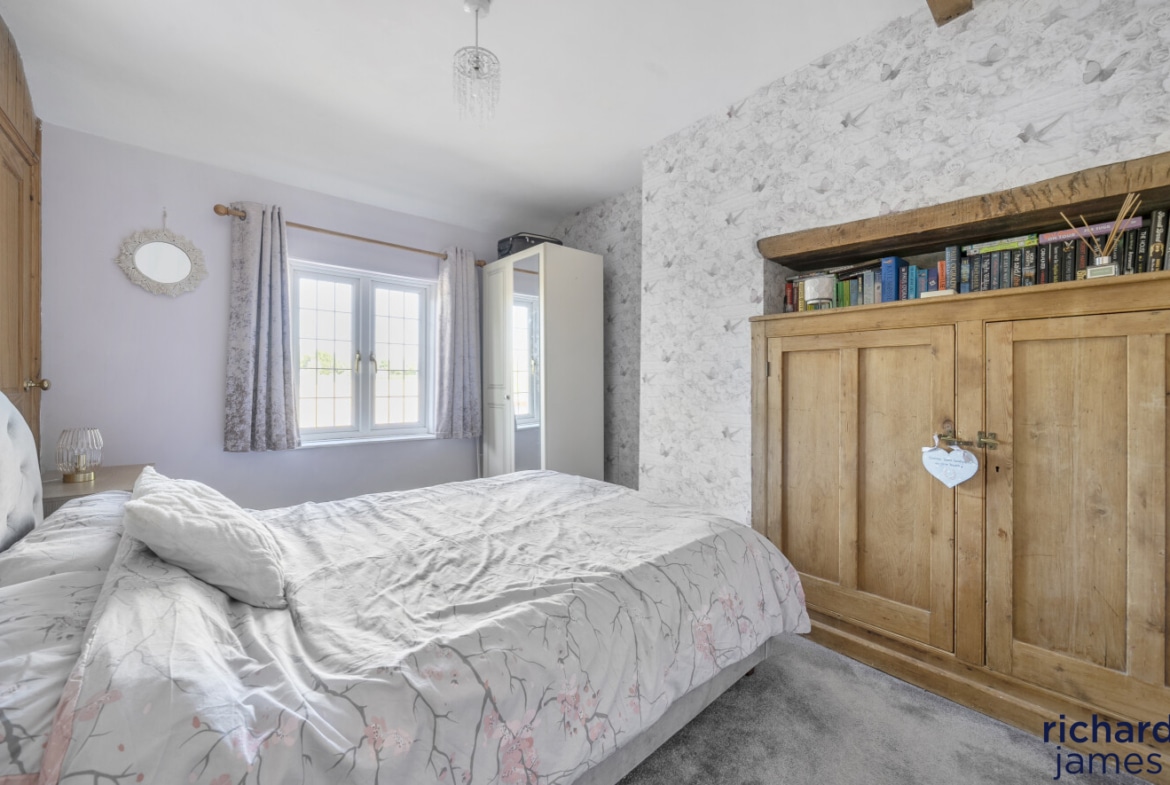 Inside, the cottage welcomes you with a surprising sense of space and comfort. The shaker-style kitchen is a bright, airy space, complete with a vaulted ceiling and Velux windows that flood the room with natural light. It’s perfect for both casual breakfasts or long, lazy weekends. The dining area, with its feature red-brick chimney breast, sets a welcoming tone, while the living room, which features a log burner, offers a cosy retreat. French doors open out into the rear garden, creating a seamless connection between the inside and outside.