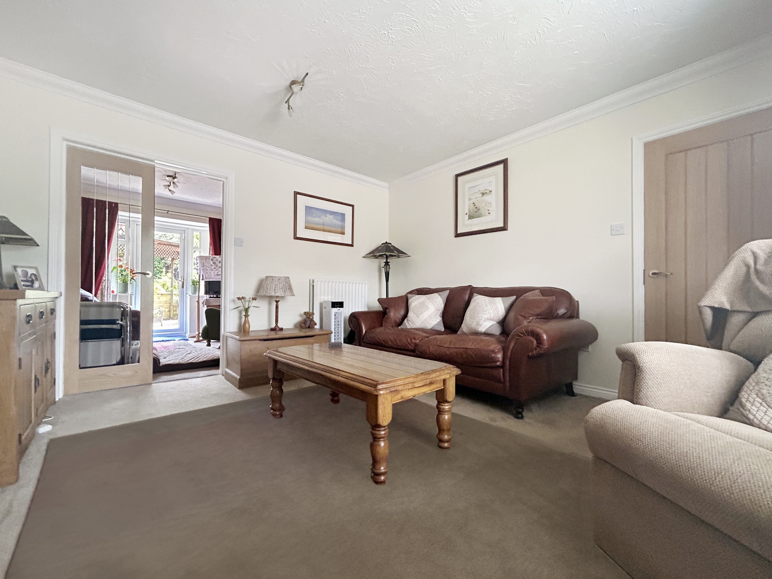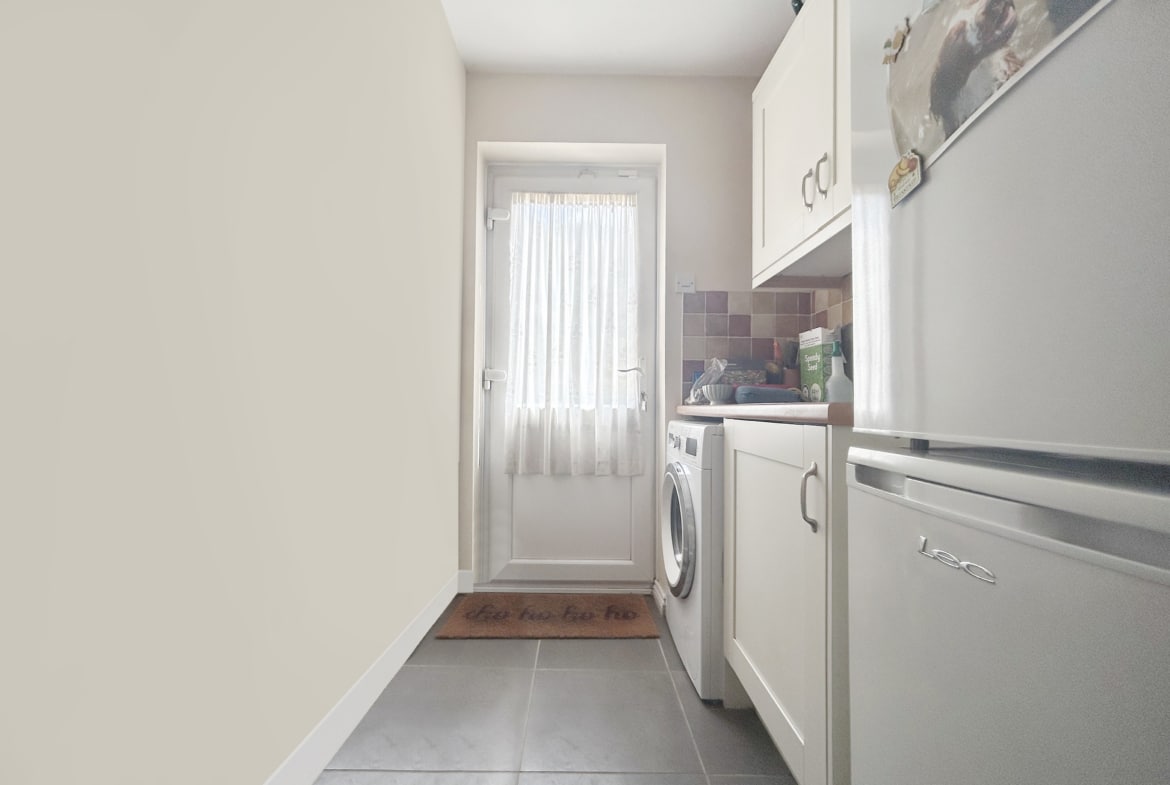The ground floor opens into a bright entrance hallway, leading to a spacious living room with a bay window that fills the space with natural light. Double doors open onto a versatile second reception room, ideal as a formal dining area or relaxed family lounge. At the heart of the home is the open-plan kitchen/dining room—designed for entertaining or family meals—with direct access to the rear garden. A utility room and convenient downstairs WC add further practicality.