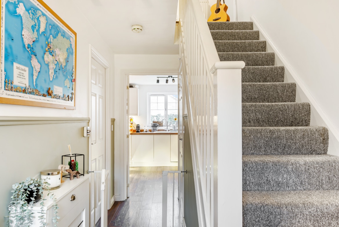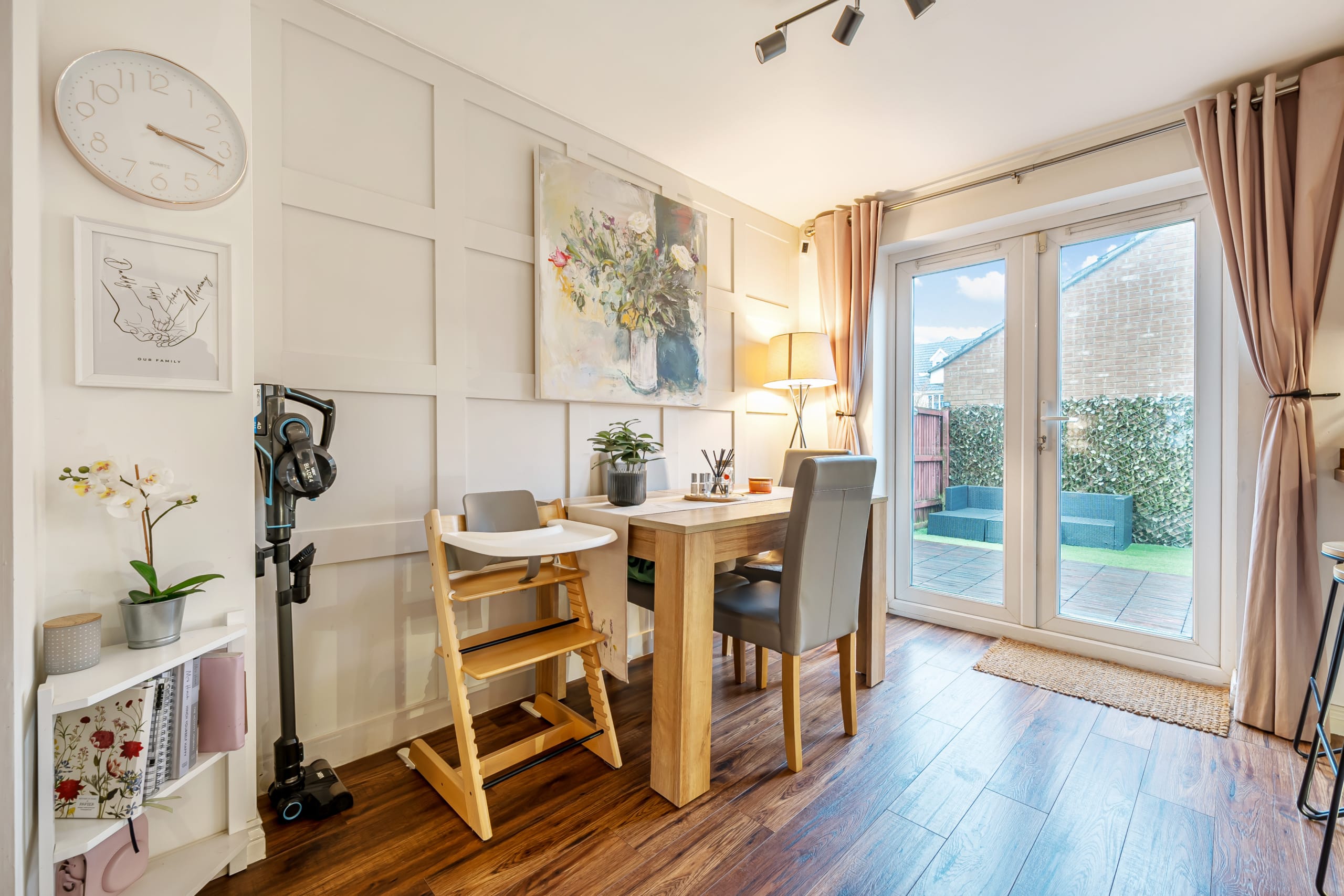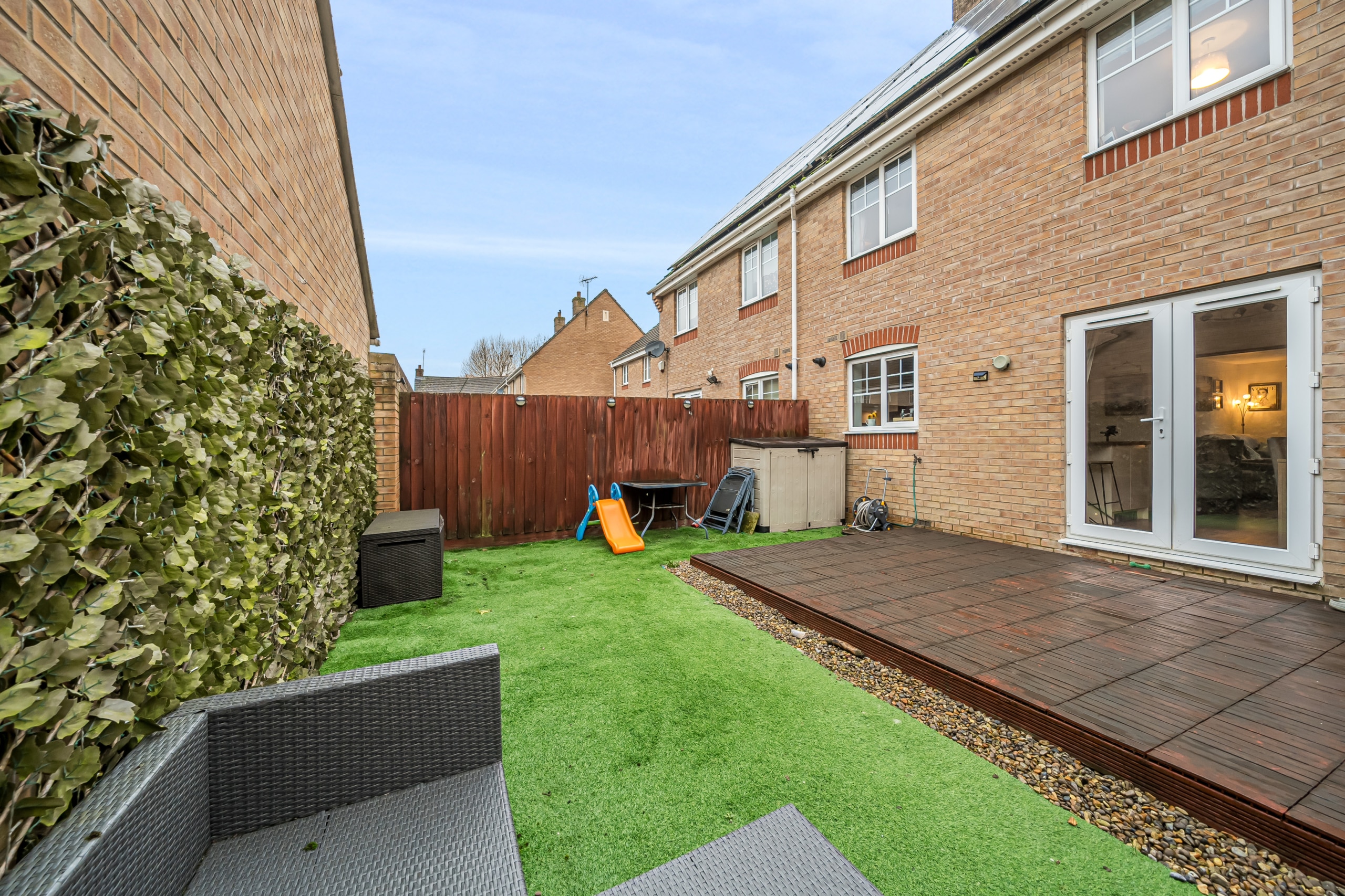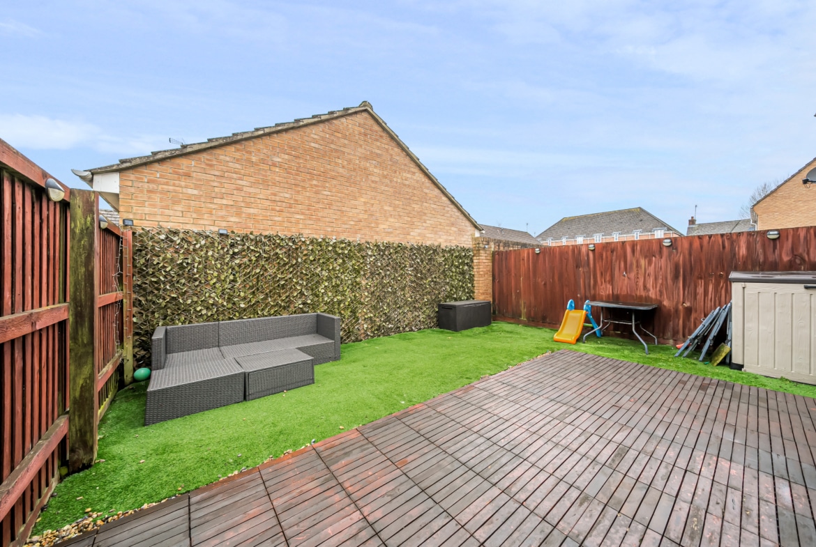 Upon entering, you are welcomed by a spacious hallway leading to a large kitchen and dining area, ideal for entertaining. The dining space opens onto the private, low-maintenance garden, featuring decking and artificial turf. The beautifully decorated living room offers a stylish and comfortable space to relax, while a downstairs cloakroom completes the ground floor.