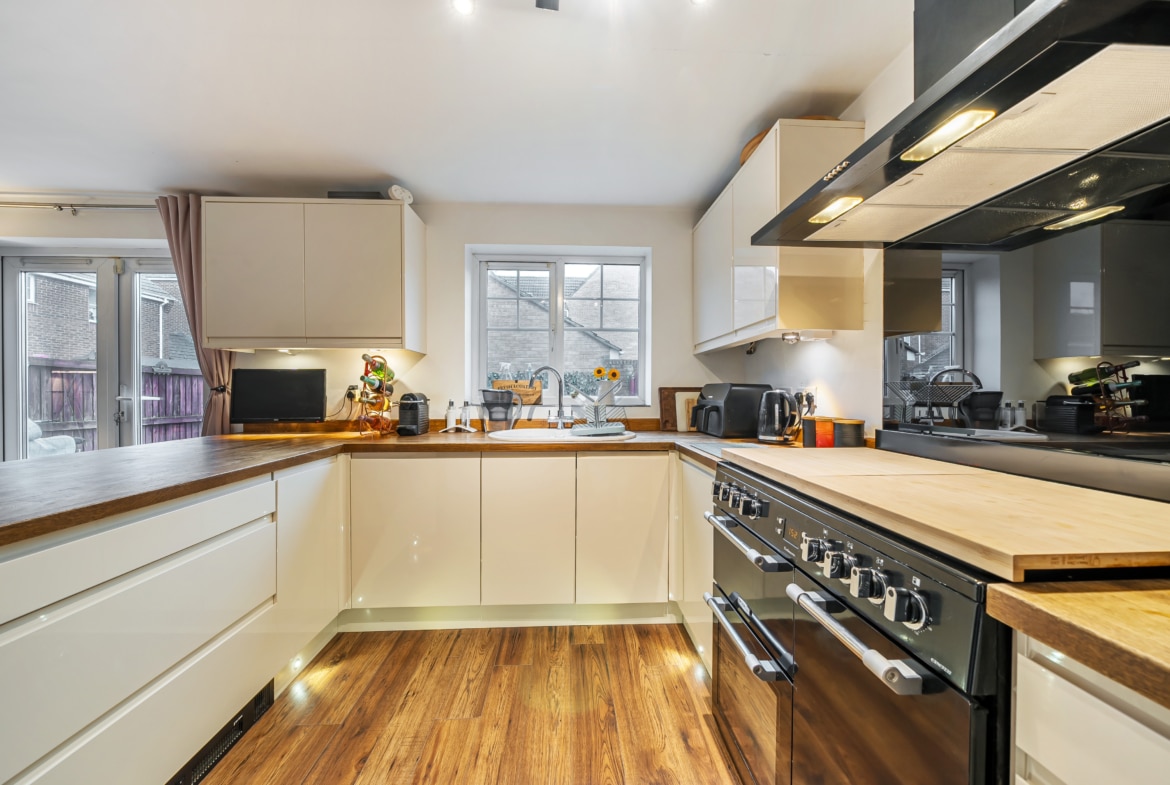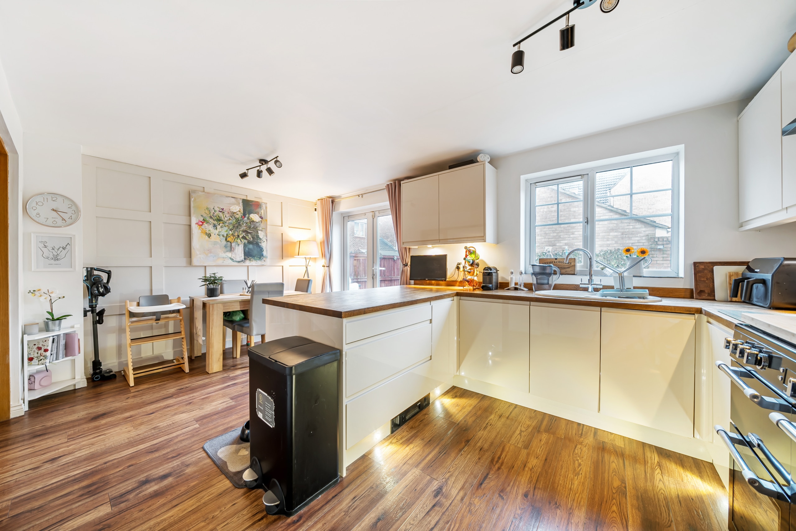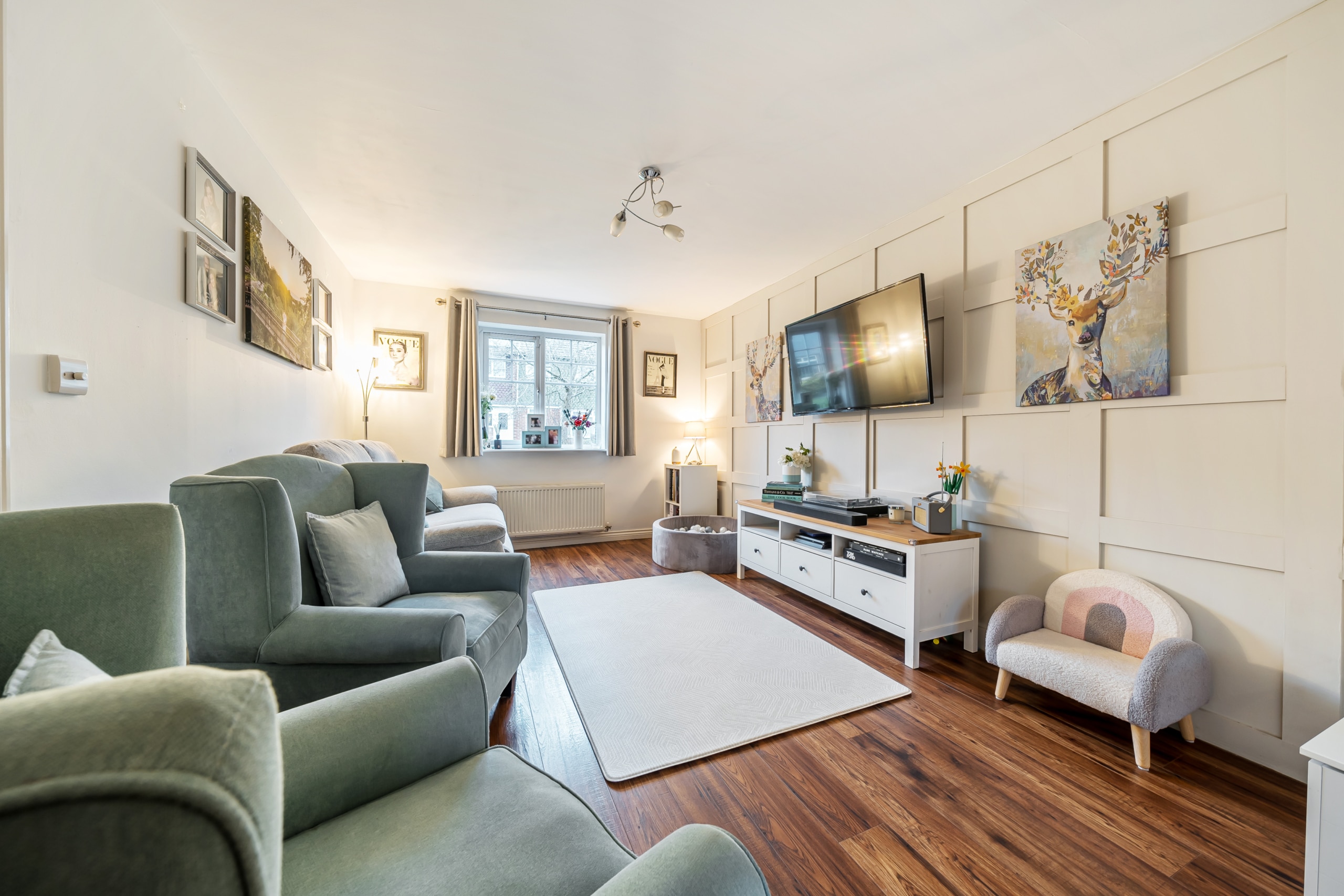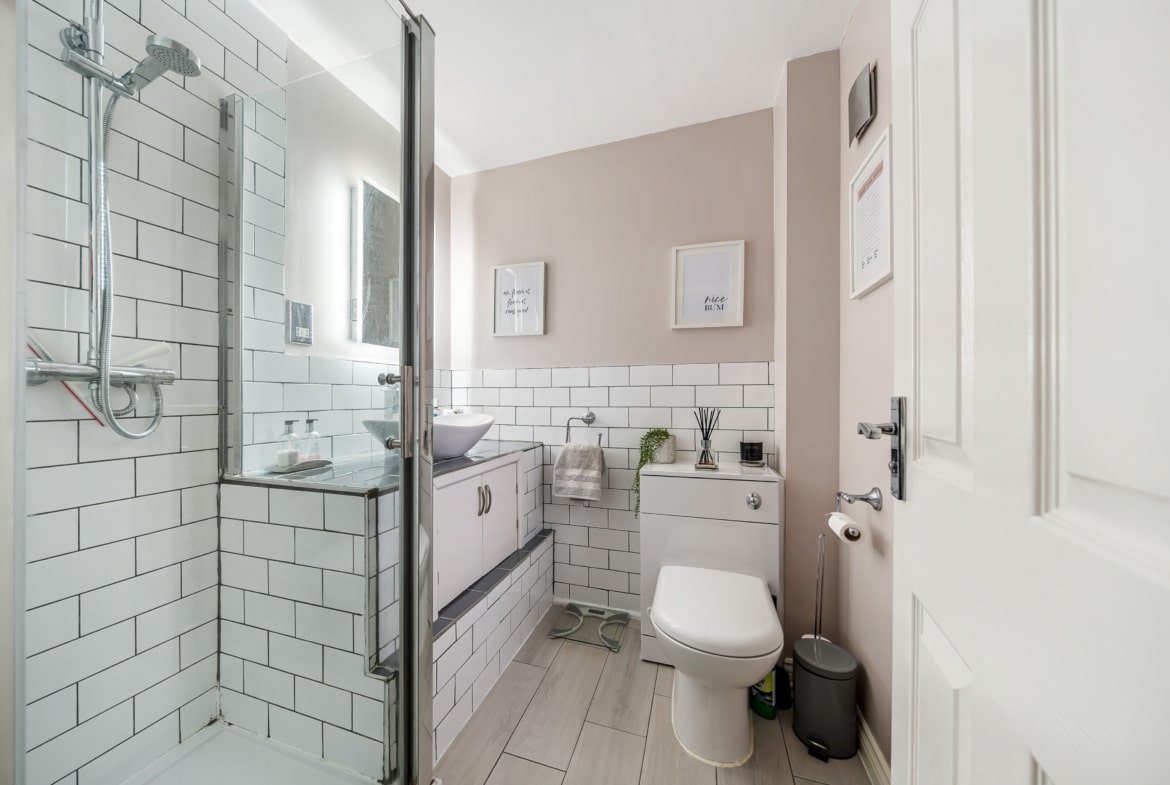 Upon entering, you are welcomed by a spacious hallway leading to a large kitchen and dining area, ideal for entertaining. The dining space opens onto the private, low-maintenance garden, featuring decking and artificial turf. The beautifully decorated living room offers a stylish and comfortable space to relax, while a downstairs cloakroom completes the ground floor.
