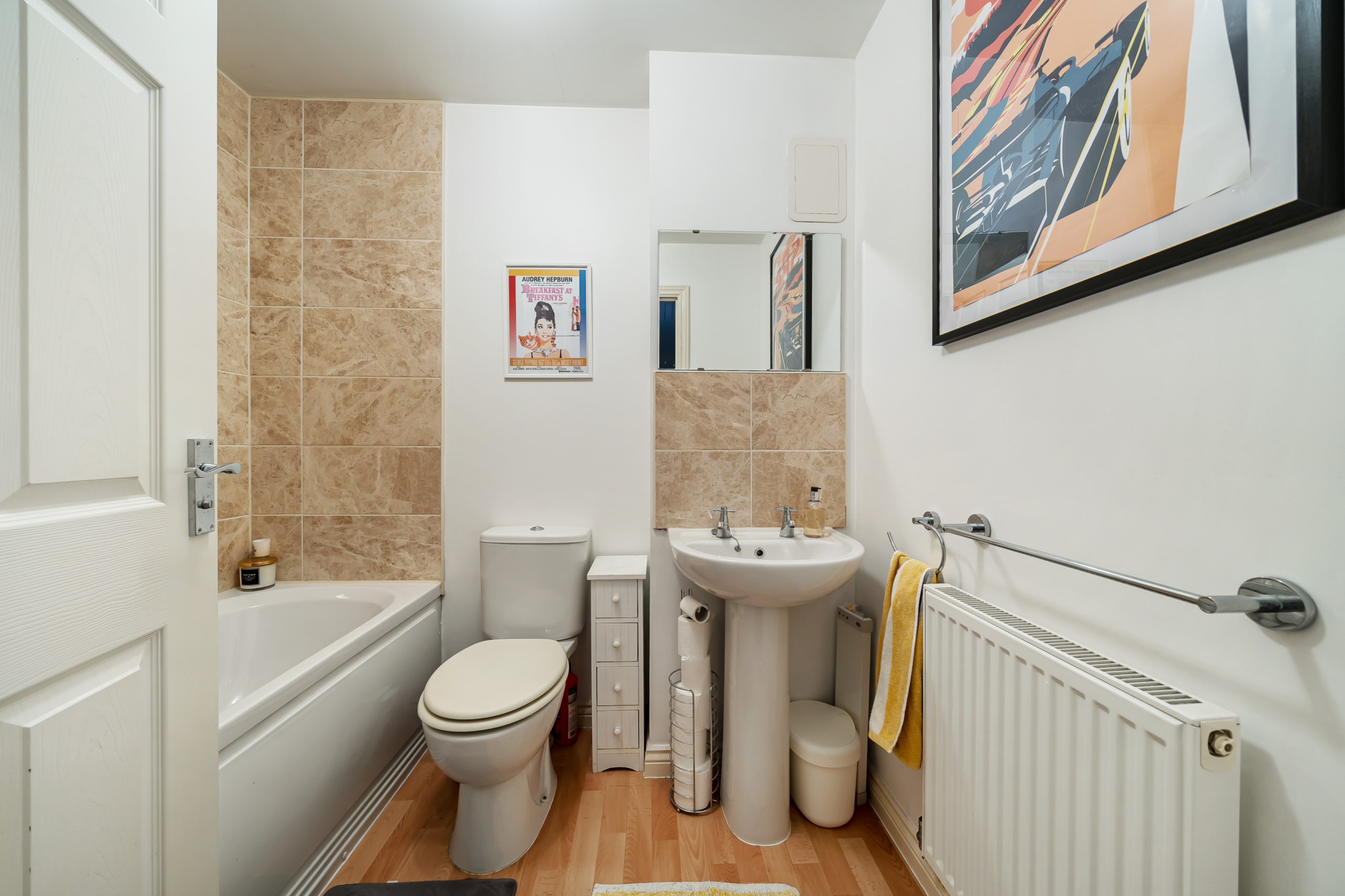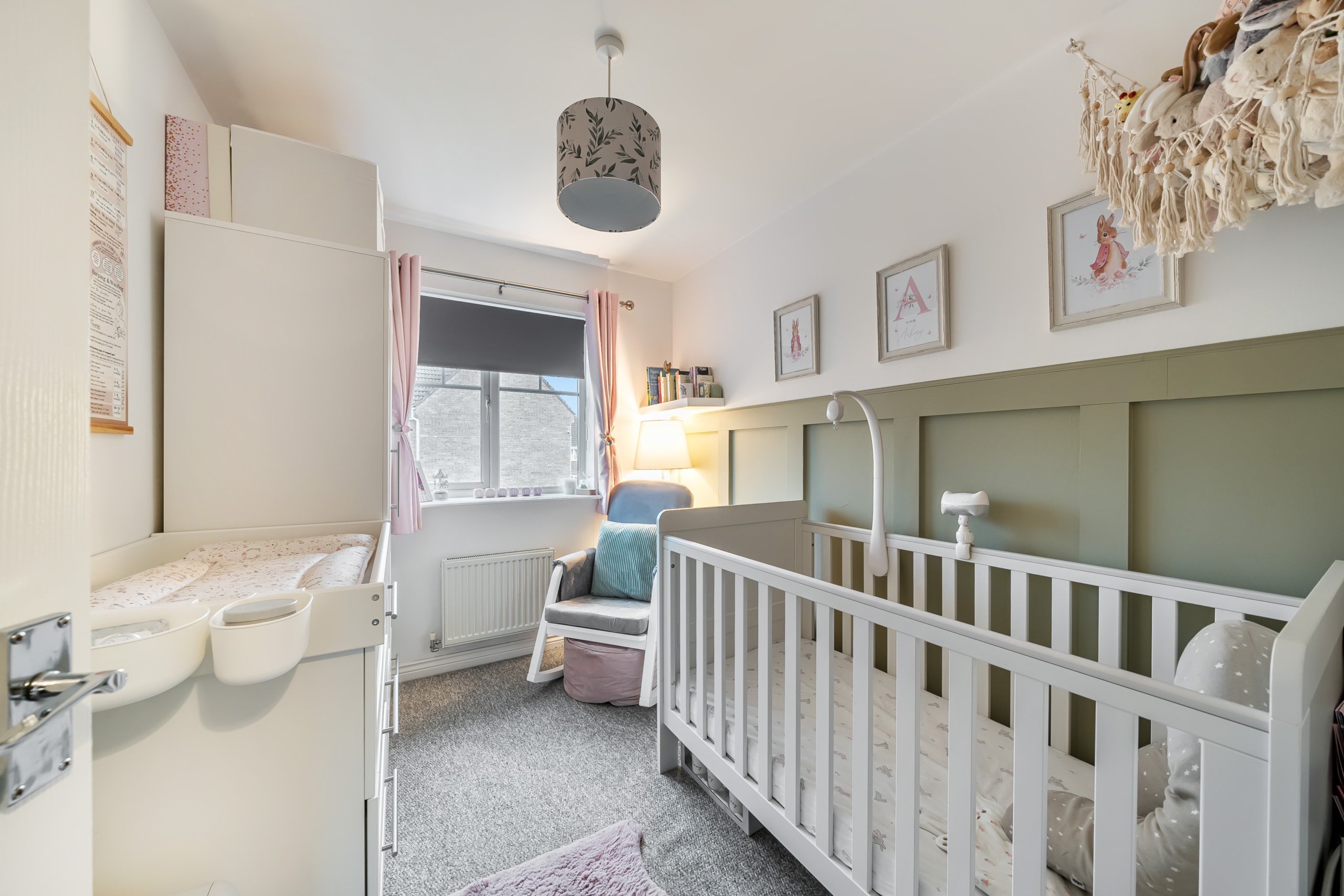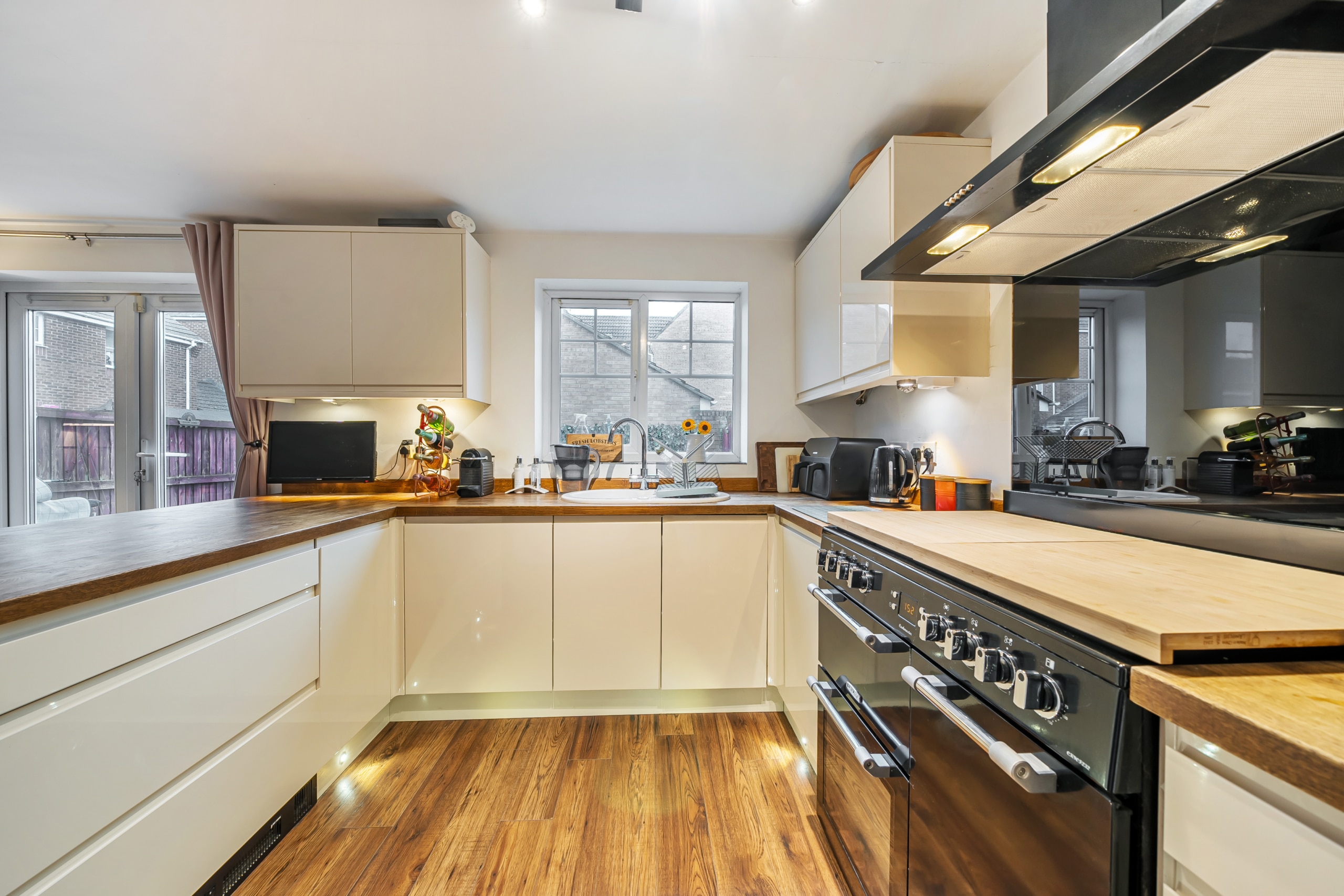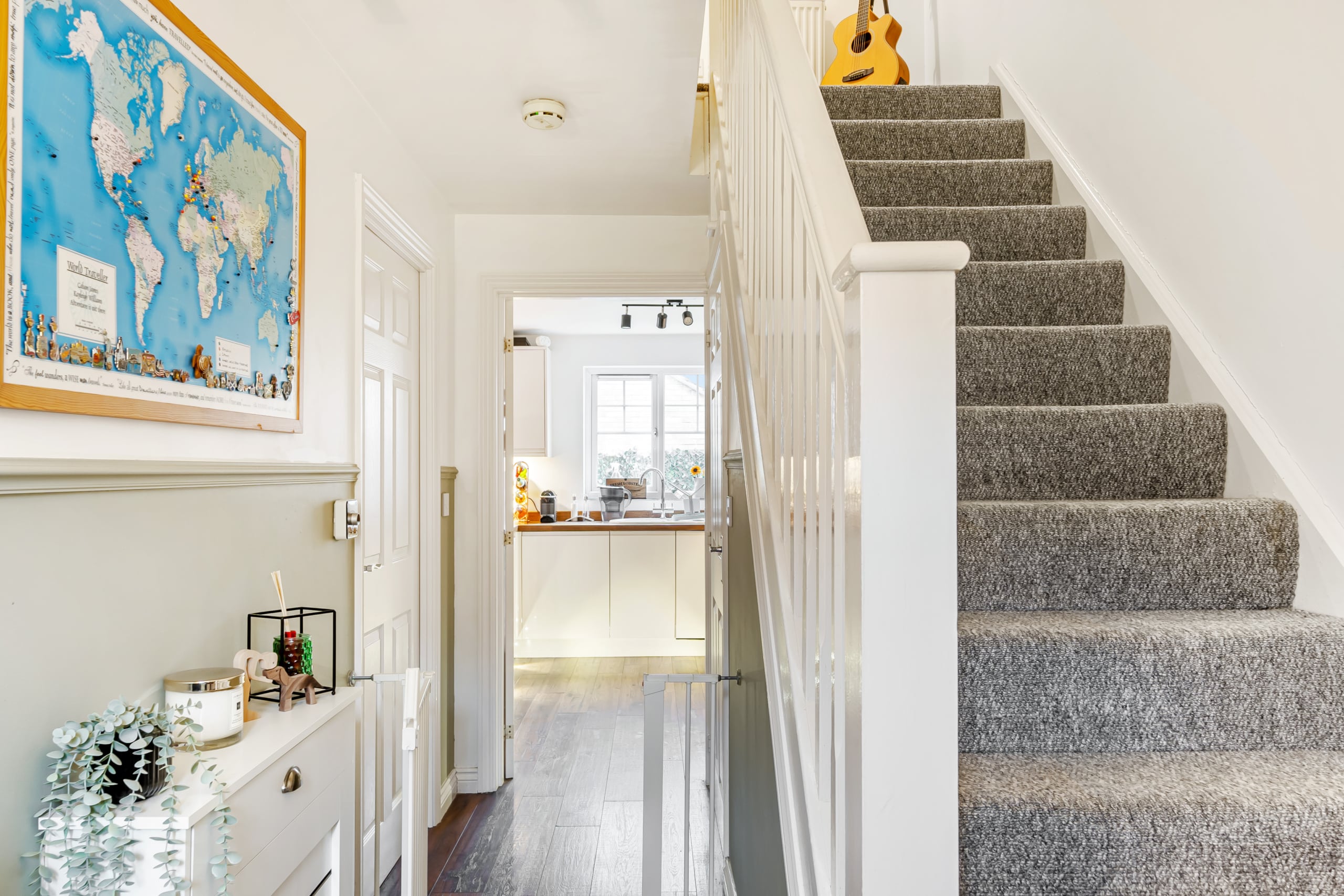Upon entering, you are welcomed by a spacious hallway leading to a large kitchen and dining area, ideal for entertaining. The dining space opens onto the private, low-maintenance garden, featuring decking and artificial turf. The beautifully decorated living room offers a stylish and comfortable space to relax, while a downstairs cloakroom completes the ground floor.