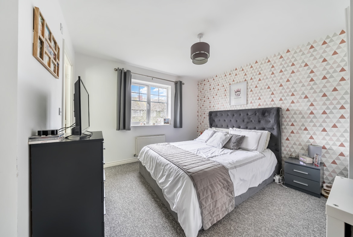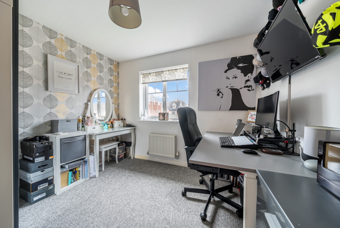 Upstairs, the principal bedroom benefits from fitted wardrobes and an ensuite, providing a touch of luxury. Two further bedrooms, a modern family bathroom, and an airing cupboard add to the home’s practicality and appeal.