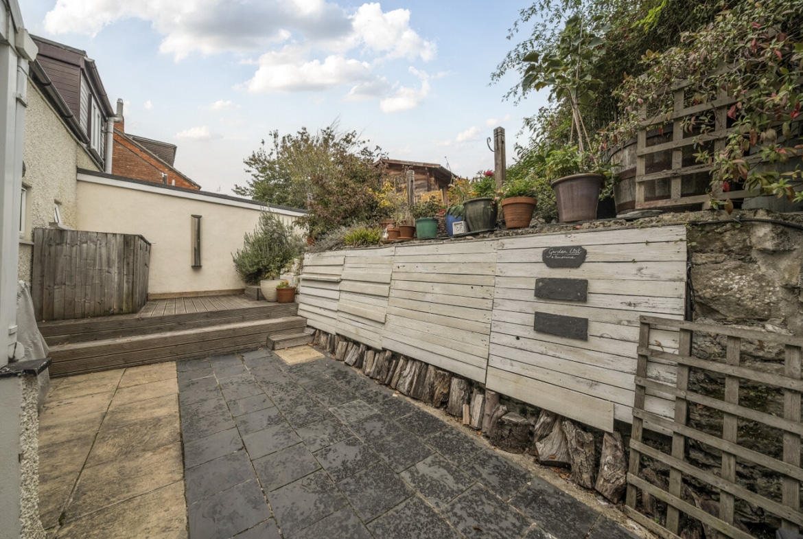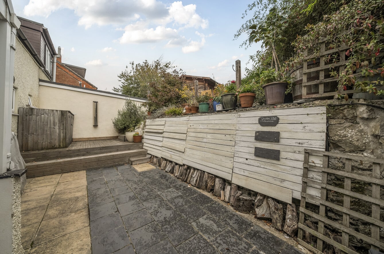 The beautifully kept courtyard style rear garden that is a real sun trap and has been professionally landscaped and offers a fantastic home office/ studio which has power and light.