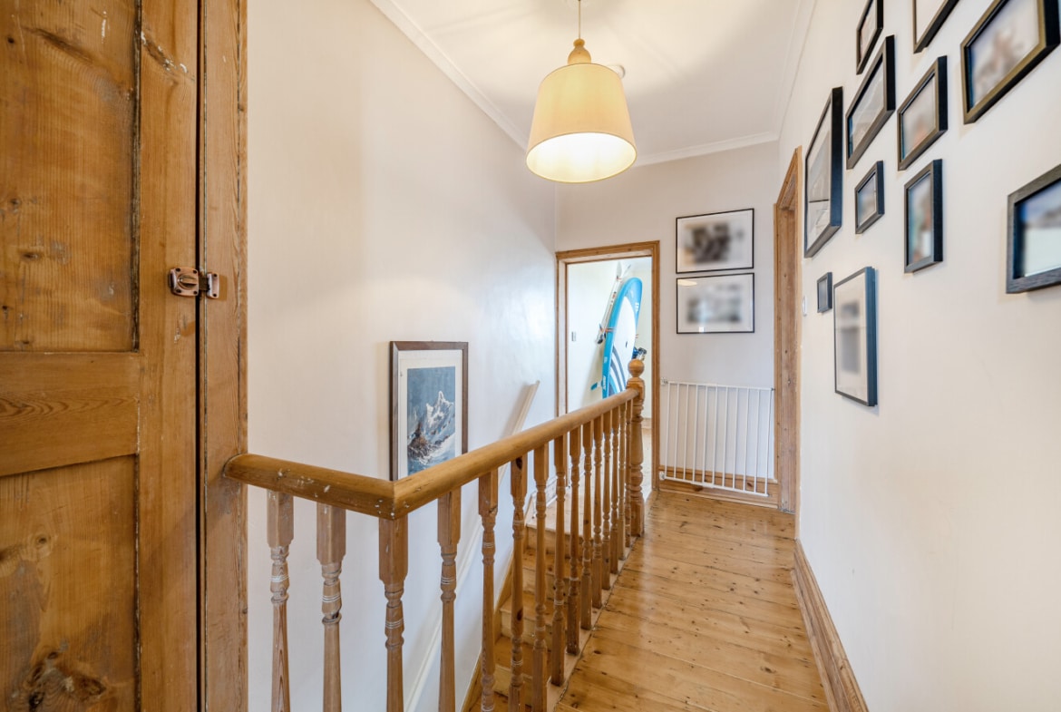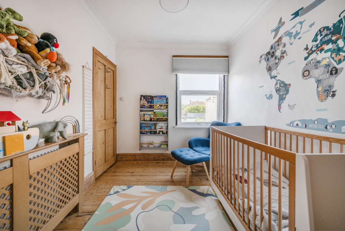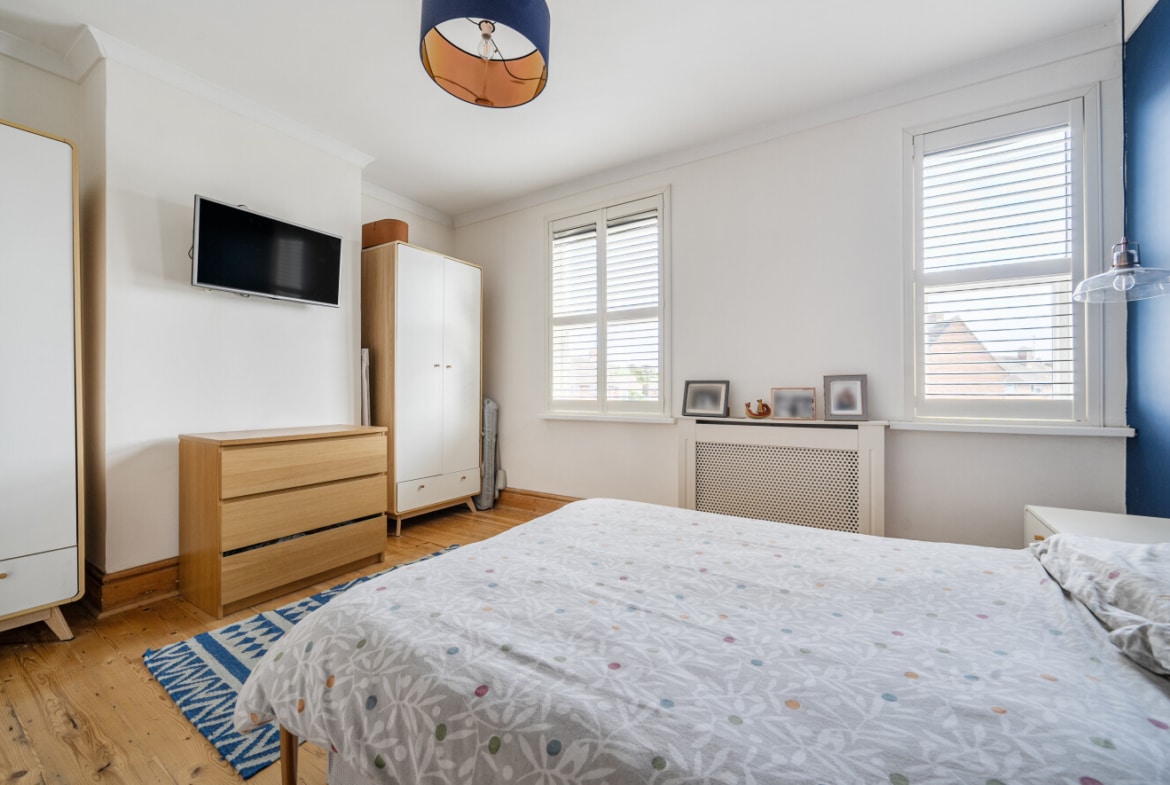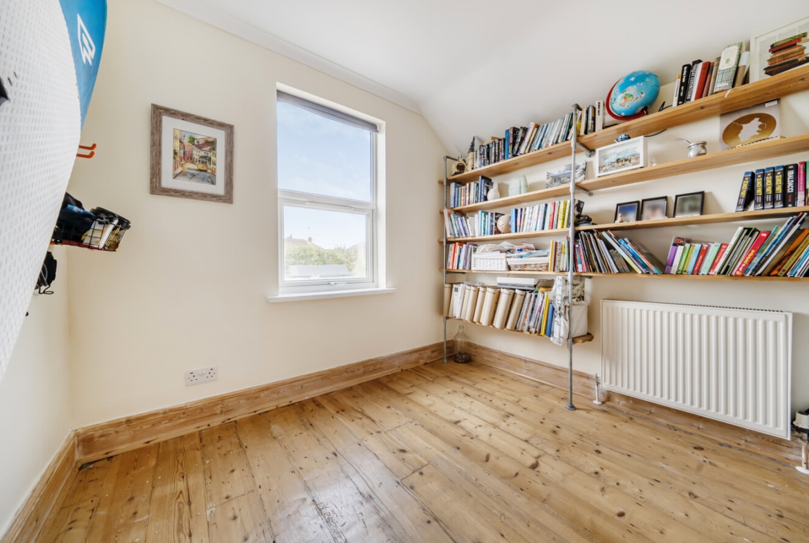 Upstairs, the bedrooms continue to impress with their size and character. At the back, the well-proportioned bedroom is bright and airy, an ideal choice for a child’s room, guest bedroom, or home office. The second bedroom is another generously sized room, perfect for growing families or as a versatile space for hobbies or study. At the front, the spacious master bedroom boasts ample room to create a relaxing retreat, with large windows that flood the space with natural light and highlight the room’s charming features.
