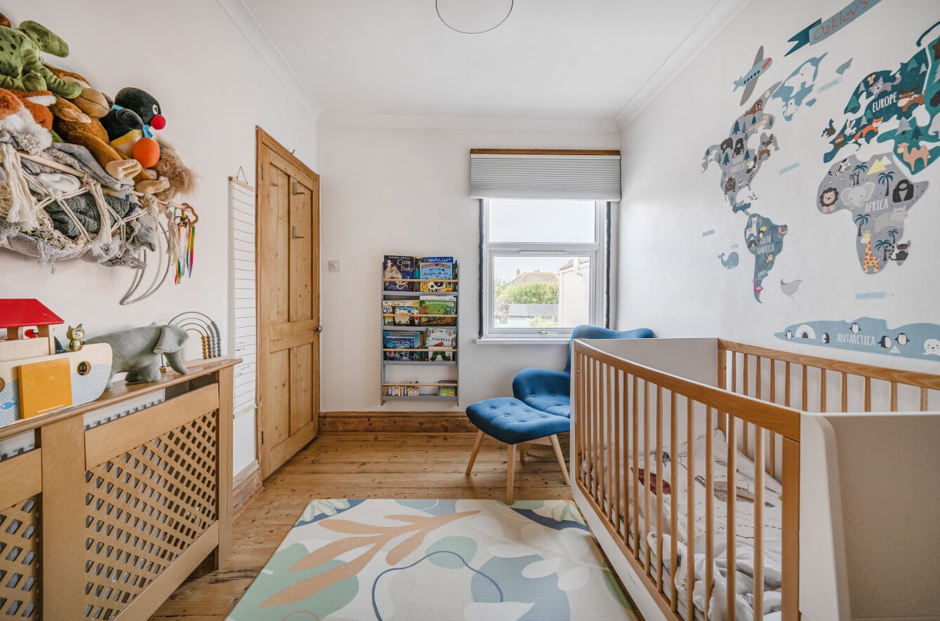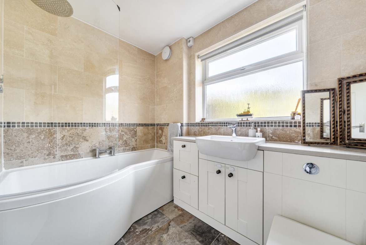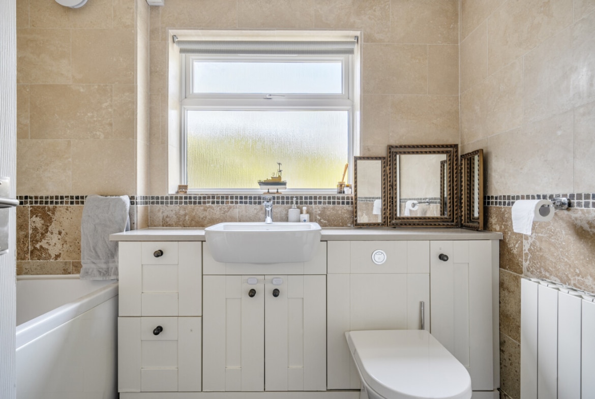 Upstairs, the bedrooms continue to impress with their size and character. At the back, the well-proportioned bedroom is bright and airy, an ideal choice for a child’s room, guest bedroom, or home office. The second bedroom is another generously sized room, perfect for growing families or as a versatile space for hobbies or study. At the front, the spacious master bedroom boasts ample room to create a relaxing retreat, with large windows that flood the space with natural light and highlight the room’s charming features.