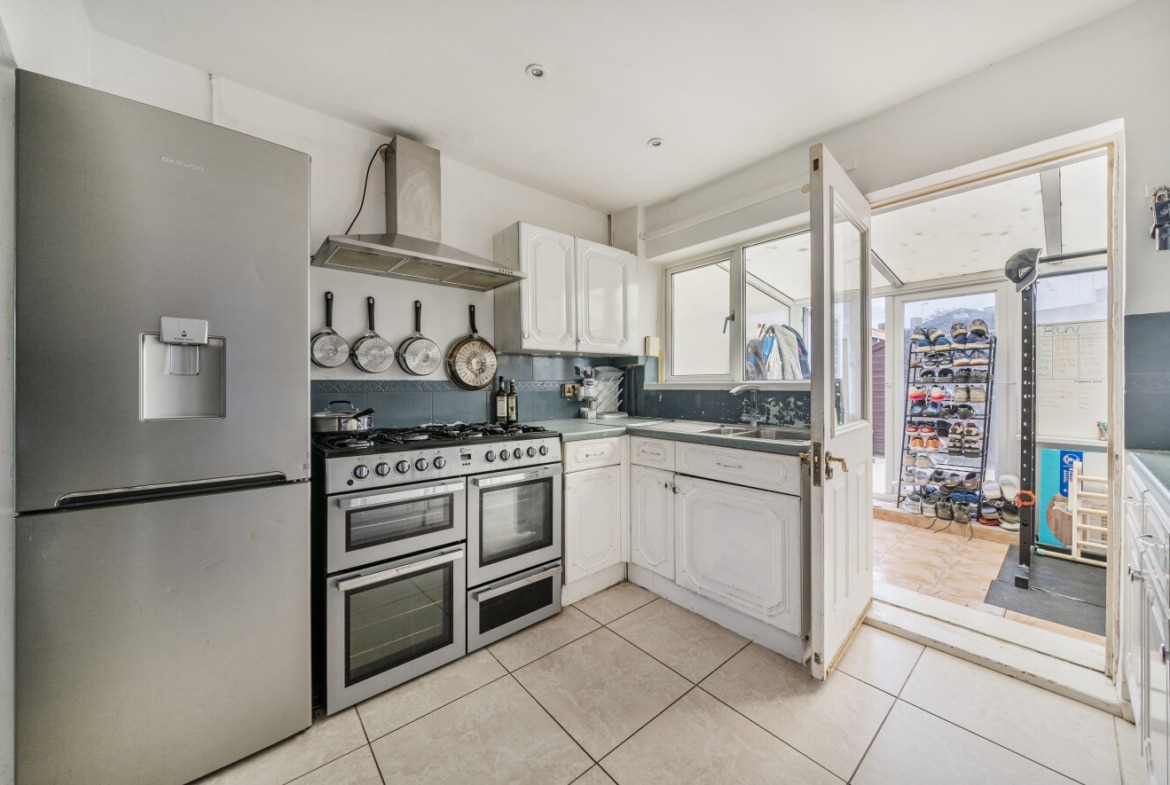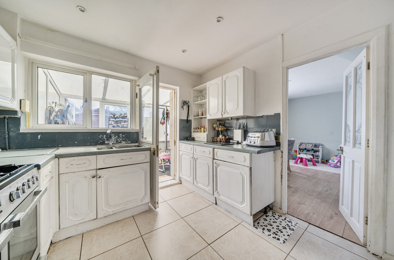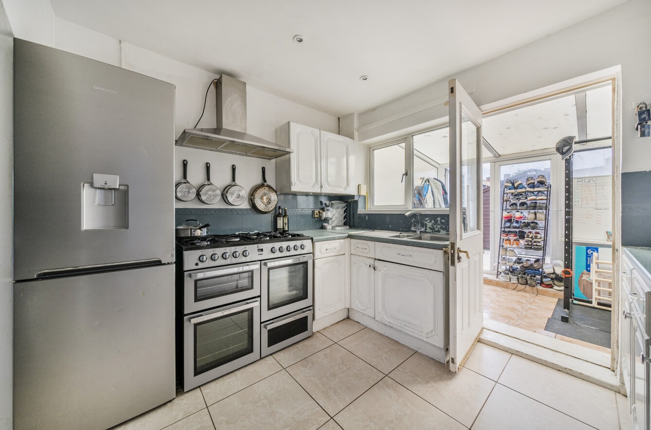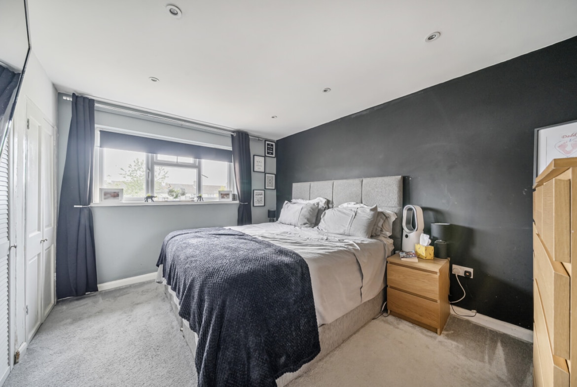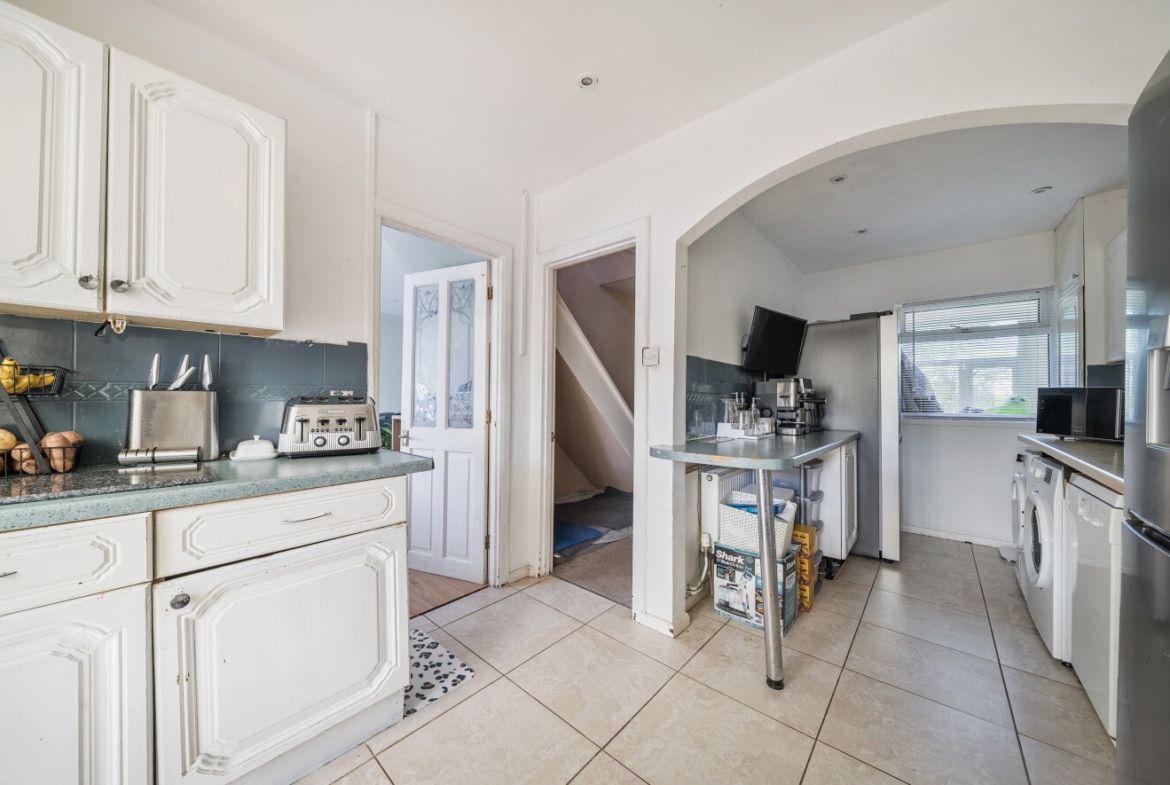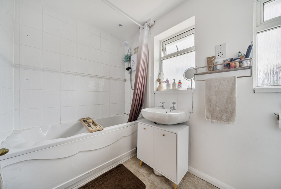 The kitchen is generously sized, offering ample worktop and cupboard space, and flows directly into the bright conservatory — a perfect spot for a breakfast area, home office, or relaxing space overlooking the garden. Upstairs, the property offers two well-proportioned double bedrooms with excellent storage options, and a third bedroom that includes a fitted wardrobe and additional space for further furnishings. A modern family bathroom completes the upper floor, featuring a bath with an overhead shower.