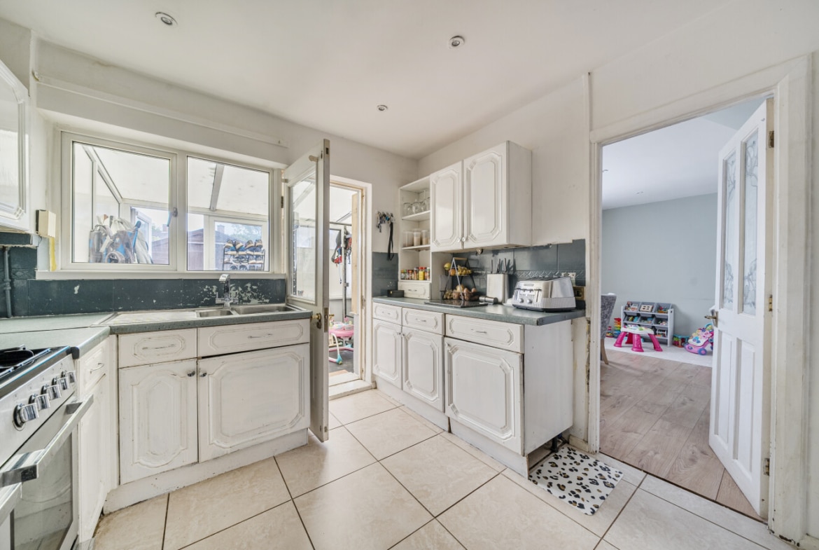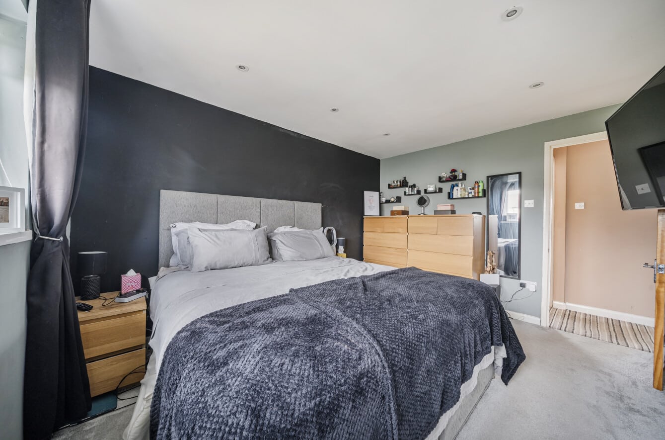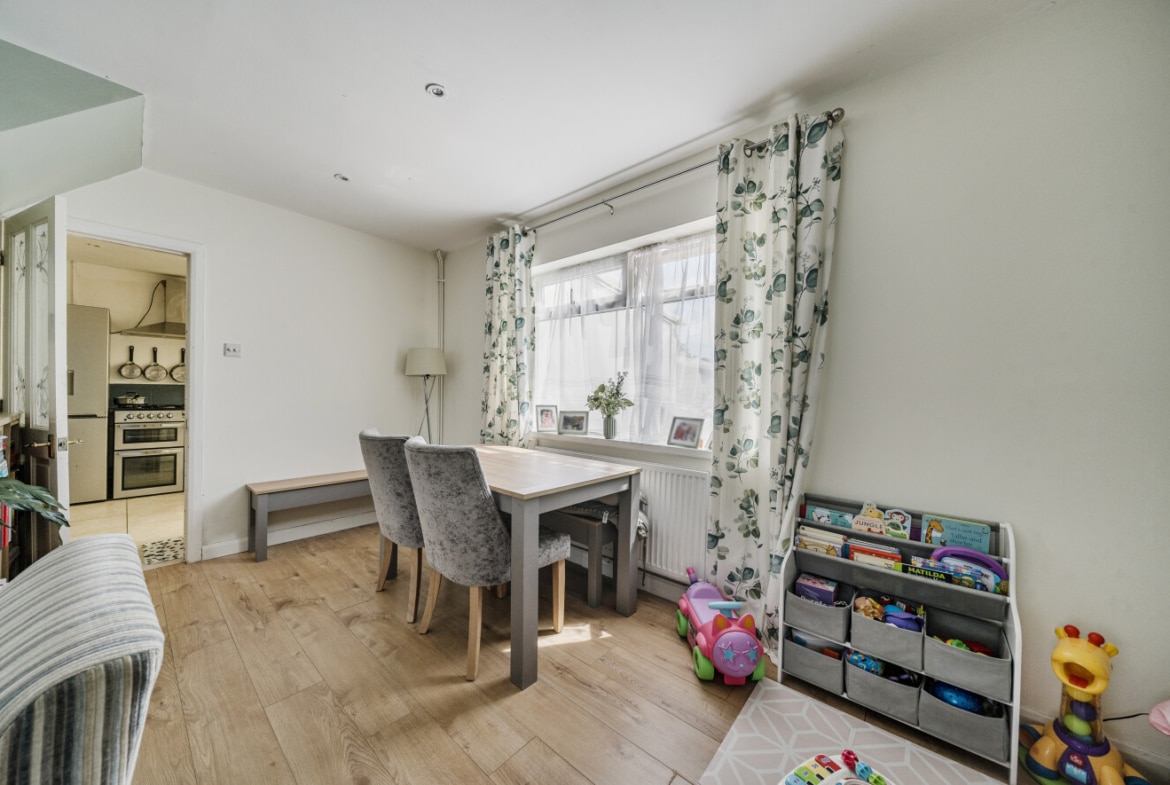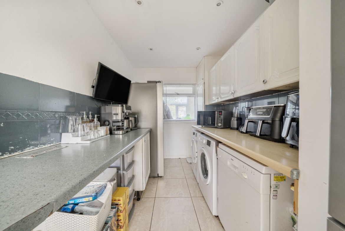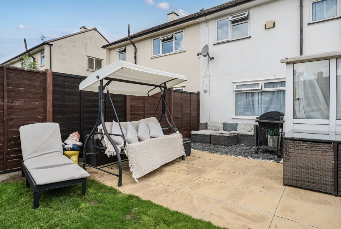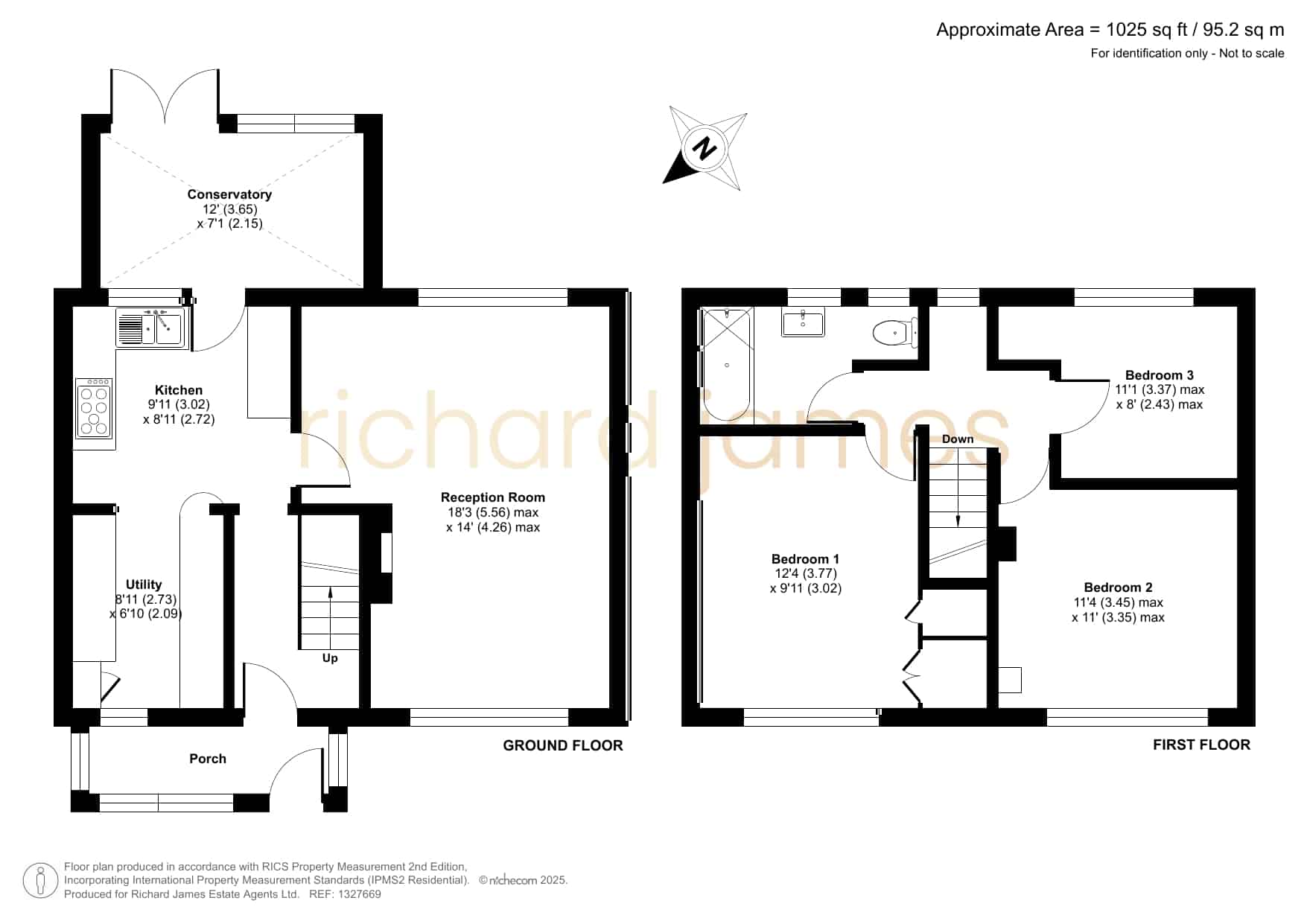 The kitchen is generously sized, offering ample worktop and cupboard space, and flows directly into the bright conservatory — a perfect spot for a breakfast area, home office, or relaxing space overlooking the garden. Upstairs, the property offers two well-proportioned double bedrooms with excellent storage options, and a third bedroom that includes a fitted wardrobe and additional space for further furnishings. A modern family bathroom completes the upper floor, featuring a bath with an overhead shower.