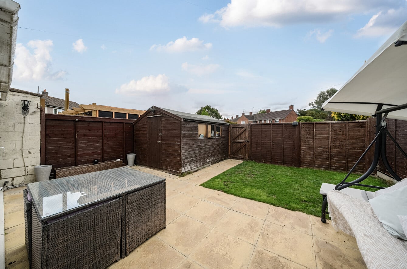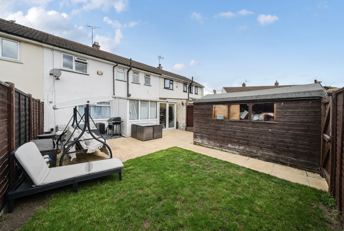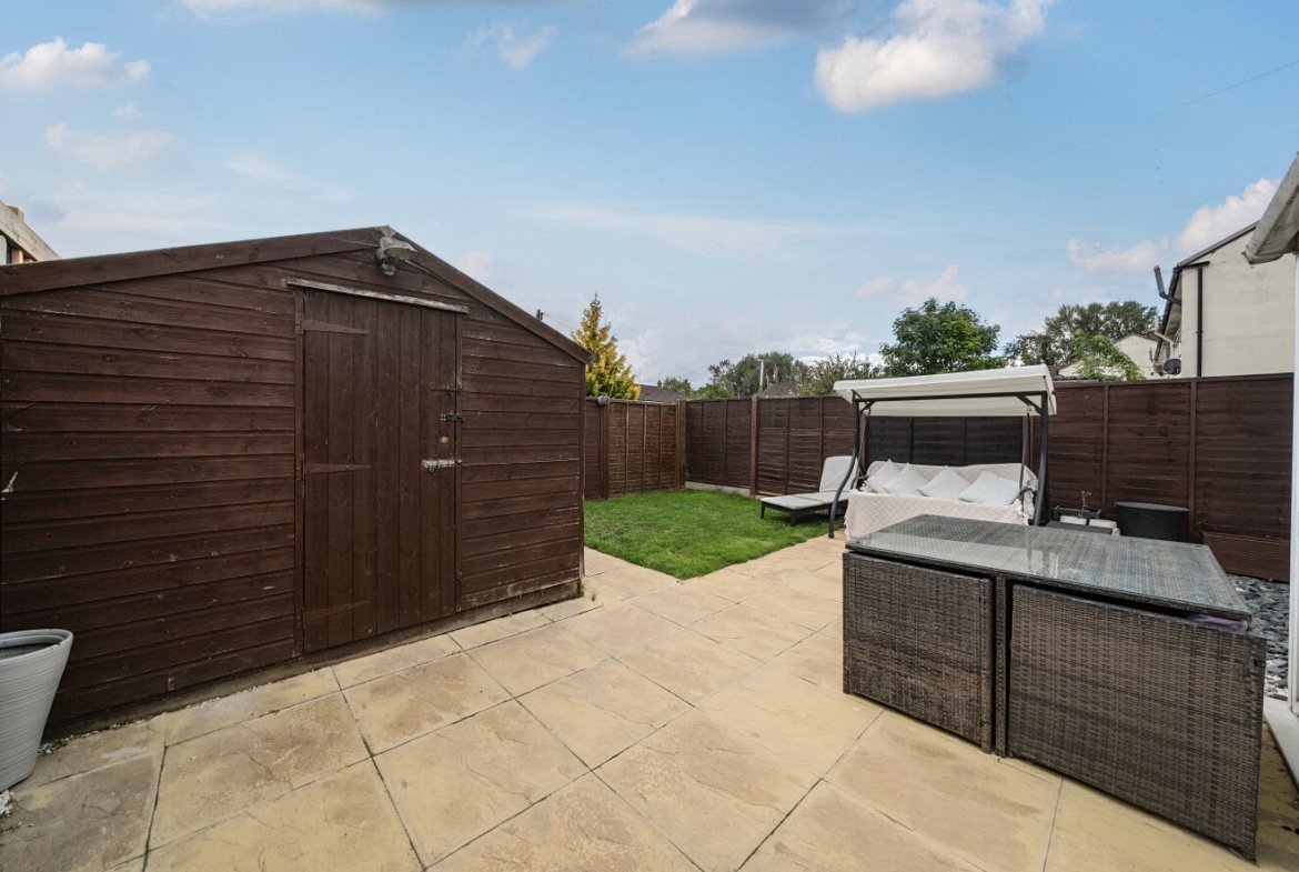 Outside, the private rear garden provides a peaceful escape, complete with a large shed ideal for storage. To the rear of the property, a spacious driveway offers off-road parking for up to three vehicles — a rare and valuable feature in a home of this kind.