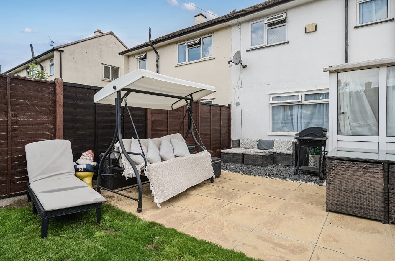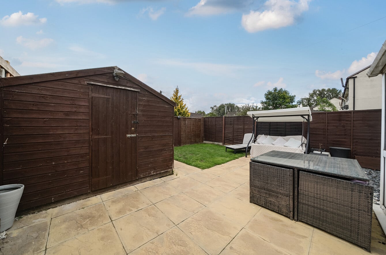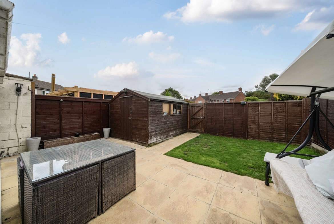 Outside, the private rear garden provides a peaceful escape, complete with a large shed ideal for storage. To the rear of the property, a spacious driveway offers off-road parking for up to three vehicles — a rare and valuable feature in a home of this kind.
