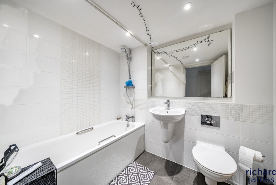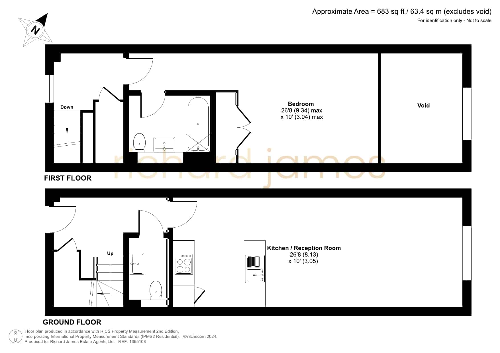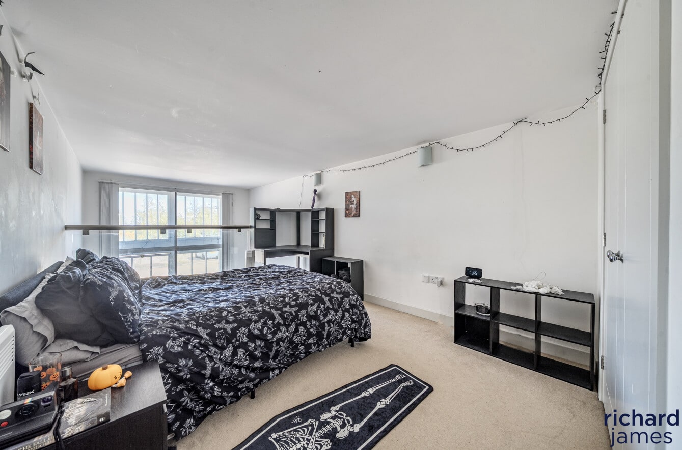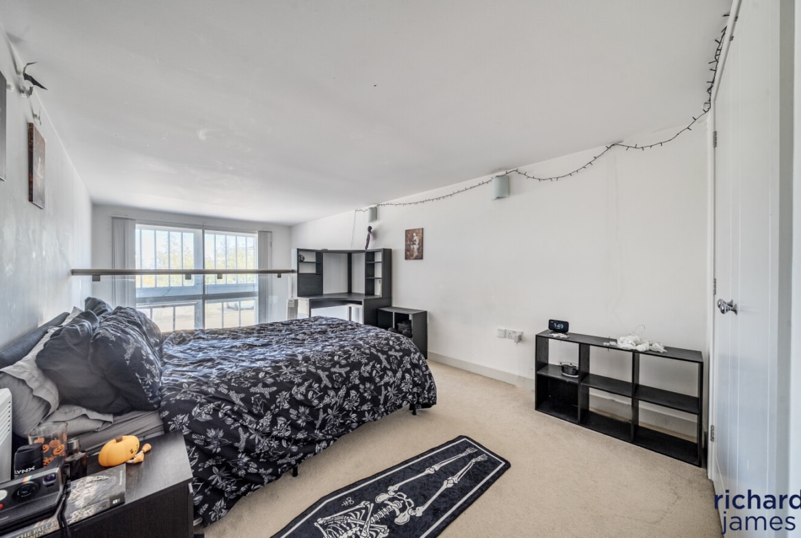 Upstairs, the mezzanine level hosts a generous double bedroom with fitted wardrobes and a stylish glass balcony overlooking the living area. A well-appointed bathroom, complete with shower over bath, is also located on this floor.