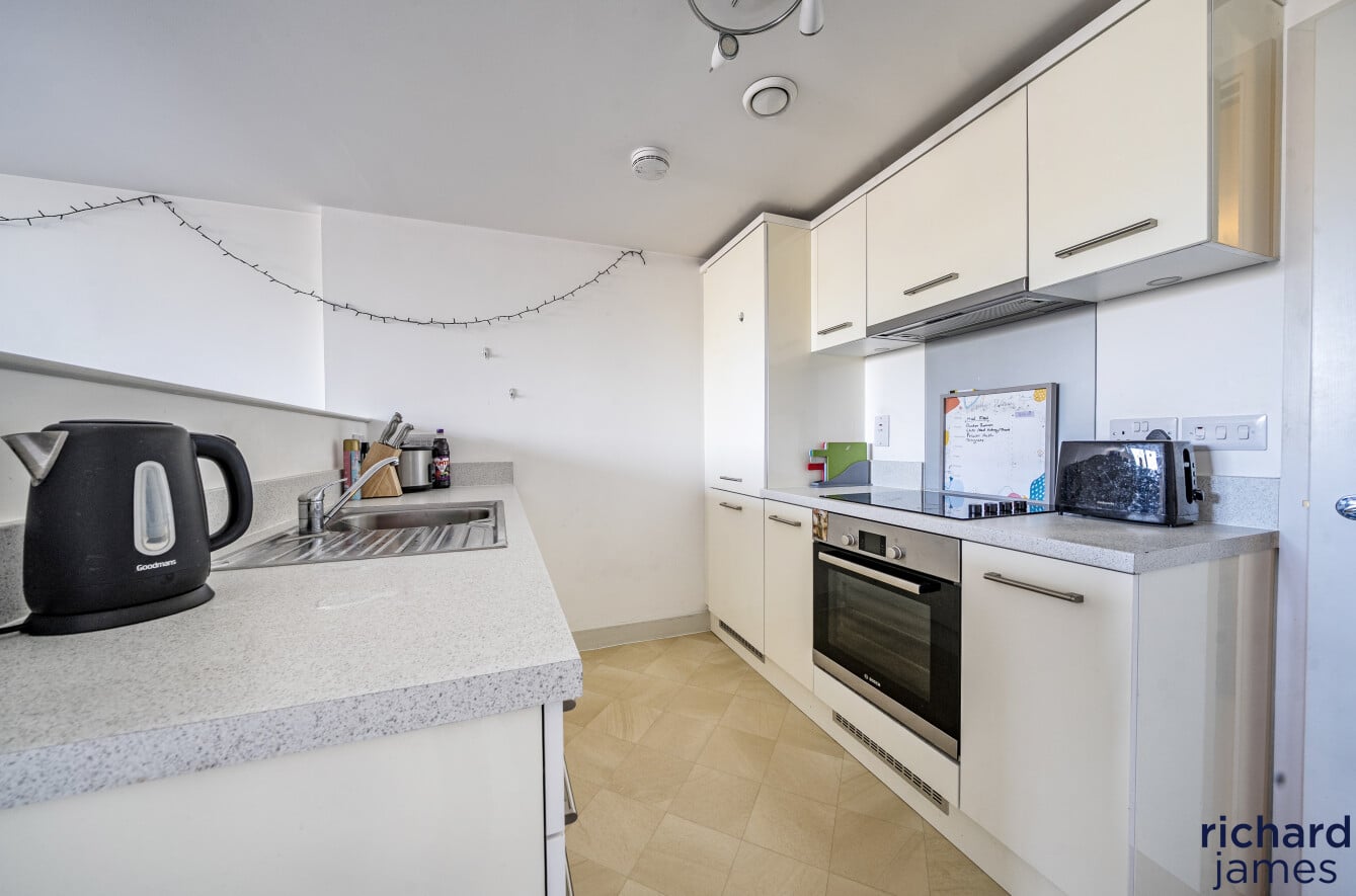 The property features a bright and spacious open-plan living area, enhanced by dual-aspect windows that flood the space with natural light. The modern kitchen comes fully fitted with integrated appliances, including a fridge/freezer, dishwasher, and washer/dryer. A convenient downstairs cloakroom completes the ground floor.