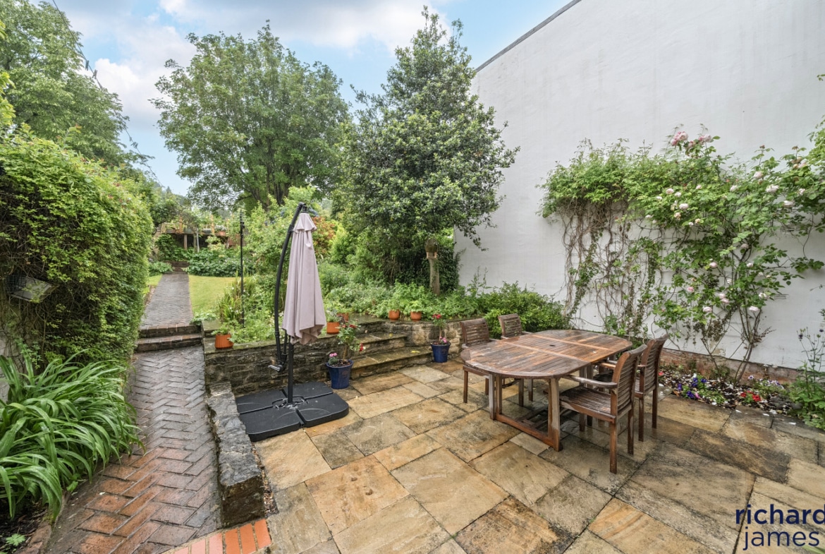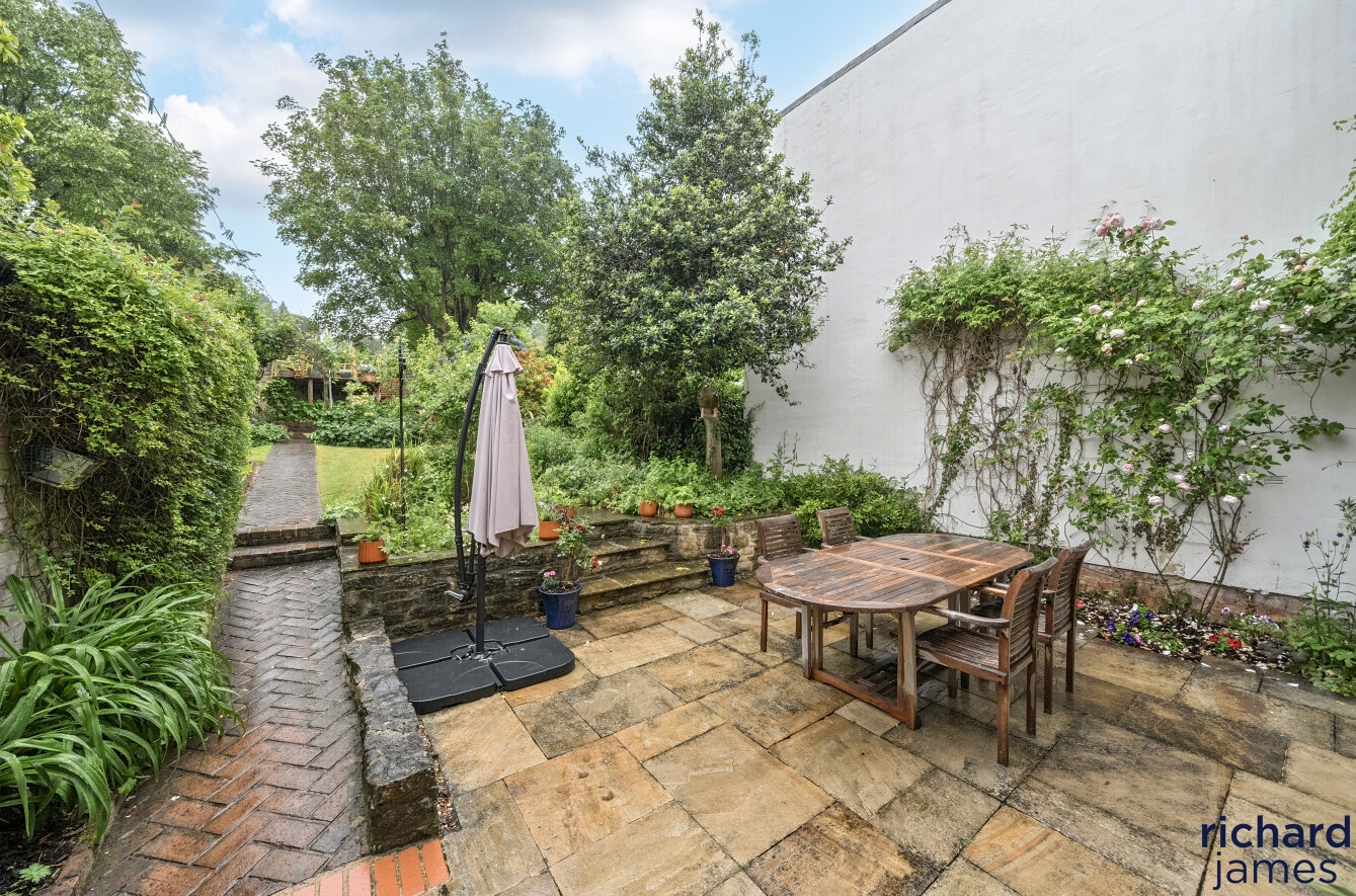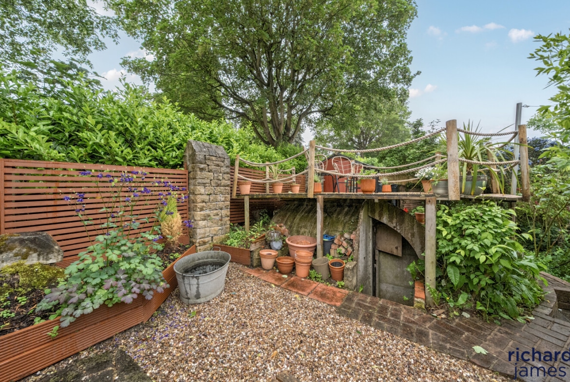 To the rear is a secluded south facing garden with patio seating and barbecue area leading to a generous lawn and vegetable patch. At the rear of the garden is a WWII bunker/Anderson shelter with a sun deck built on top offering an ideal spot for evening drinks and catching the last of the day’s sunshine.
