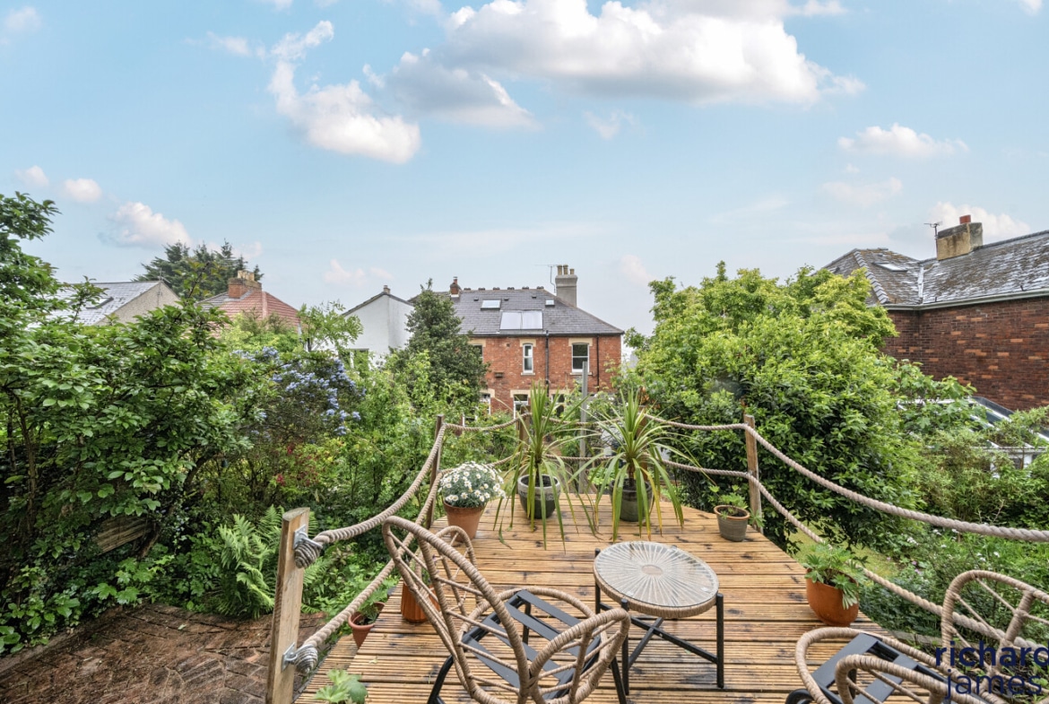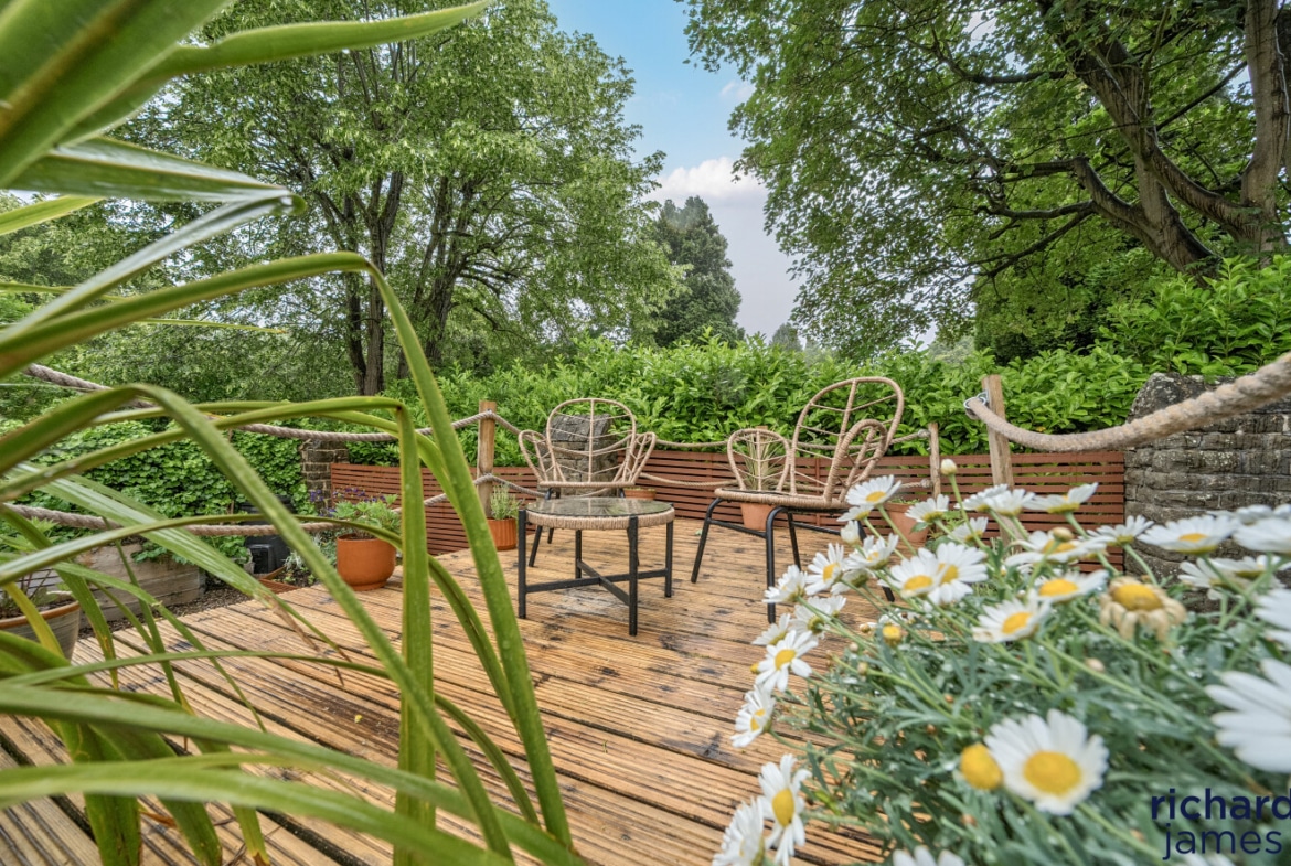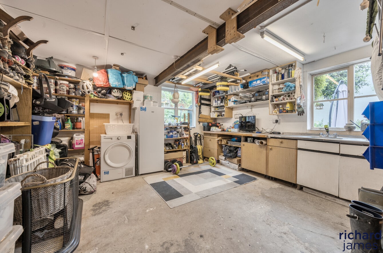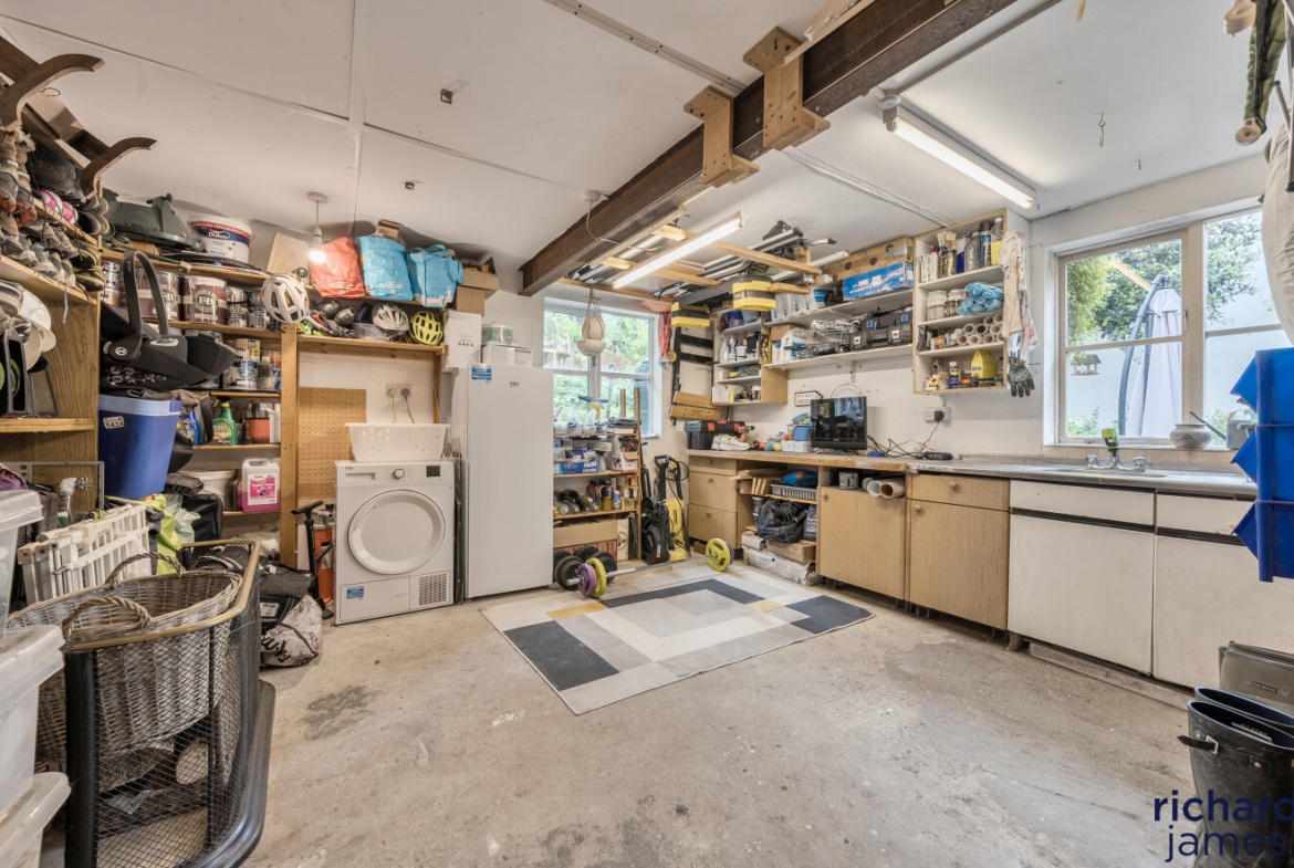 To the rear is a secluded south facing garden with patio seating and barbecue area leading to a generous lawn and vegetable patch. At the rear of the garden is a WWII bunker/Anderson shelter with a sun deck built on top offering an ideal spot for evening drinks and catching the last of the day’s sunshine.