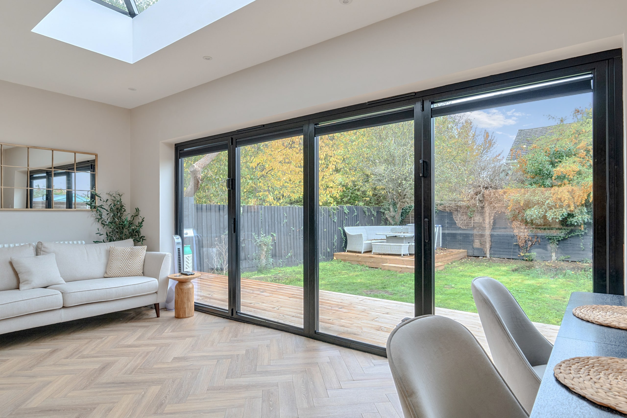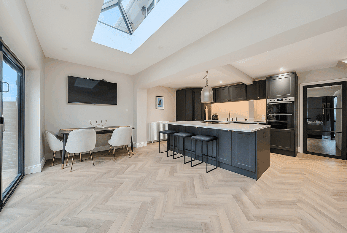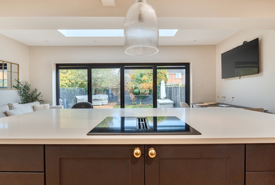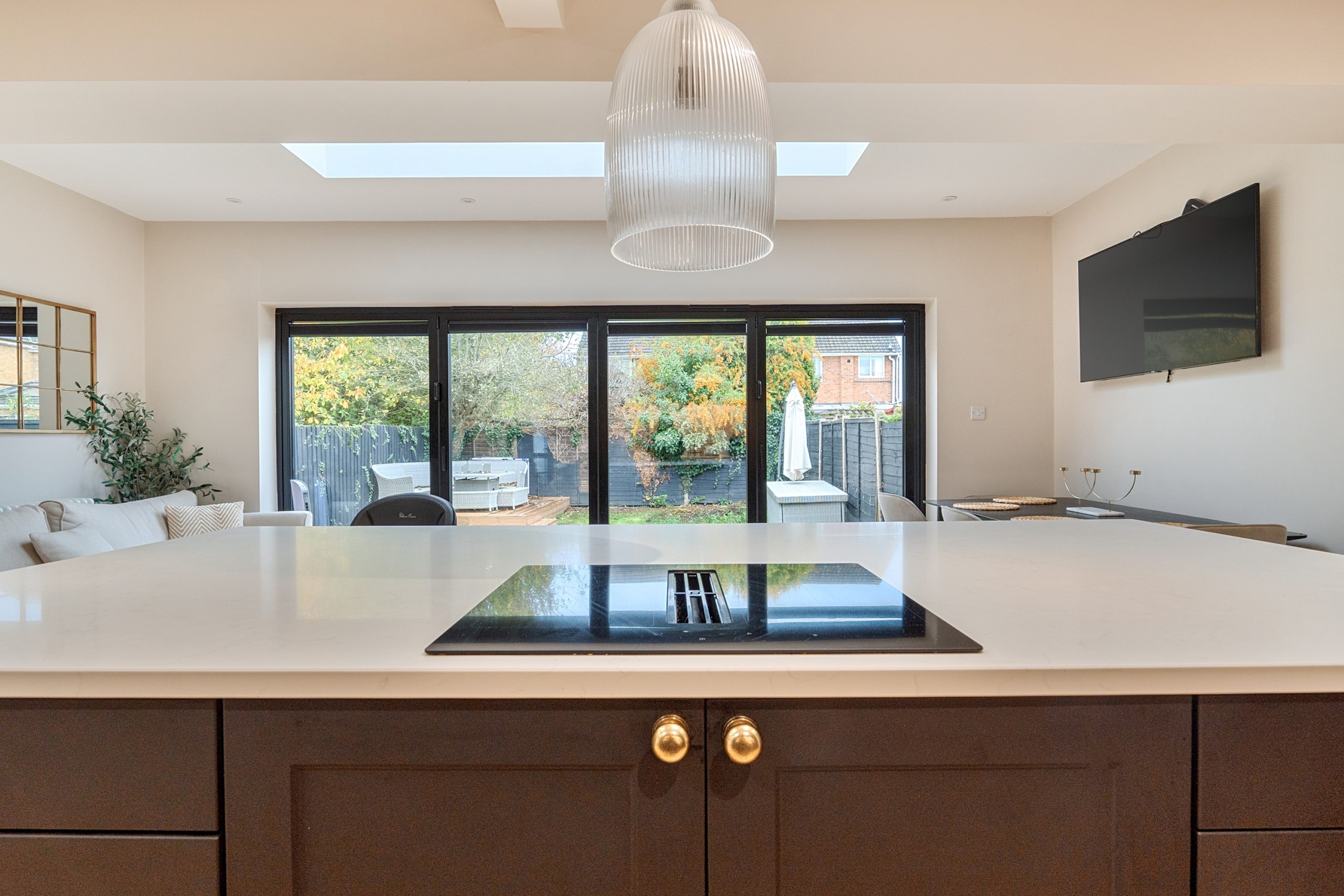 At the heart of the home lies a spectacular open-plan kitchen and dining area. With marble worktops, an integrated double oven, induction hob, and a generous walk-in larder, the space is designed for both everyday living and entertaining. Bi-folding doors open onto a beautifully landscaped rear garden, seamlessly connecting indoor and outdoor spaces.