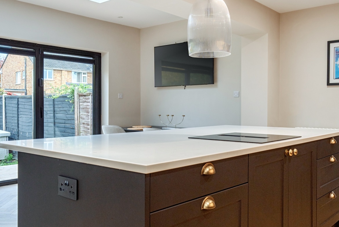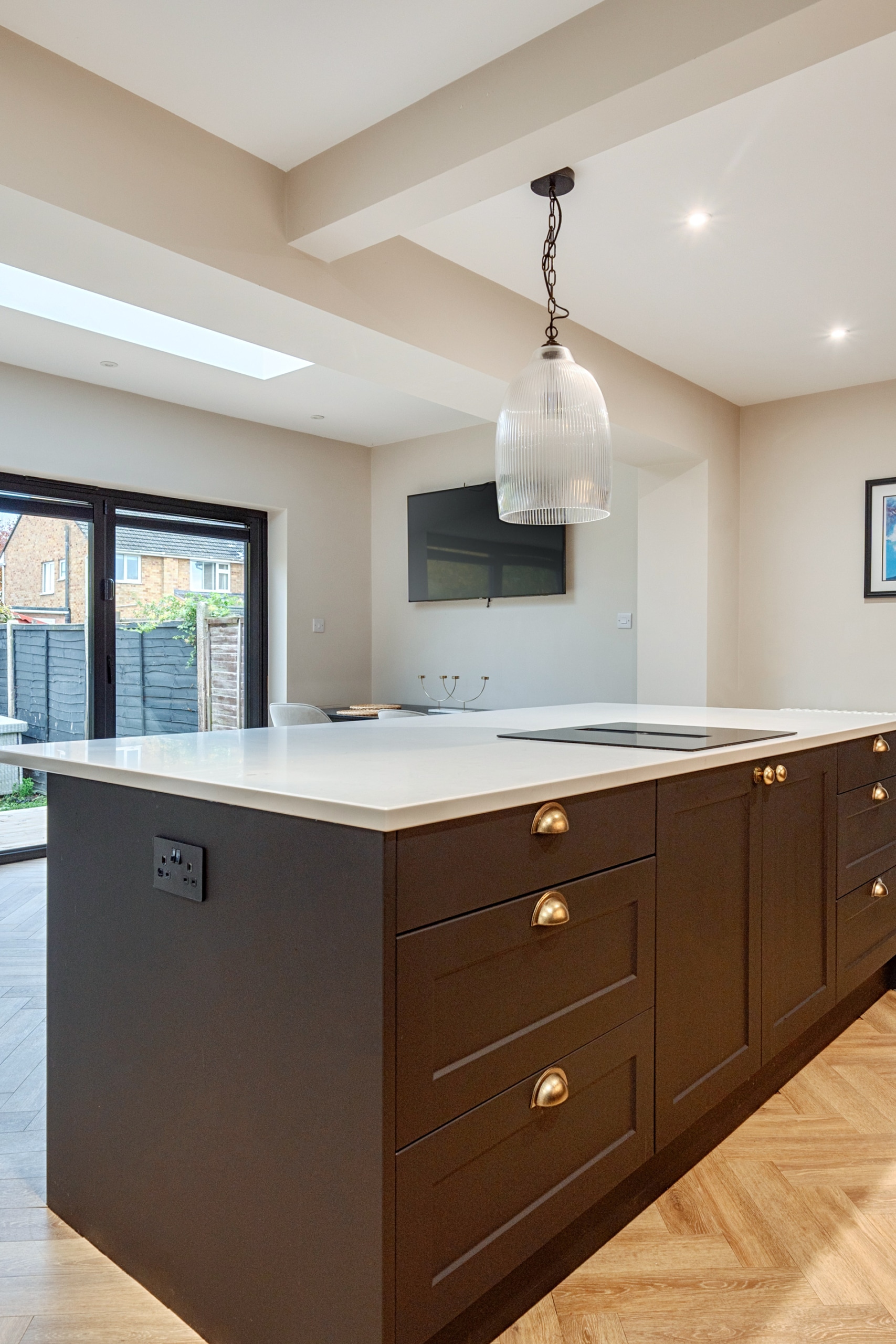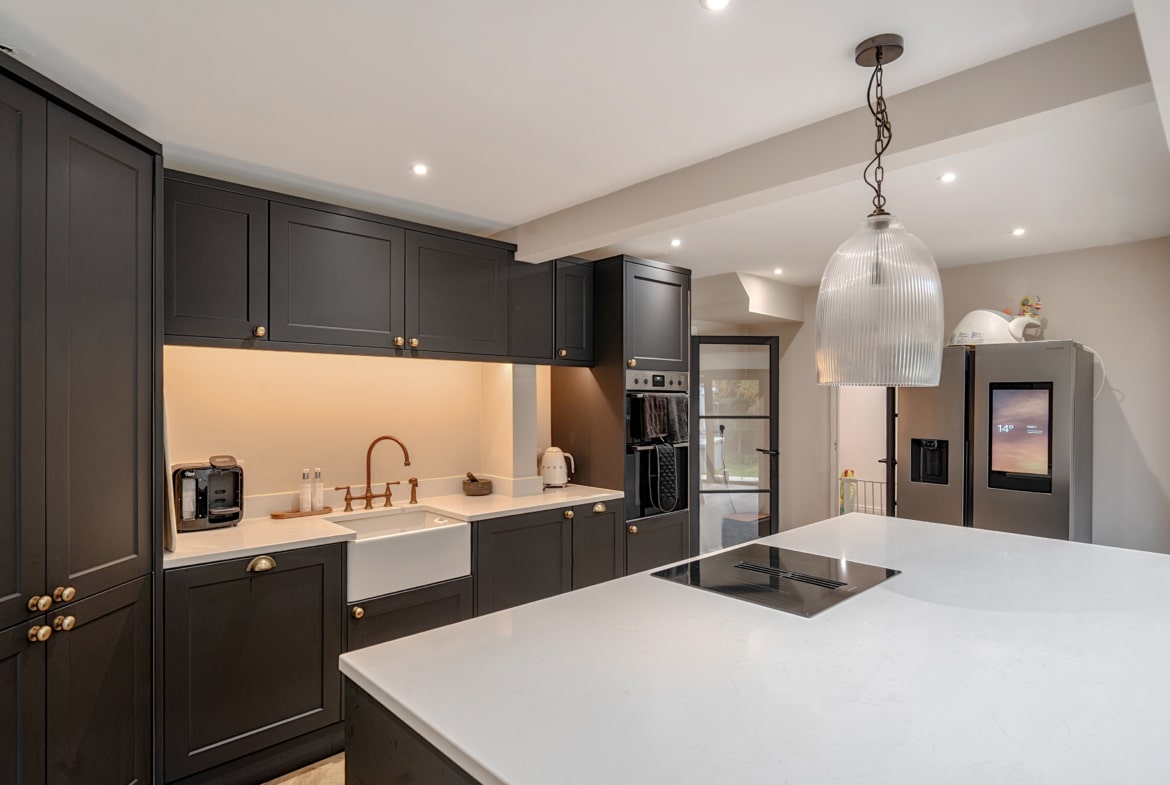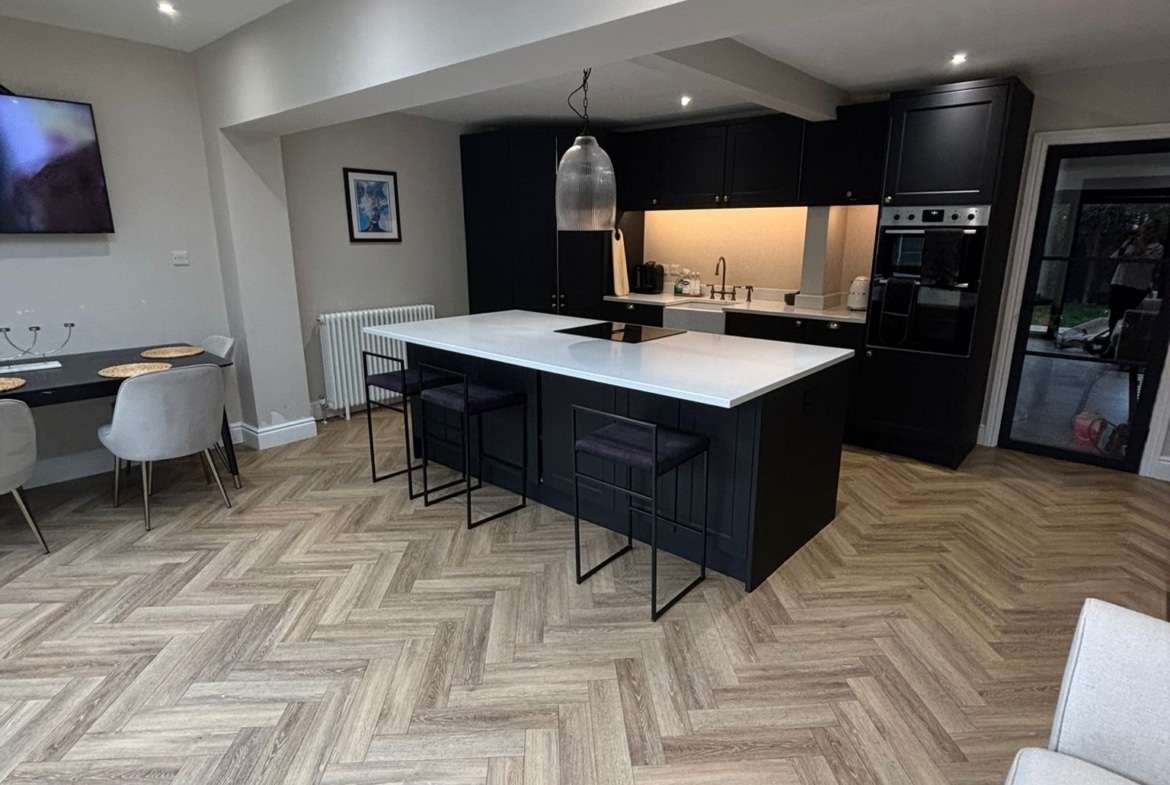 At the heart of the home lies a spectacular open-plan kitchen and dining area. With marble worktops, an integrated double oven, induction hob, and a generous walk-in larder, the space is designed for both everyday living and entertaining. Bi-folding doors open onto a beautifully landscaped rear garden, seamlessly connecting indoor and outdoor spaces.
