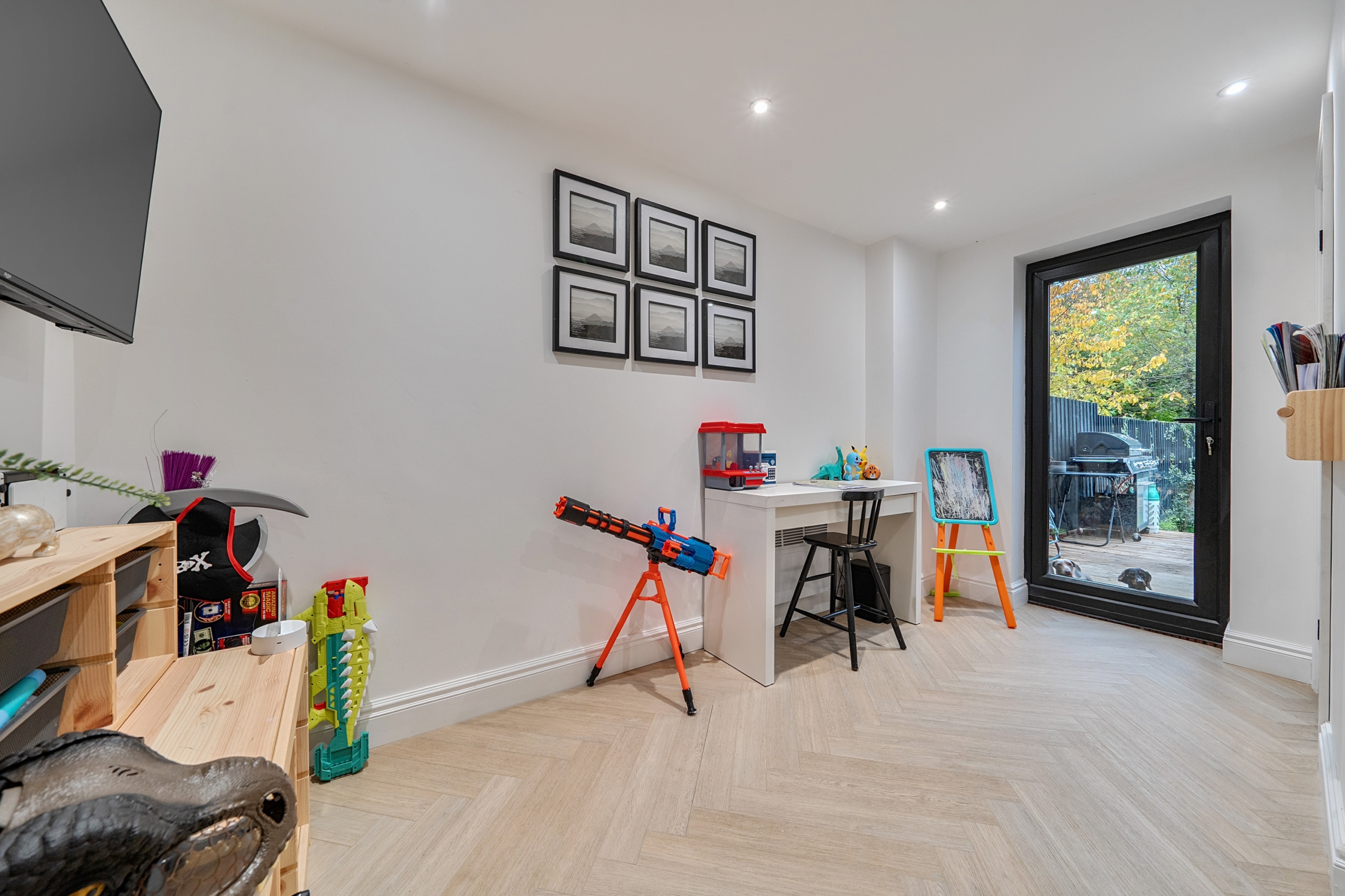 A separate playroom or home office, utility room, and downstairs WC add to the home’s flexibility and practicality, while the small garage/storage area provides additional convenience.