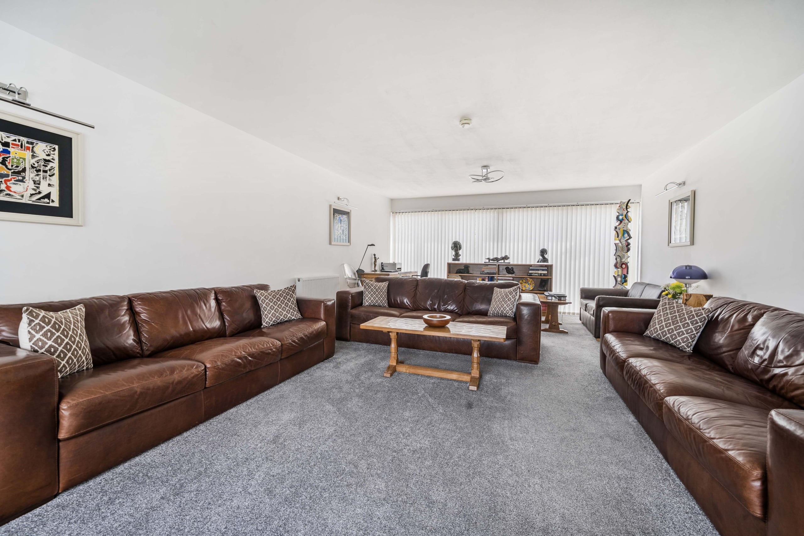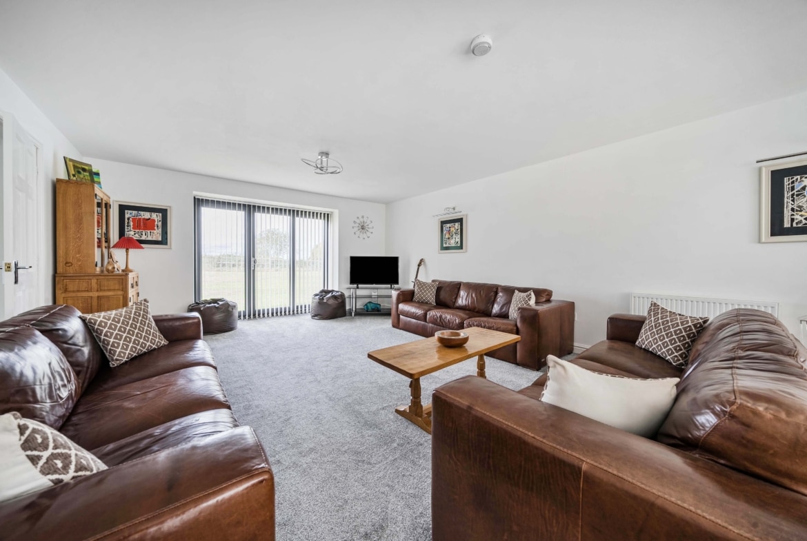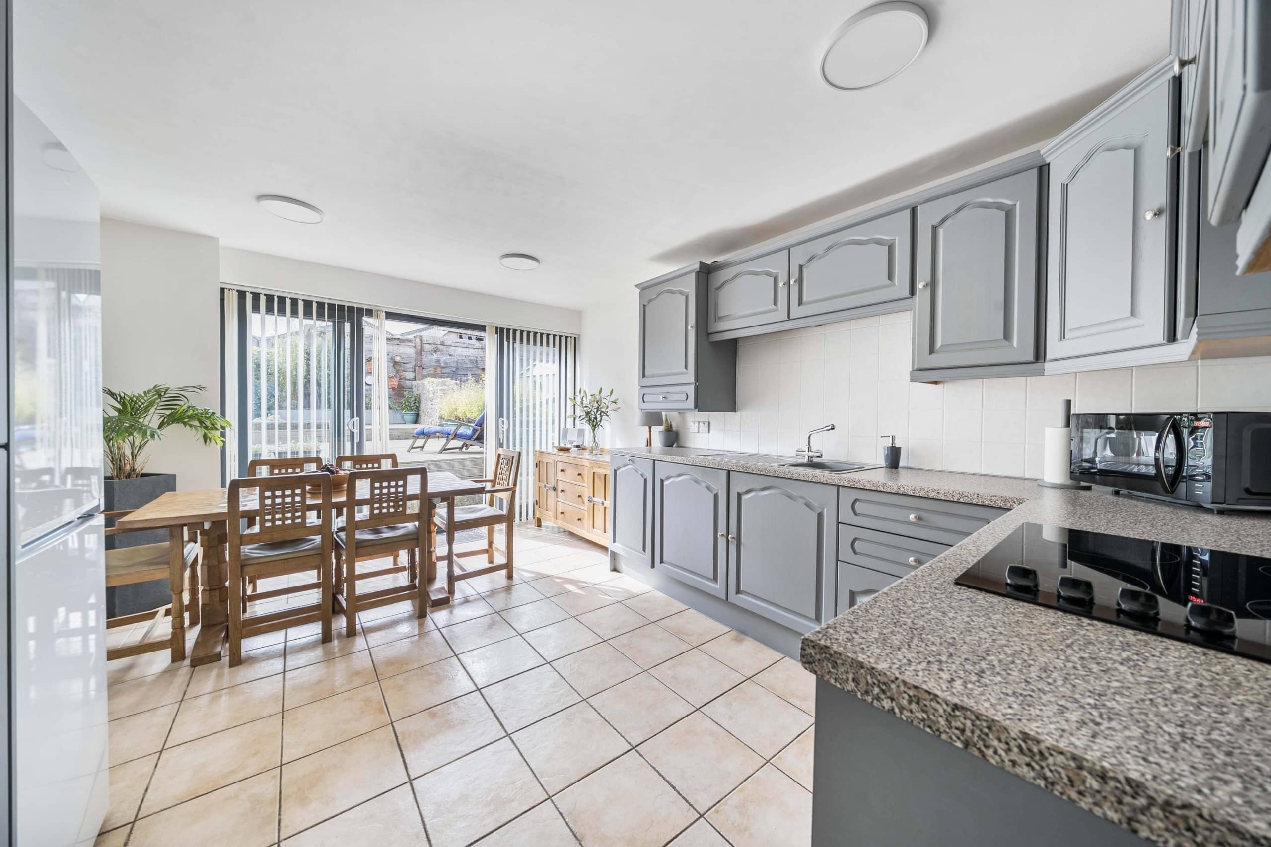 Stepping inside, a generous reception hall leads into the dual-aspect living room, an impressive space with large windows and doors opening directly onto the gardens, flooding the room with natural light. The kitchen/dining room is equally well proportioned, fitted with a range of integrated appliances, tiled flooring, and double doors to the outside – a space designed for both everyday living and social gatherings.