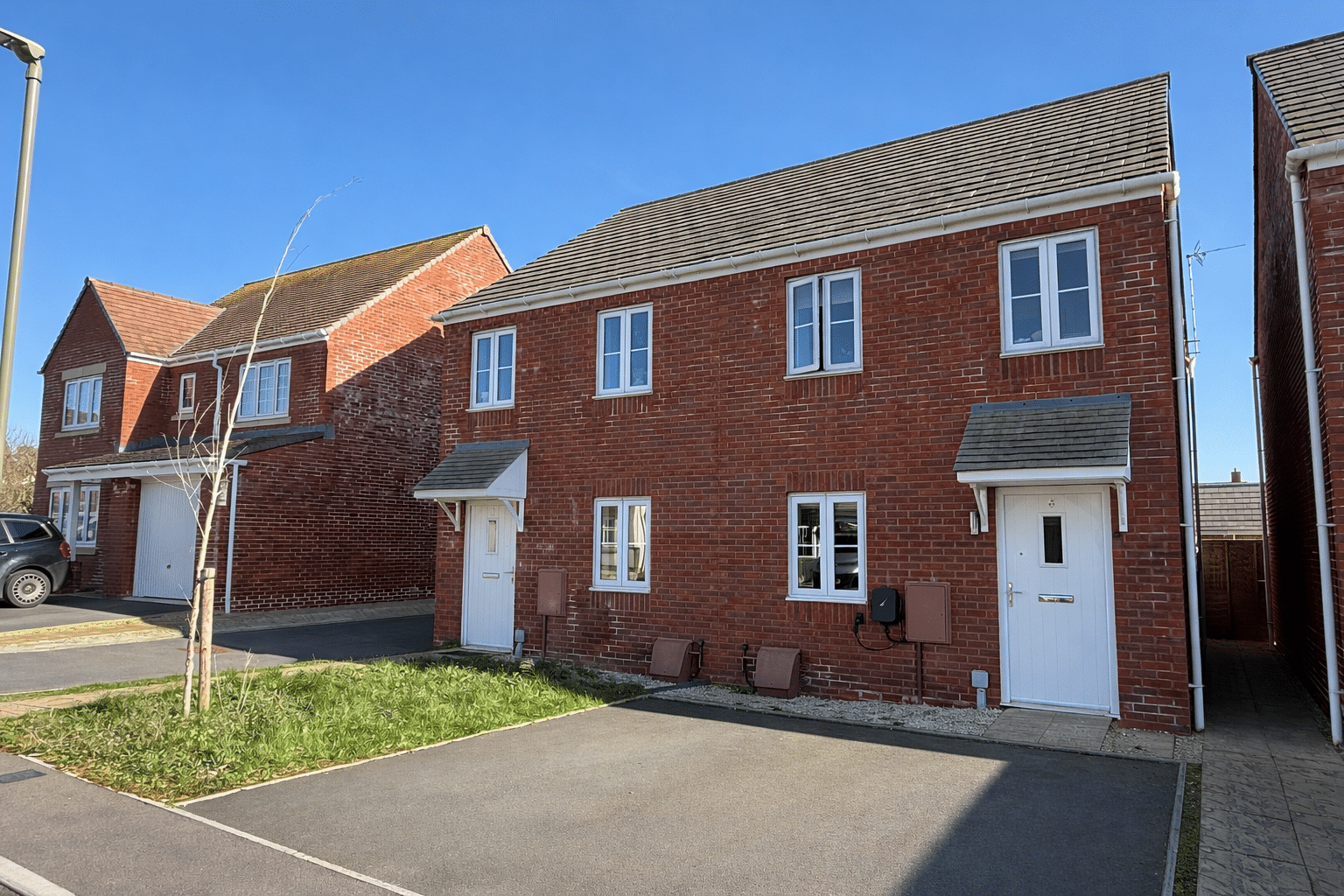 Externally, the home enjoys a private rear garden with lawn and patio seating area, offering a pleasant space for outdoor dining and relaxation. To the front, the property benefits from driveway parking and an attractive brick façade typical of this modern development.