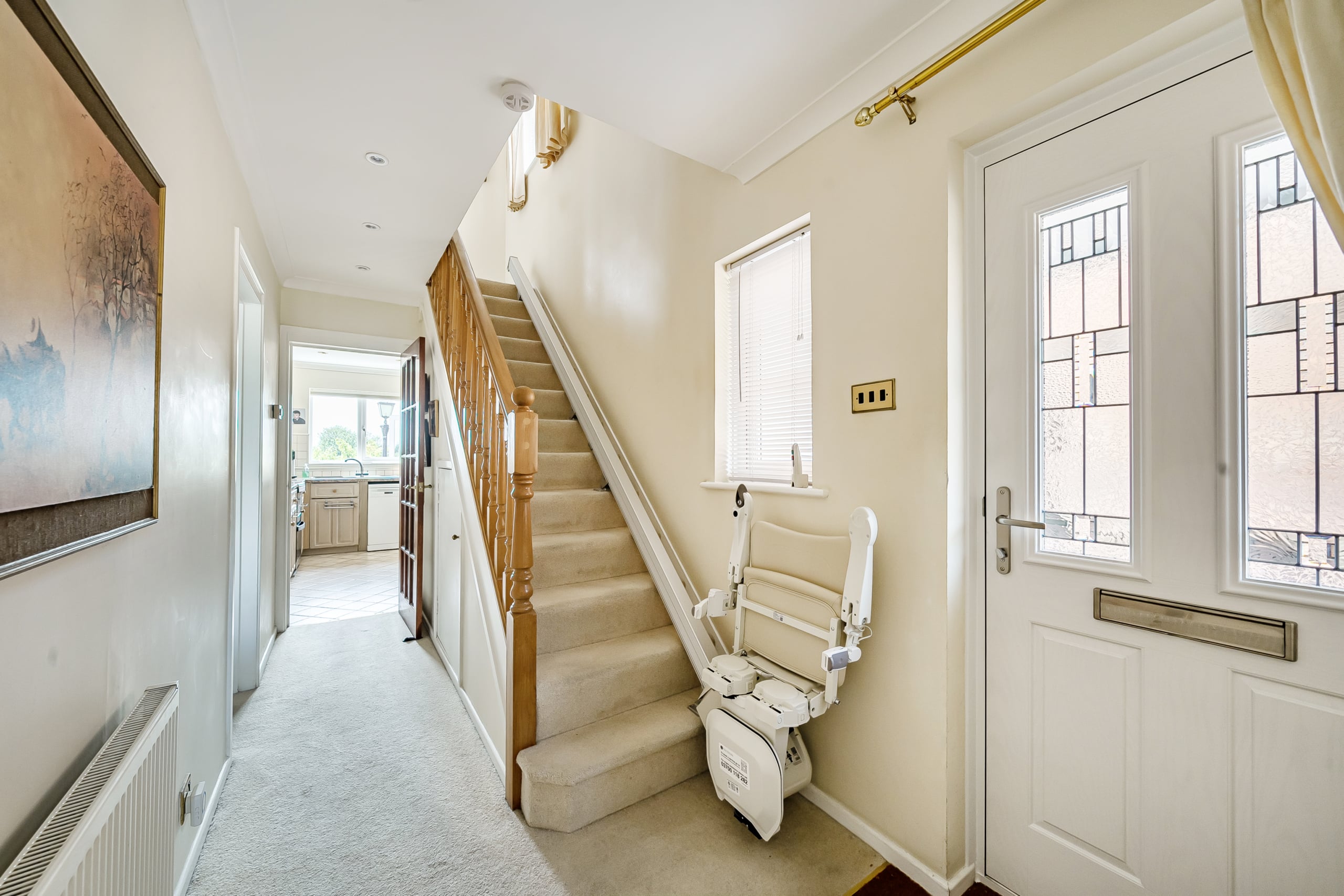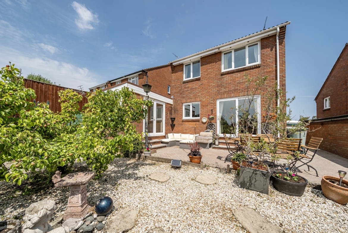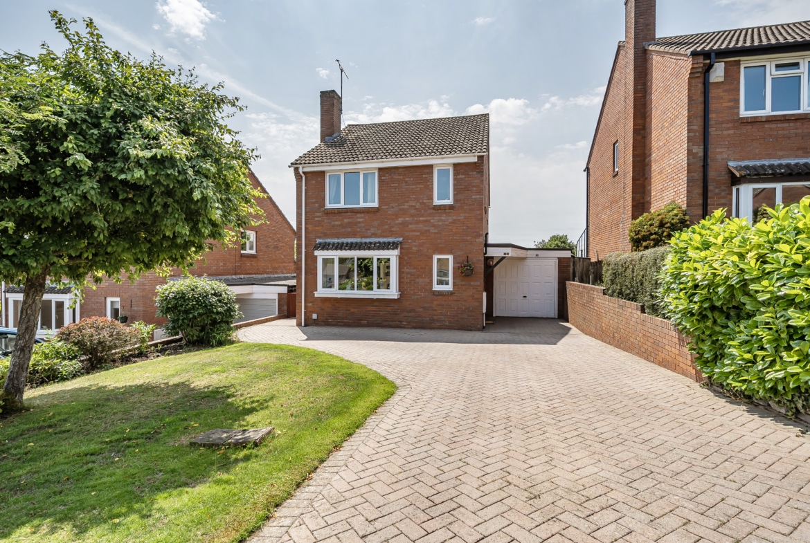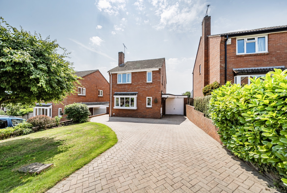 To the front, a generous block-paved driveway provides off-road parking for at least three vehicles, edged by well-maintained front garden and brick wall that enhances the home’s kerb appeal.