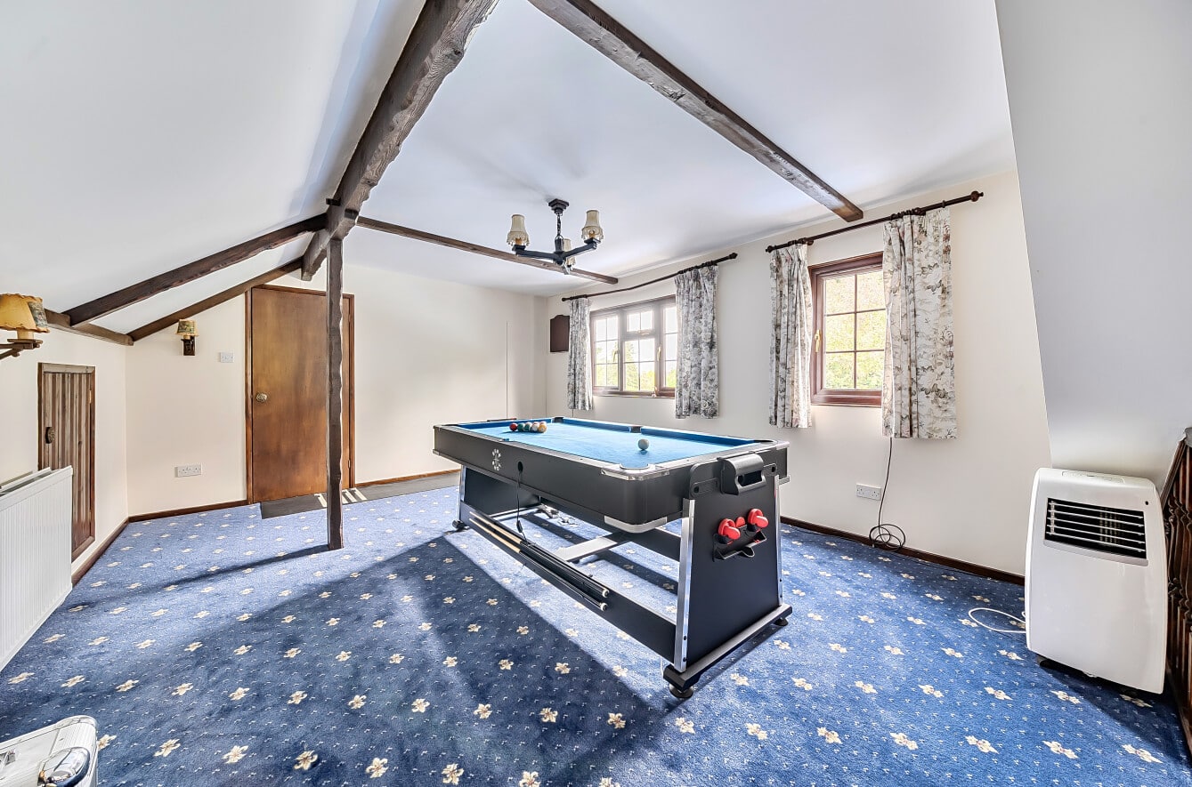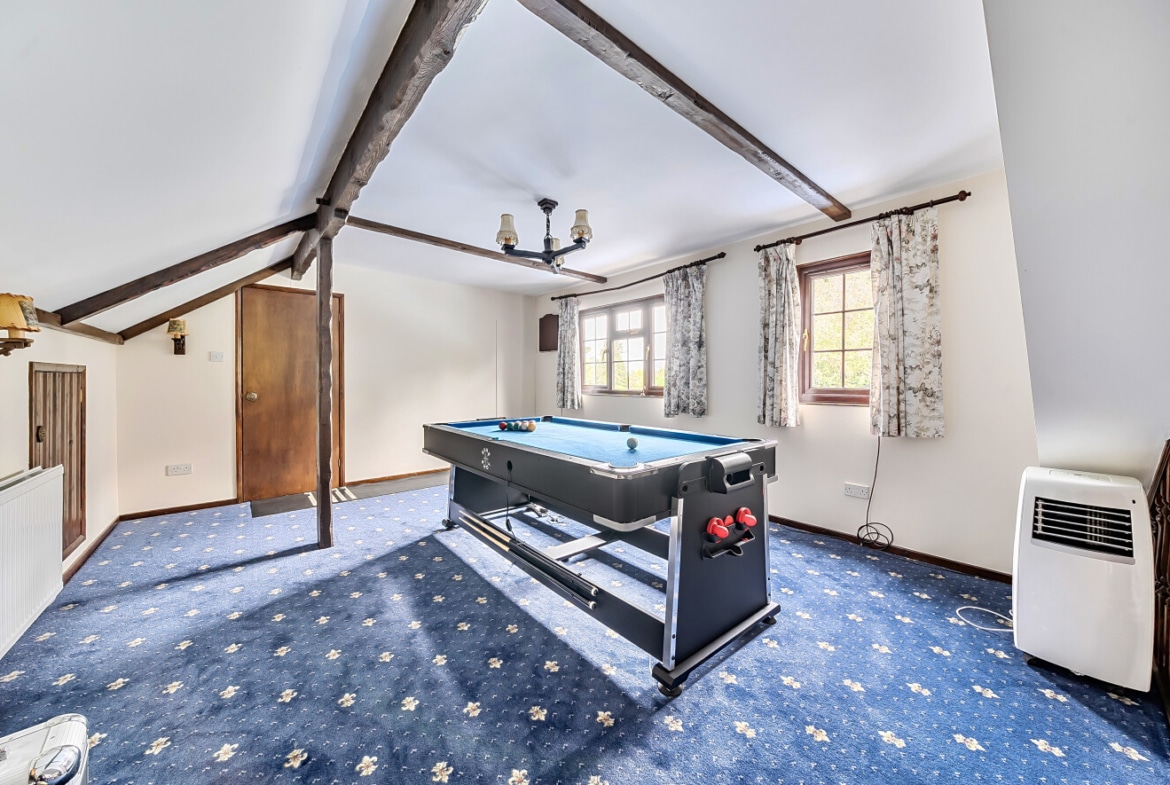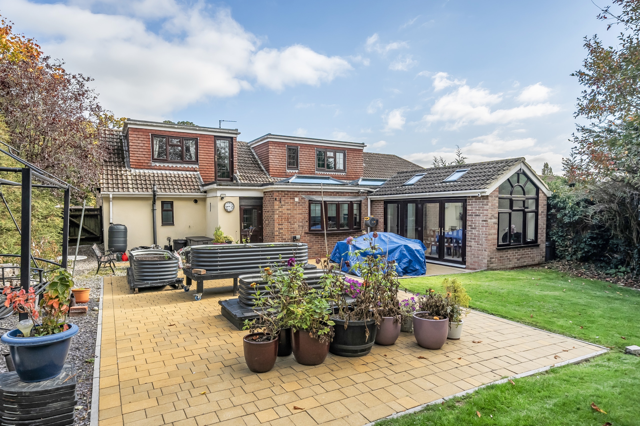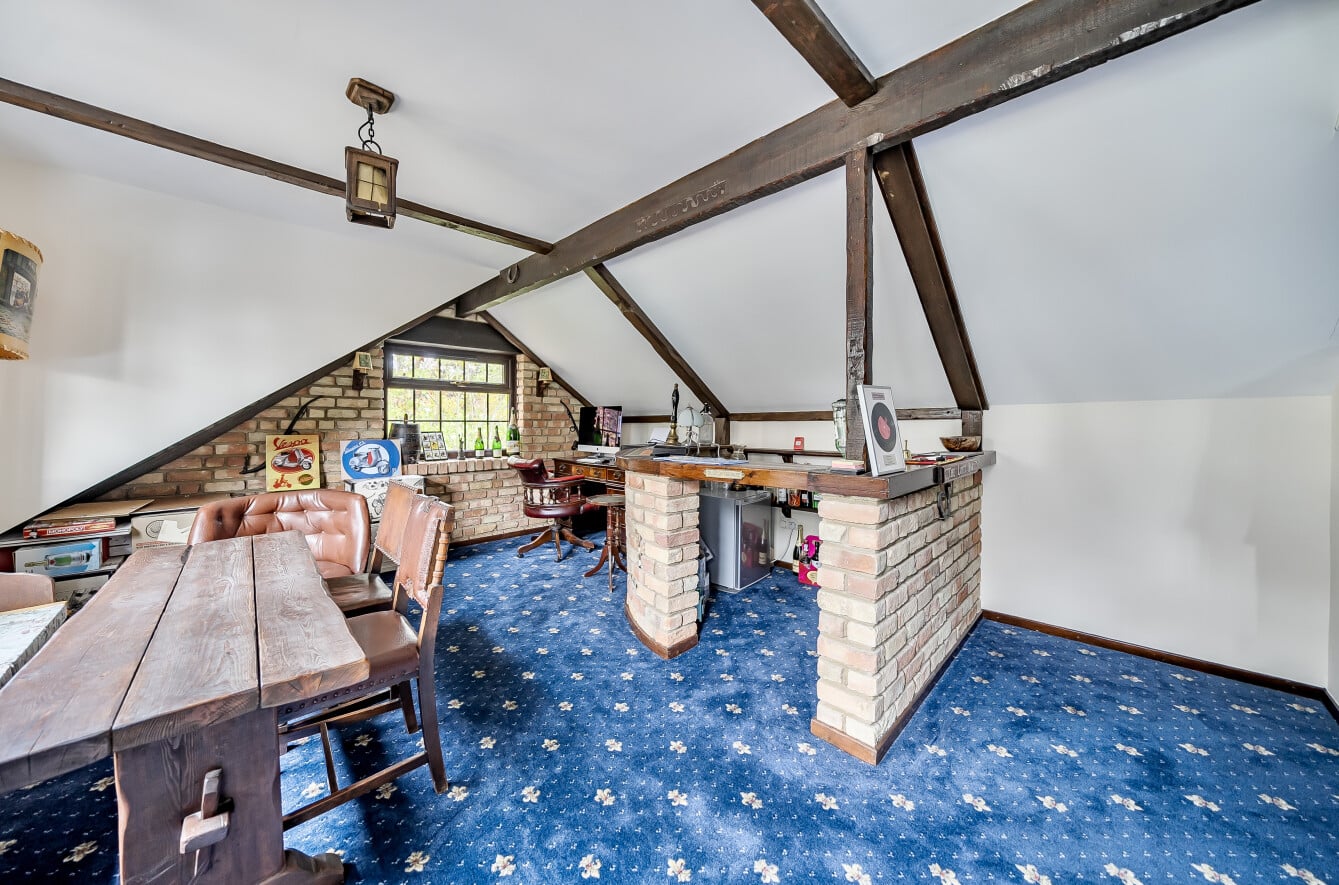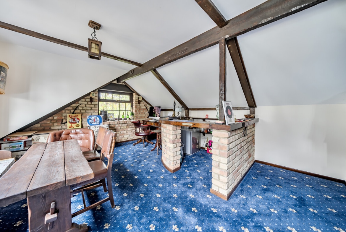 The bungalow itself offers approximately 1900sqft of well presented versatile living space, perfect for the modern family. It has been thoughtfully extended over time and now includes; Entrance Hallway, giving access to two of the double Bedrooms, Utility Room, Shower Room and Rear Lobby. Central Hall, Sitting Room with bay window, Bedroom One with Ensuite Shower, further Family Shower Room, 19′ refitted Kitchen/Breakfast Room with integrated appliances and walk-in pantry and doors leading into the Dining Room with bi-fold doors leading into the gardens. With staircase leading from the Hall up to the first floor, which is currently used as as a fantastic Games Room and Family Room, which overlook the Rear Garden, perfect for entertaining and could easily be converted to provide two further Bedrooms, subject to building regulations.
