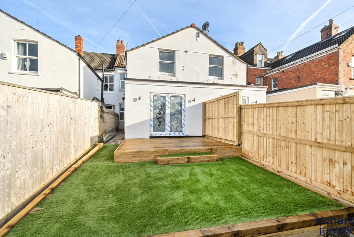 To the rear is a recently landscaped rear garden with a decked seating and barbecue area leading to an artificial lawn and a concrete hard standing offering secure gated parking.