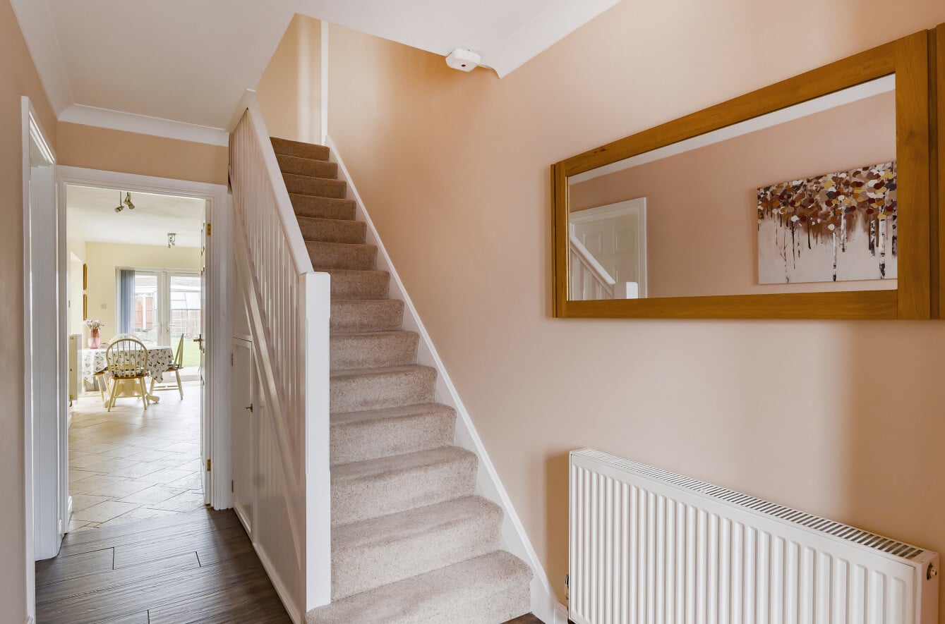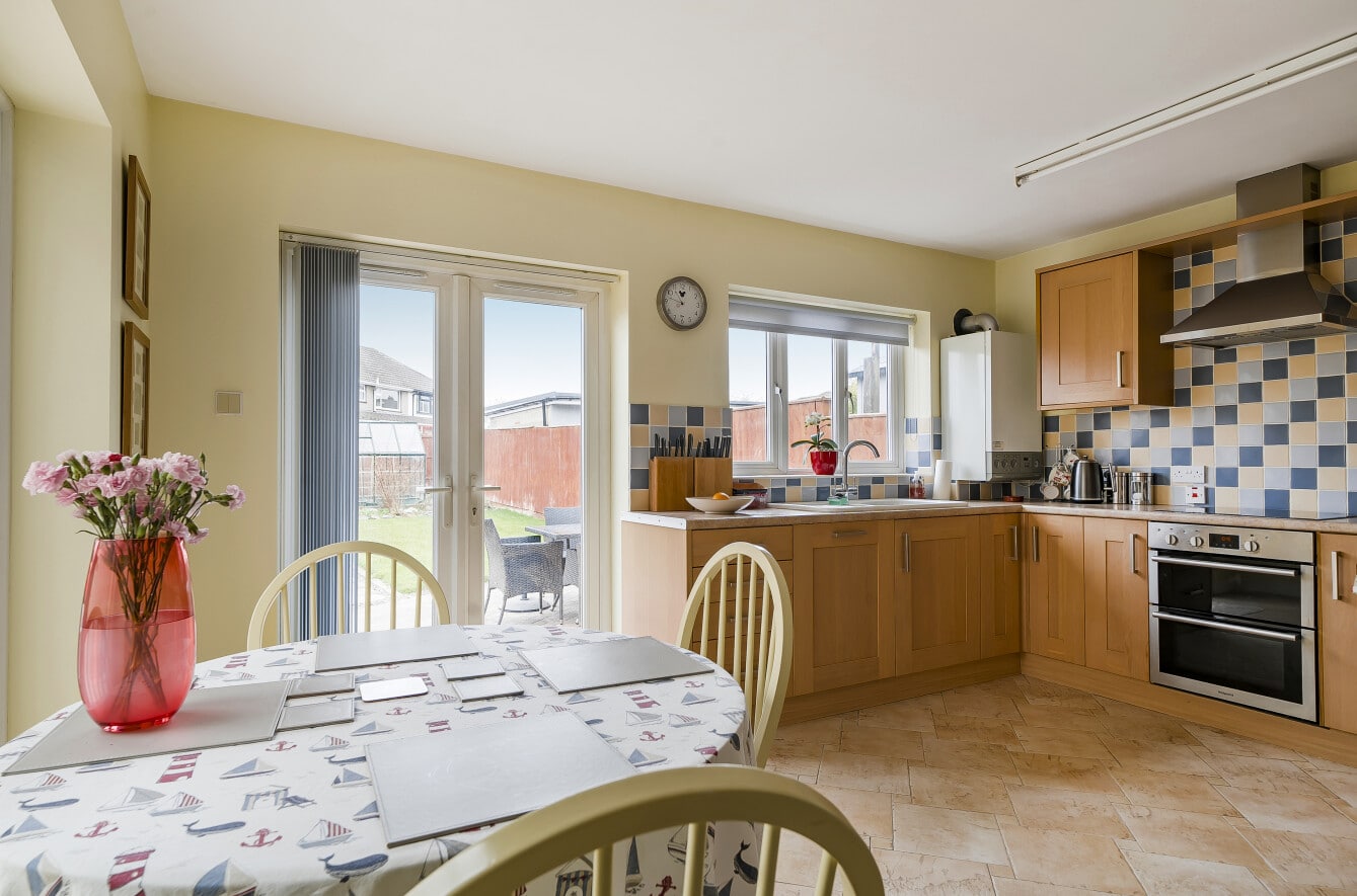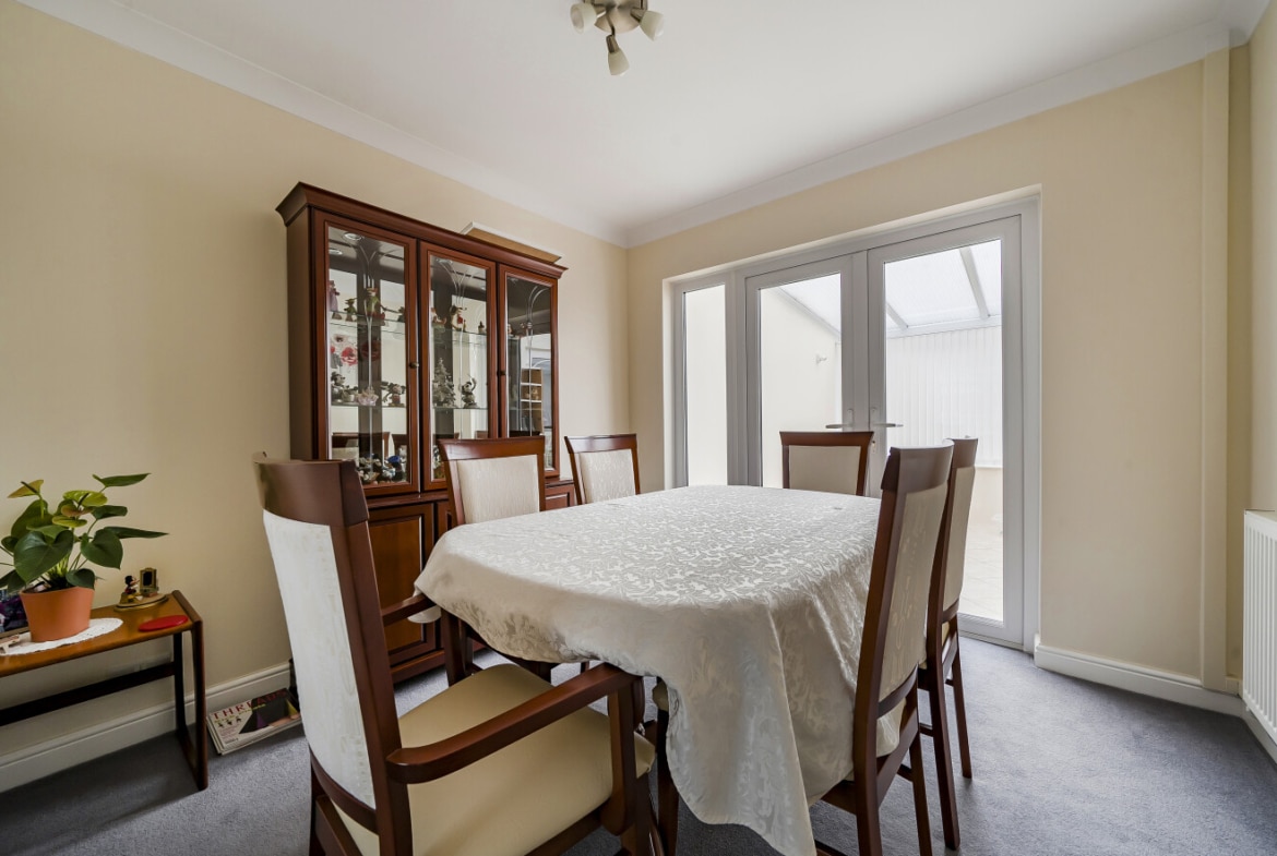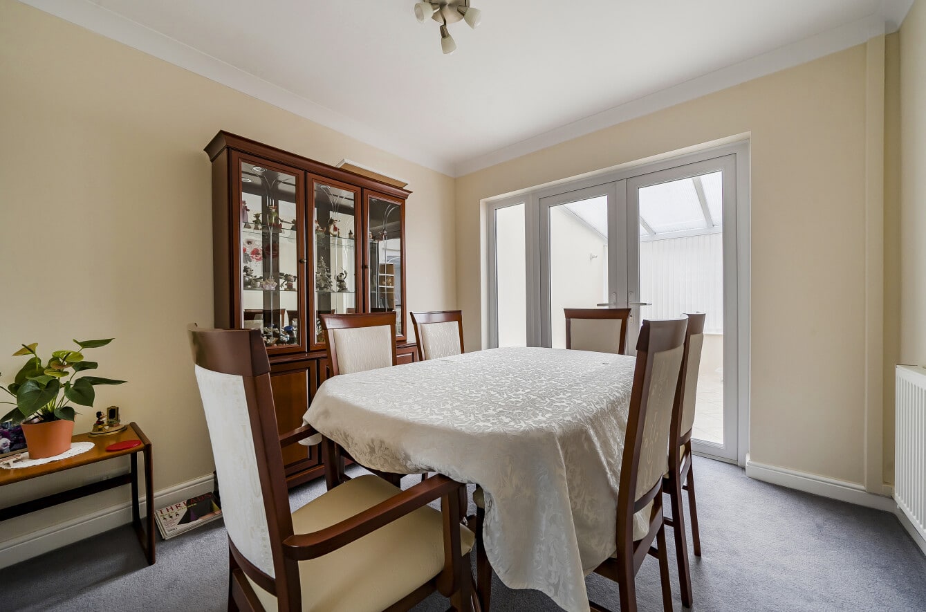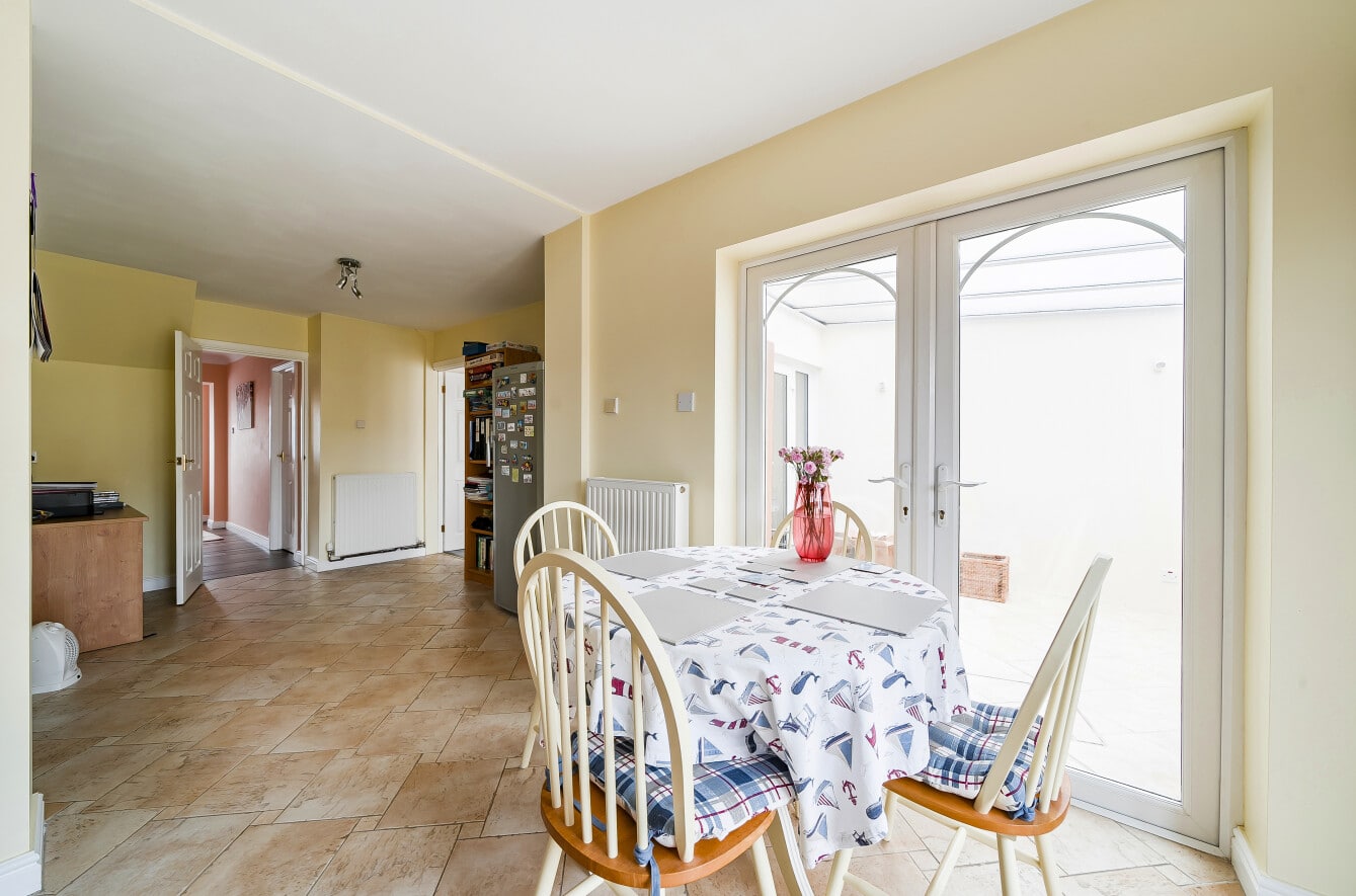 The ground floor features a large bay-fronted lounge, leading into a bright dining space. A conservatory extends from the dining room, providing additional living space. The extended kitchen offers plenty of room for cooking and entertaining, with doors into the garden. A downstairs WC, utility room, and a spacious entrance hall add to the home’s practicality.