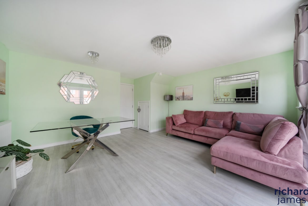 The ground floor comprises a bright and inviting living room, complete with French doors opening onto the rear garden, creating a seamless flow between indoor and outdoor space. To the front sits a contemporary kitchen/dining room, finished with sleek cabinetry and a range of integrated appliances, providing both practicality and a superb entertaining space. A downstairs cloakroom completes the ground floor.