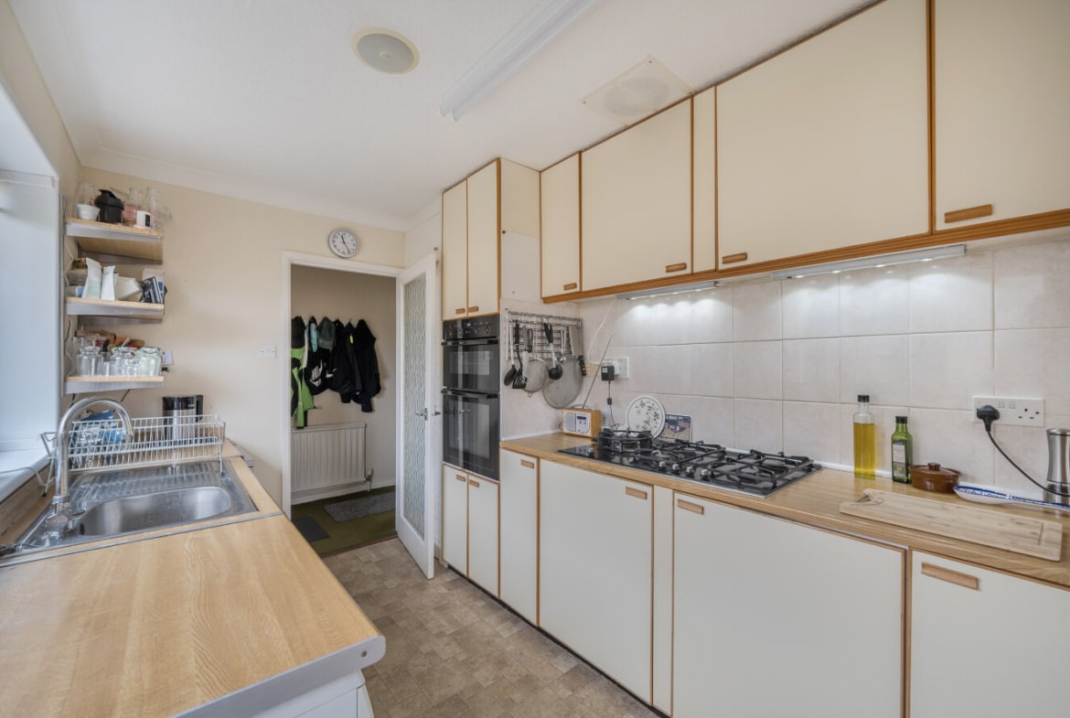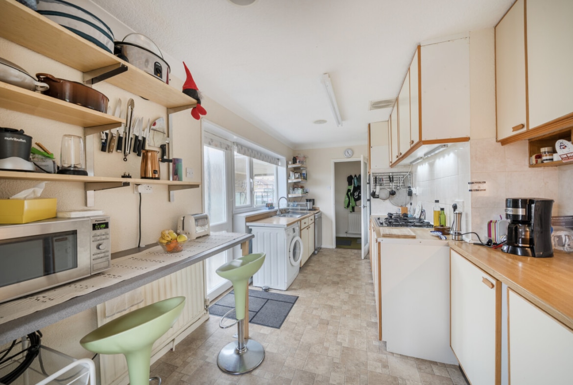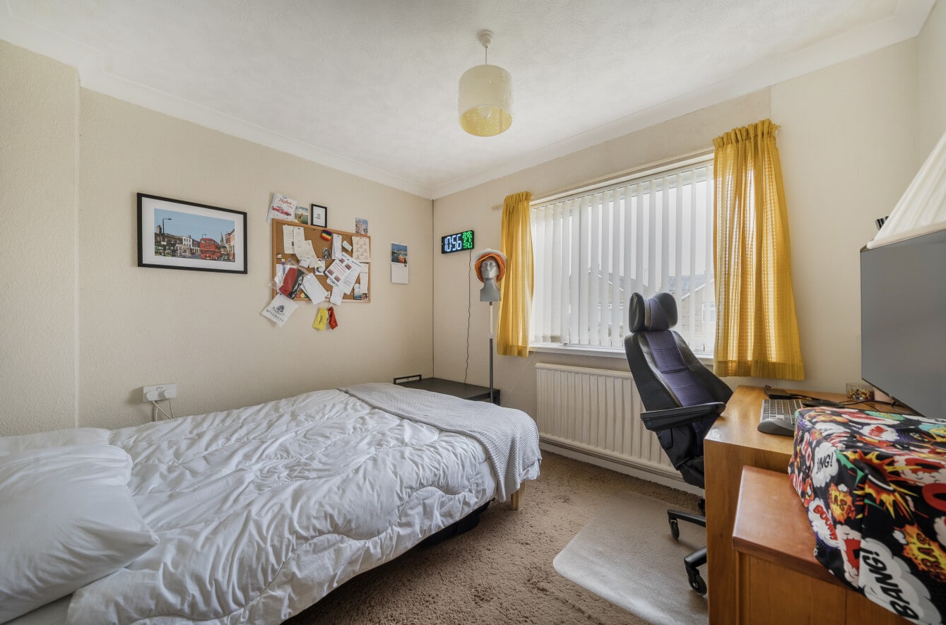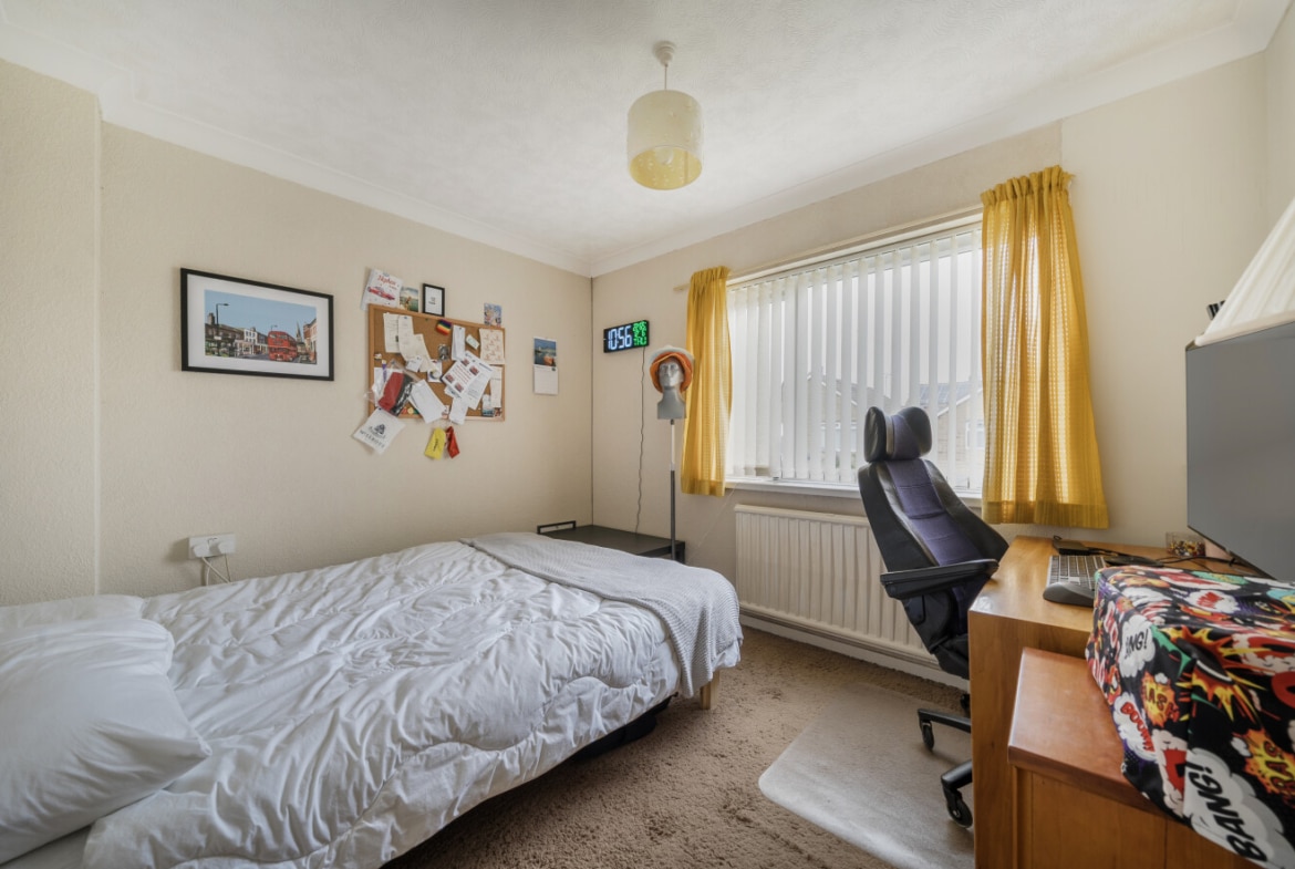 All three bedrooms are positioned at the front of the property, with the rear extended to create a larger-than-average living area and kitchen – perfect for modern family life or entertaining. The layout is versatile, with generous living space that opens onto a private garden featuring a well-kept lawn and plenty of potential for outdoor enjoyment.