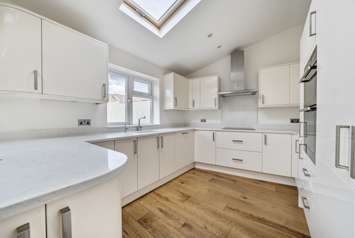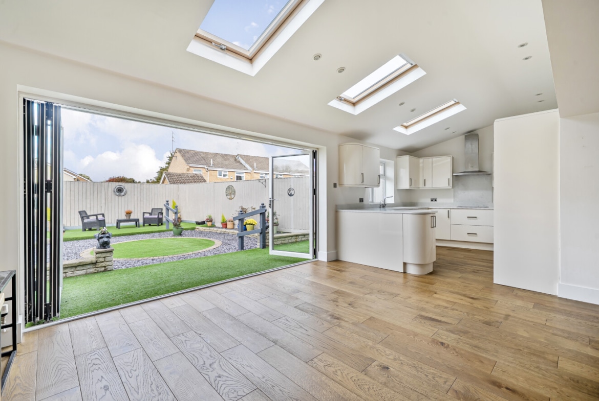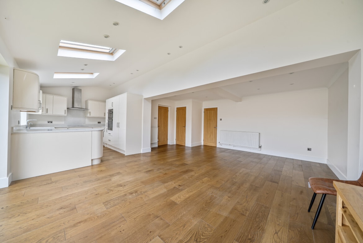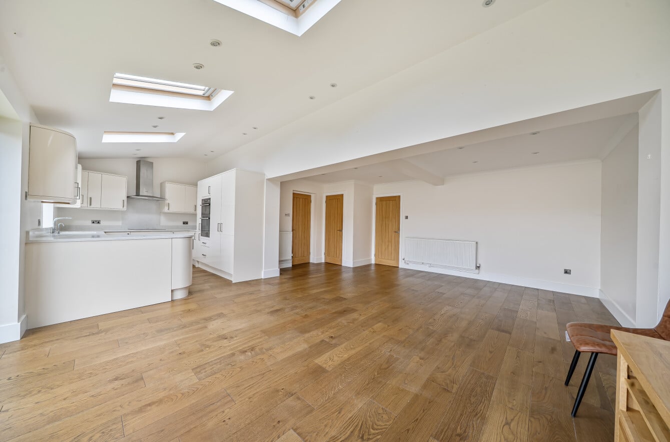 The heart of the home is the expansive open-plan kitchen and reception room — ideal for both dining and entertaining. The modern kitchen features ample storage and contemporary finishes, while the reception area boasts skylights, creating a light and airy atmosphere.