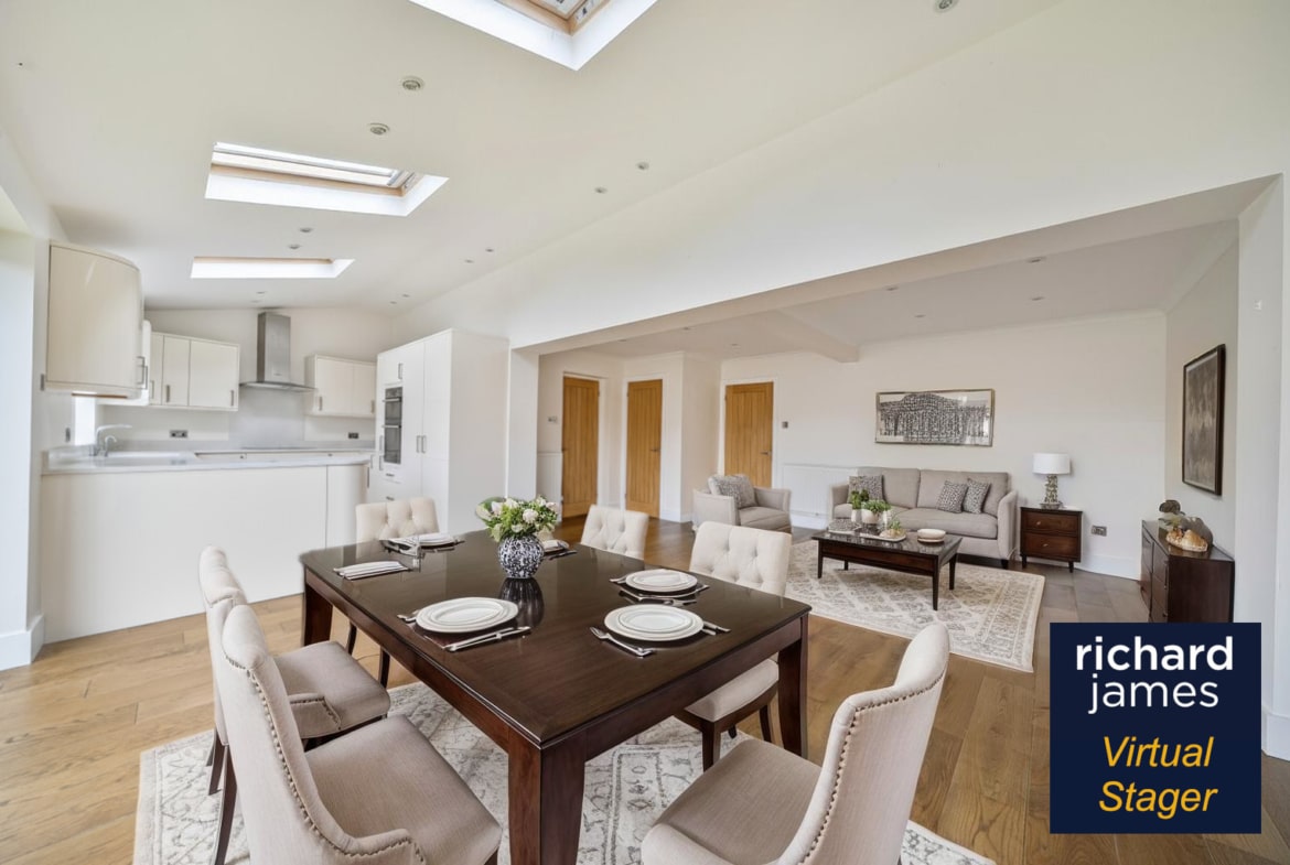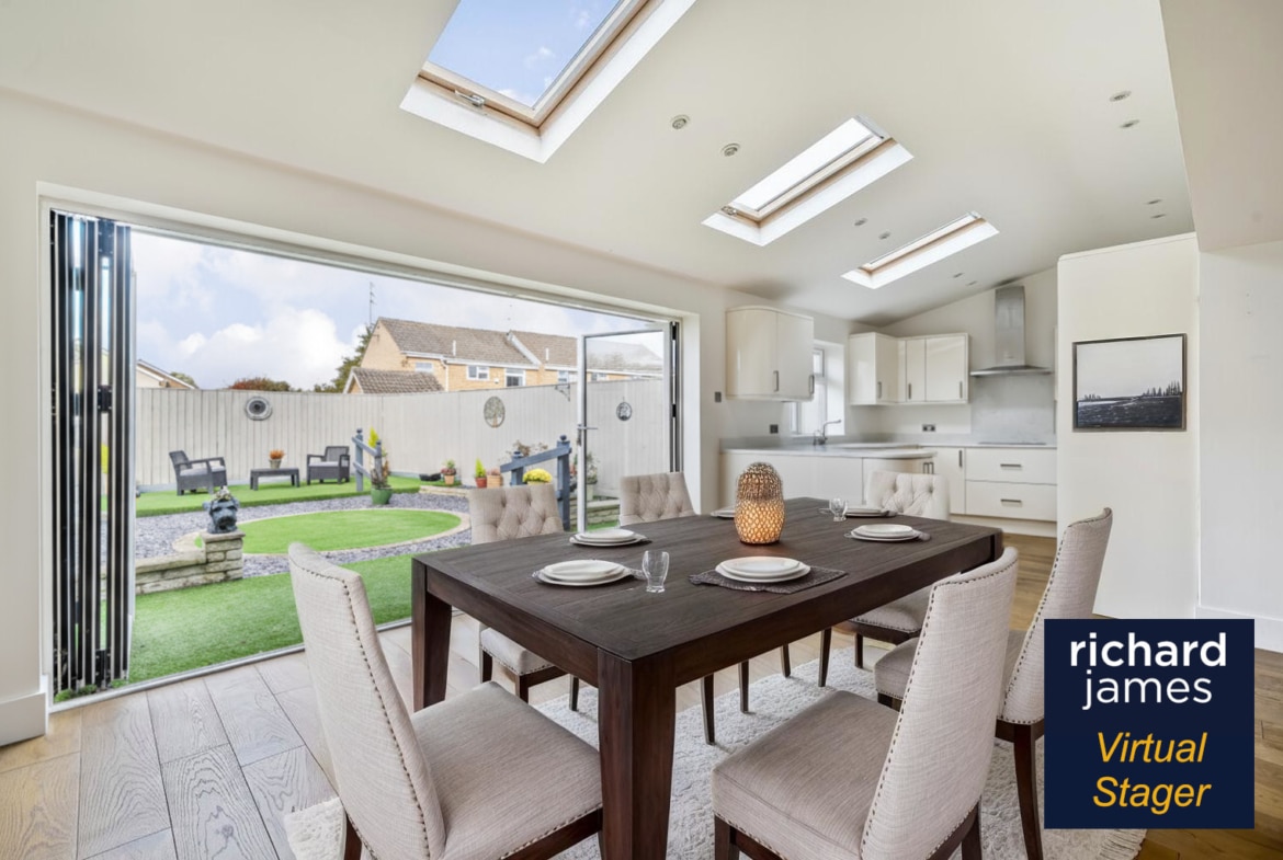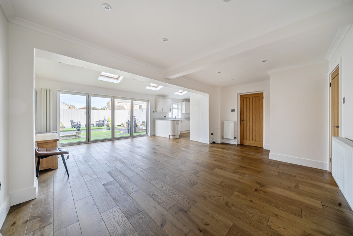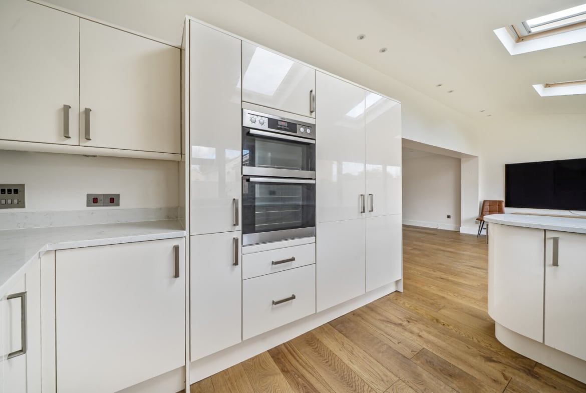 The heart of the home is the expansive open-plan kitchen and reception room — ideal for both dining and entertaining. The modern kitchen features ample storage and contemporary finishes, while the reception area boasts skylights, creating a light and airy atmosphere.