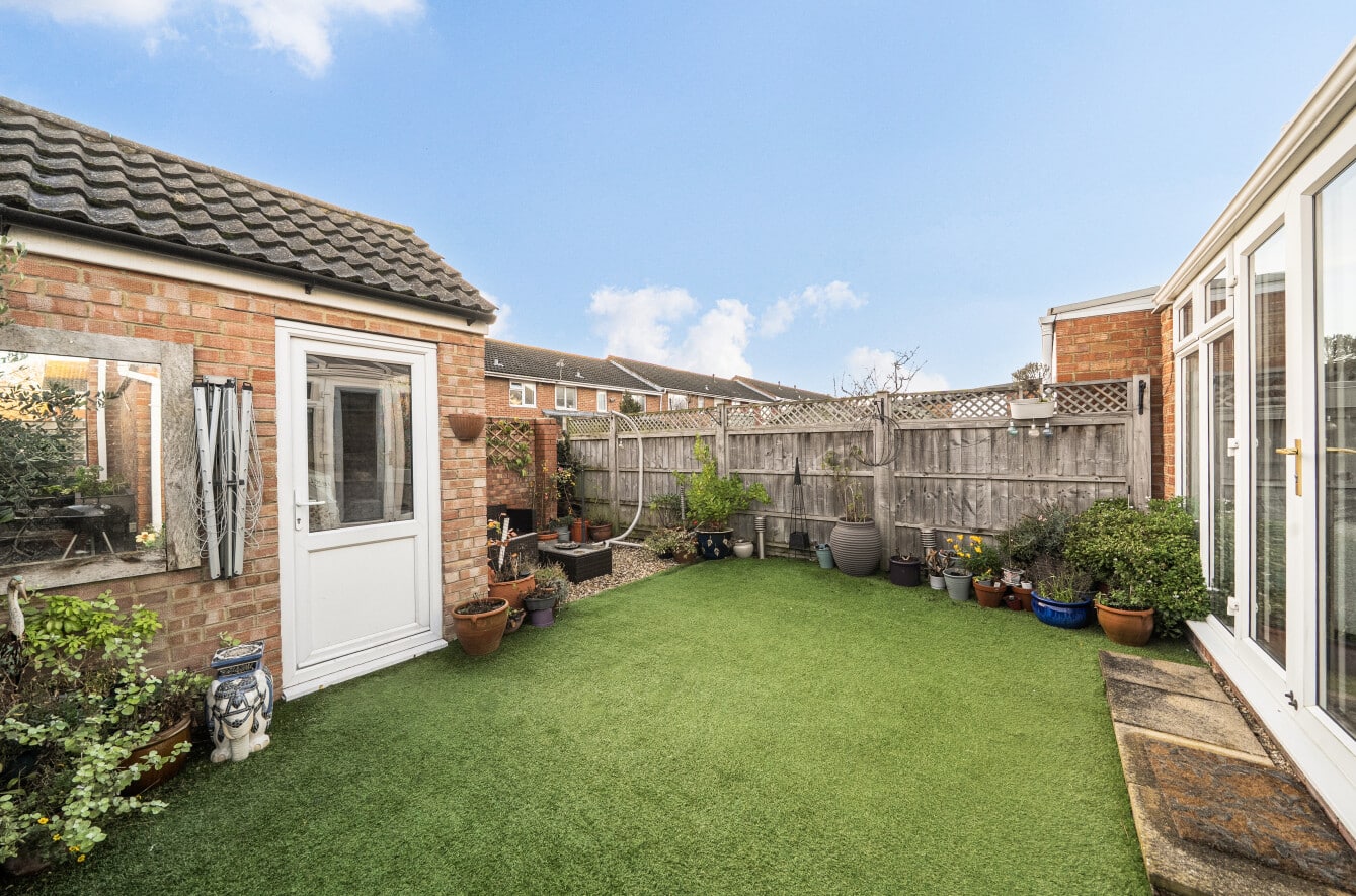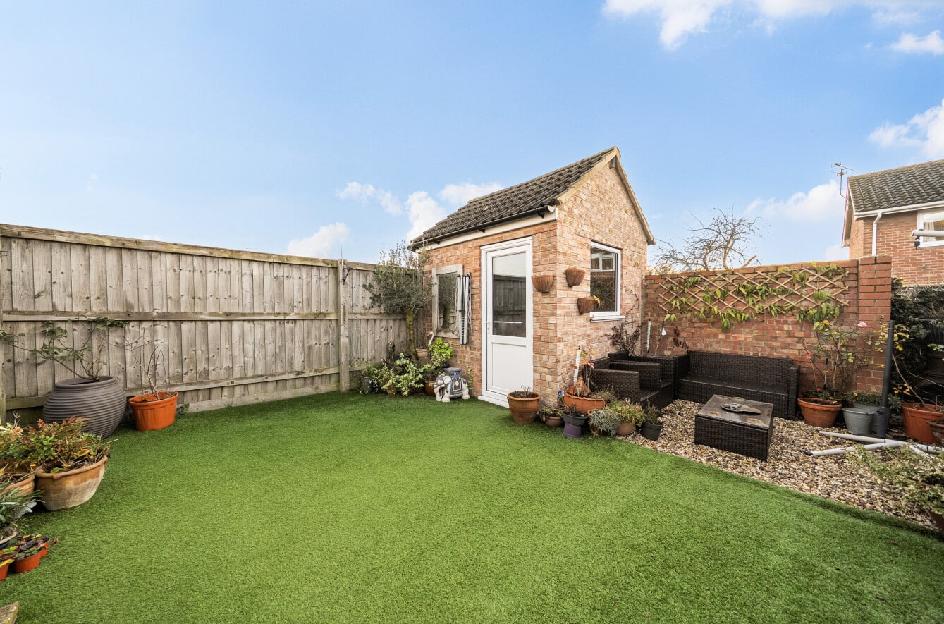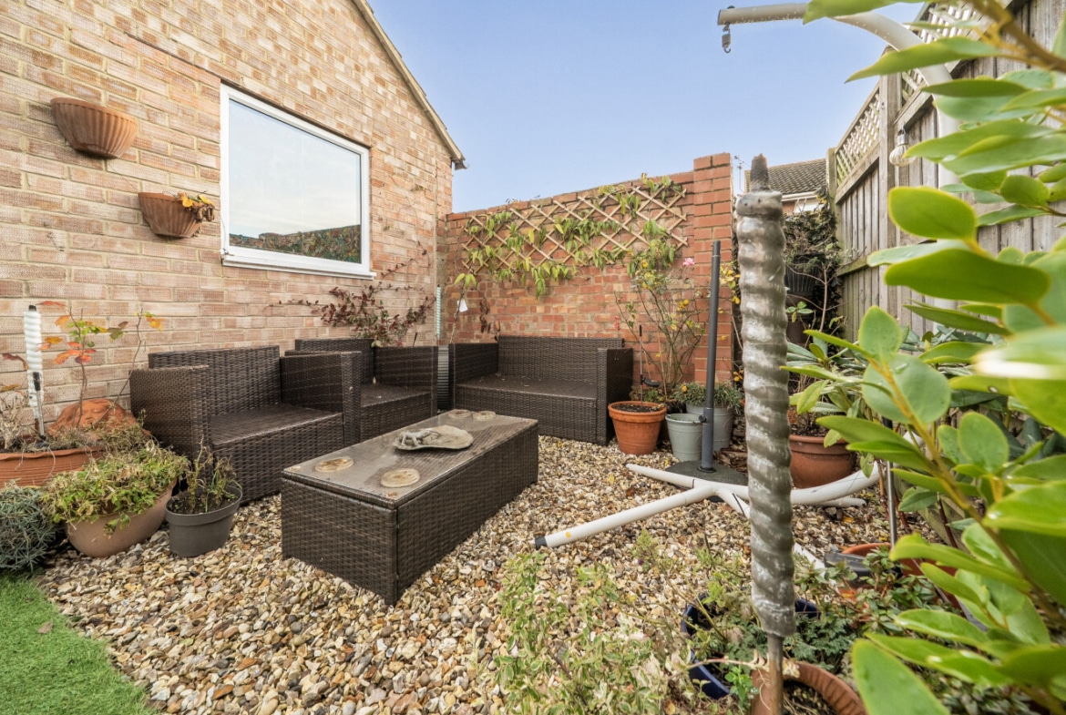 The low-maintenance rear garden offers a pleasant outdoor space and also provides access to the garage, adding further practicality.