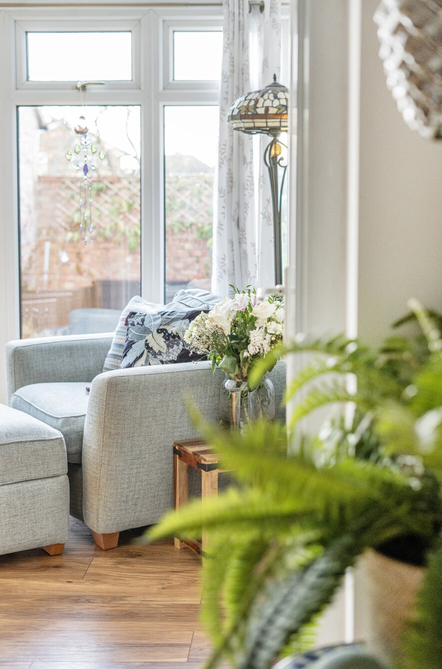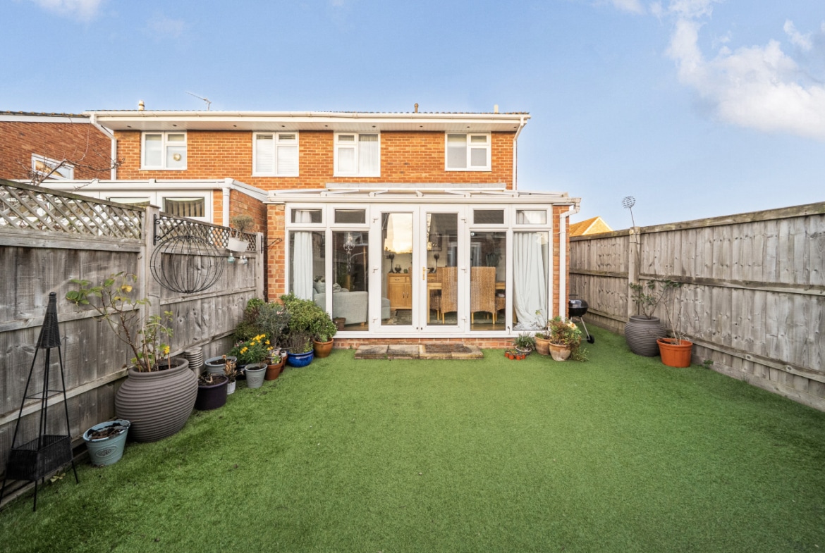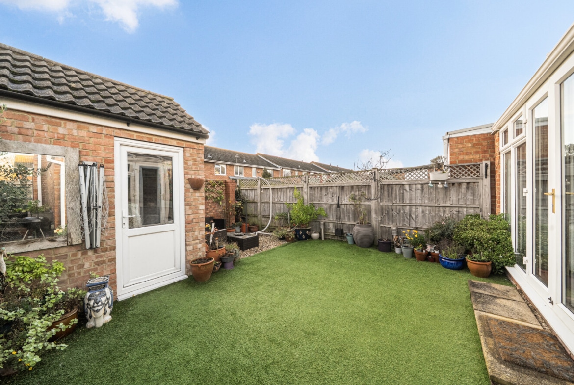 The low-maintenance rear garden offers a pleasant outdoor space and also provides access to the garage, adding further practicality.